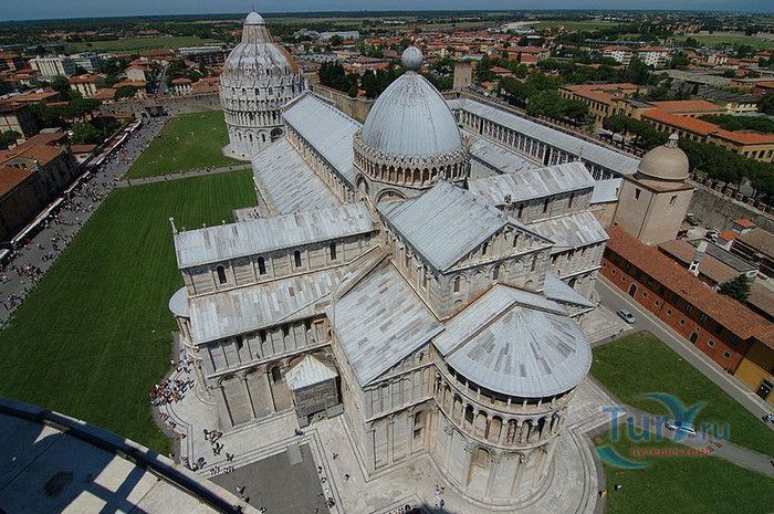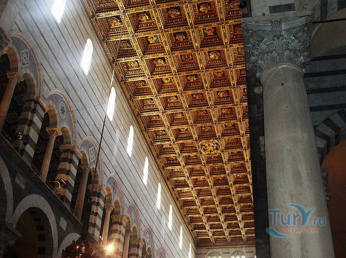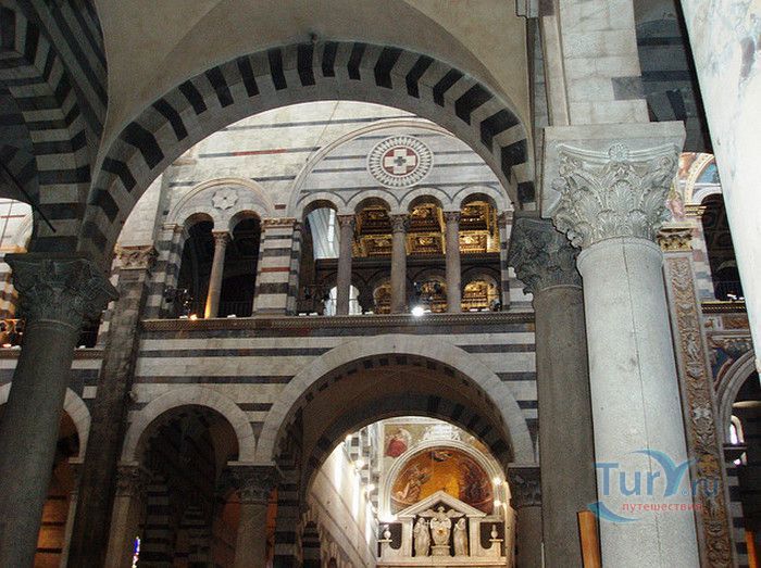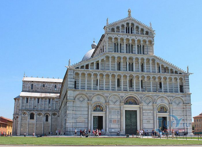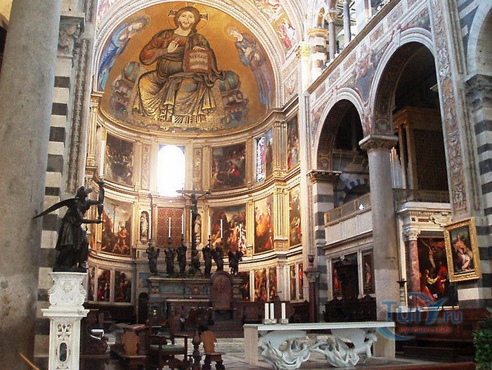 Кафедральный Собор Санта Мария Ассунта расположен в Пизе, в центре площади, которую также называют Полем Чудес. Строительство Собора было начато в 1064 году на средства, полученные от богатой добычи в ходе военной компании против мусульман в сицилийском городе Палермо. Собор должен был стать символом могущества и богатства, достигнутых морской Республикой Пиза. Торжественное освящение Собора состоялось 26 сентября 1118 года. Работами по возведению храма руководил архитектор Бускето. Изначально беломраморное здание Собора было построено в виде греческого креста с большим куполом. В настоящее время, в результате нескольких перестроек, здание приобрело форму латинского креста с пятью нефами, апсидой и трансептом, который сам делится на три нефа. Поражает богатая отделка Собора снаружи: мозаика, изделия из бронзы, ажурные стрельчатые арки. Особенно роскошен западный фасад. Три его портала украшены мраморной резьбой. Над порталами расположены четыре открытые галереи, а наверху - статуи мадонны с Младенцем и четырёх евангелистов. В оформлении интерьера использовались высокие полукруглые и стрельчатые арки, чередующиеся полосы из белого и черного мрамора, был воздвигнут необычный эллиптический купол. Между нефом и апсидой установлены колонны, привезенные из Палермо. В XVII веке был сделан потолок из позолоченного дерева, на котором есть росписи флорентийских художников и герб семьи Медичи. Свод купола украшает фреска "Богоматерь во славе со святыми", написанная в начале XVII века пизанскими мастерами Орацио и Джироламо Риминальди. На стене главной апсиды есть мозаика "Христос во славе с Богоматерью и святым Иоанном Богословом", которая чудом уцелела во время пожара 1595 года. Кафедра Собора была создана Джованни Пизано в начале XIV века, каждая из её сторон содержит рельефную композицию, рассказывающую об эпизоде из жизни Христа. Она была установлена вместо кафедры работы Гульельмо, созданной им в начале XII века. Кафедру, расположенную у алтаря, украшают 27 эпизодов из Священной истории. В Соборе хранится множество ценных предметов и реликвий, в том числе большая дароносица, расположенная у алтаря капеллы Святейшего Таинства, икона XIII века "Богоматерь с младенцем" работы Берлингьери, мощи святого Райнерия и остатки могилы императора Священной Римской империи Генриха VII Люксембургского. Ежегодно Кафедральный Собор Санта Мария Ассунта посещают тысячи верующих и туристов.
