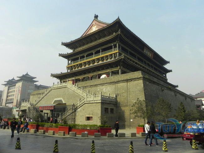 Барабанная Башня в Сиане - самая крупная из ныне существующих барабанных башен в Китае. В Древнем Китае барабаны и колокола использовались для того, чтобы сигнализировать о ходе времени, а при чрезвычайных ситуациях - в качестве тревожного сигнала. В 1380 году во время правления императора Чжу Юаньчжана династии Мин (1368-1644) была построена двухэтажная Башня высотой 34 метра. На вершине Башни был установлен гигантский барабан для того, чтобы звук его долетал и в отдаленные участки города, площадь которого была достаточно большой - около 9 кв. км. Пройдя через многие годы и много повидав на своем веку, гигантский барабан уже не занимает своего законного места, сейчас о нем напоминает только название величественно стоящей на своем месте башни - «Барабанная». Вместе с Колокольной башней, построенной на четыре года позже, они составляли гармоничный архитектурный ансамбль. Колокол возвещал о наступлении утра, а в барабан били на закате и до ночи каждый час. Среди местных жителей башни известны как «родственные здания» или «Утренний колокол и темный барабан». Архитектура Барабанной башни схожа с архитектурой Колокольной. Она также состоит из прямоугольного фундамента и многоярусной крыши. Её ширина равна 53 метрам с востока на запад и 38 метрам с севера на юг. В центре северных и южных стен находятся арочные дверные проемы по ширине и высоте равные 6 метрам. На северной и южной стороне башни расположены двадцать четыре барабана. Эти барабаны обозначают двадцать четыре солнечных периода и являются своего рода погодным календарем, созданным древними китайскими мудрецами, чтобы вести сельскохозяйственную деятельность. Башня имеет более чем 630-летнею историю: она была дважды отремонтирована - в 1699 и 1740 годах эпохи династии Цин (1644-1911 гг.). В 90-е годы XX века была произведена капительная реконструкция и на нее водрузили новый барабан, покрытый цельным куском воловьей кожи, созданный по образу установленного здесь в древности. В настоящее время это самый большой барабан в Китае. Кроме того, Барабанная Башня имеет также некоторые инновационные введения. В здании Башни не имеется ни одного железного гвоздя. В настоящее время Барабанная Башня открыта для посетителей. Каждый желающий может полюбоваться барабанами, возраст которых составляет более 1000 лет; послушать и посмотреть великолепное барабанное костюмированное шоу; ударить три раза в огромный старинный барабан, который висит у самого входа, а поднявшись на второй этаж, увидеть панораму центра Сианя.