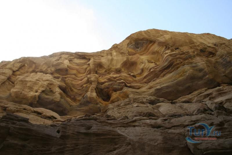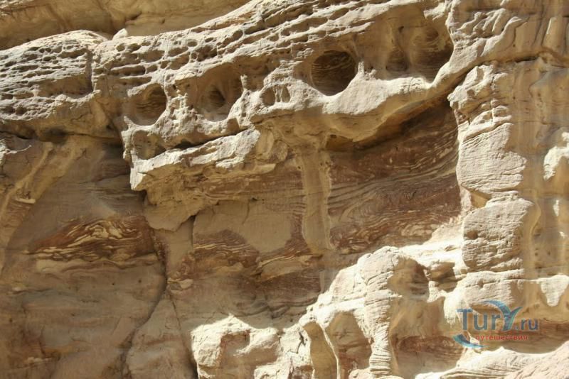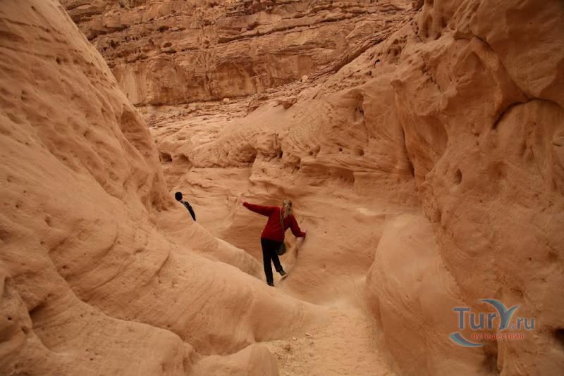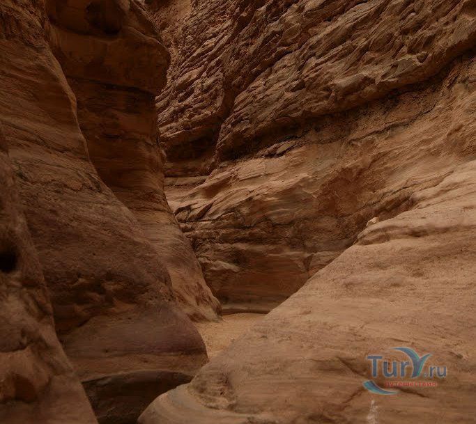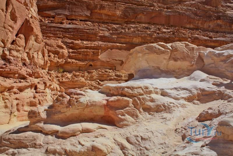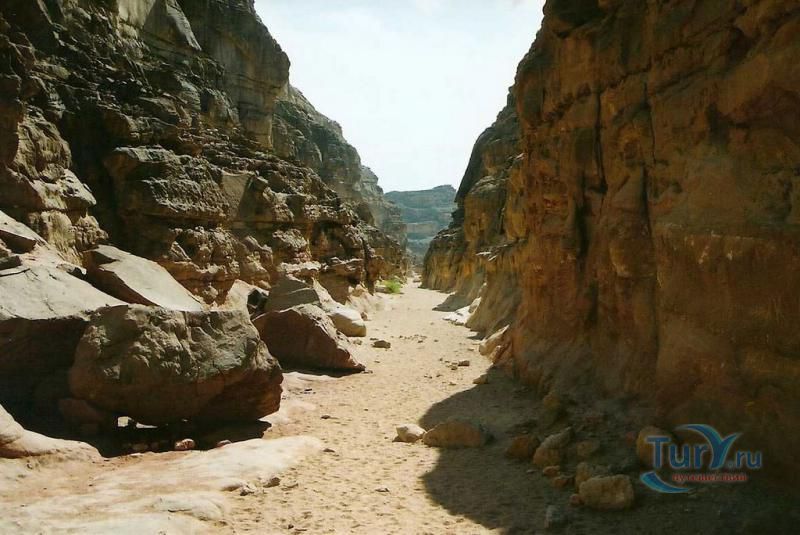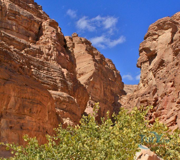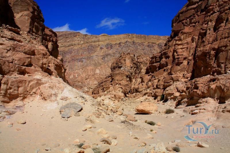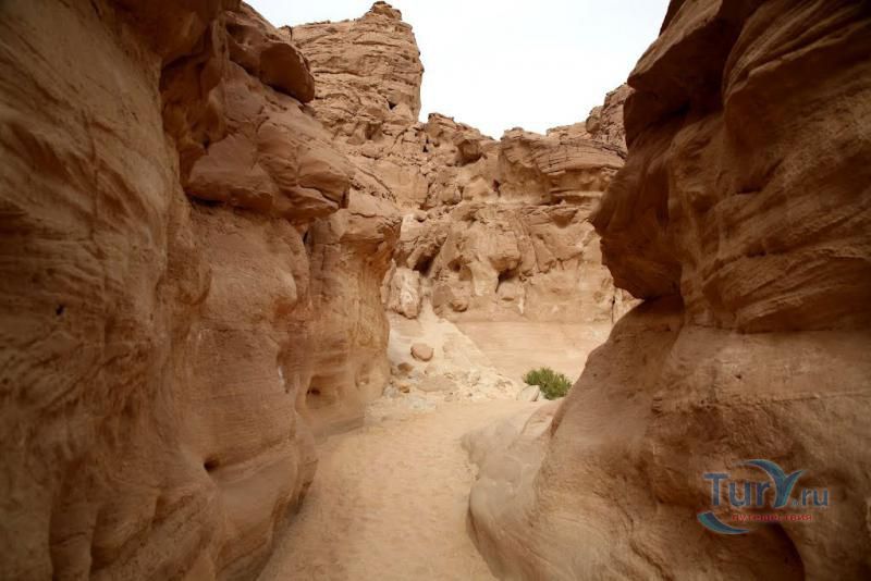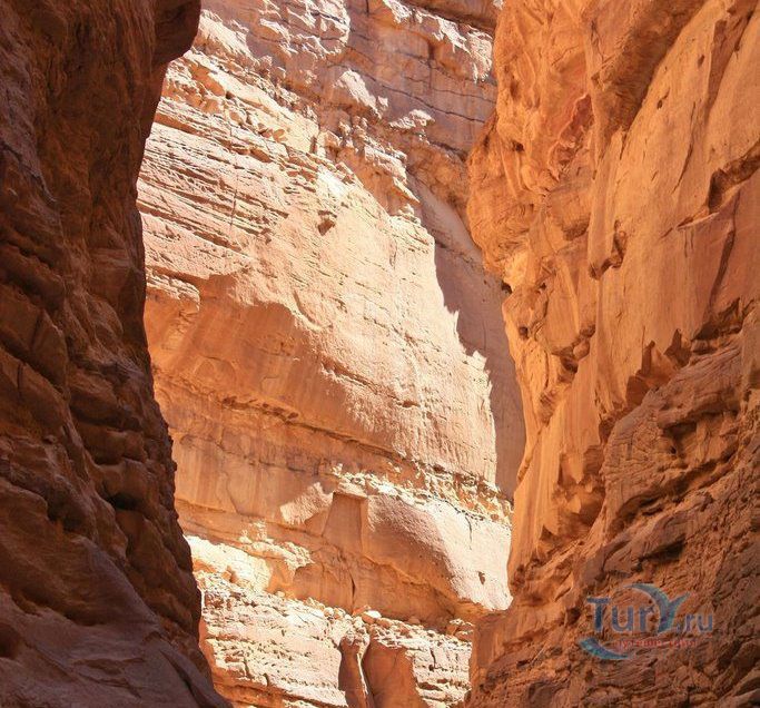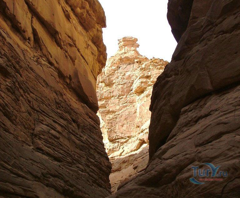 Цветной Каньон - очень необычное, интересное и увлекательное место, которое находится на Синайском полуострове. Его название говорит само за себя. Благодаря примесям оксида железа и марганца скалы каньона имеют самую живую раскраску: белую, желтую, розовую, зеленую, оранжевую, бордовую, красную, фиолетовую. Окраска скал в некоторых местах очень яркая с призматическим металлическим блеском; в других местах цвет камня очень мягкий и нежный. Сложно поверить, что миллионы лет назад на этом участке Синайских гор было море. Природная катастрофа внесла свои коррективы, огромное землетрясение подняло морское дно, соорудив таким образом одно из самых красивейших мест на Земле. В течение нескольких столетий вода, солнце и ветер вытачивали в красном песчанике углубления. Дно бывшего моря обрело вид замысловатого лабиринта, и человеческому взору предстал огромнейший каньон из красного складчатого песка. Во время дождей (дожди бывают в среднем 4 раза в год) каньон, обычно пересыхающий в течение года, затопляется водой. После сильных дождей 2002 года некоторые скалы в ущелье сместились и стали неустойчивы. Свой след оставили в ущелье и пустынные ветры, вырезав в цветных скалах самые затейливые узоры. В некоторых местах Цветного каньона можно увидеть особенно примечательные сюжеты, с которыми связано немало историй и легенд. Это отпечатки кораллов, след динозавра, приносящие удачу «глаза» каньона и «трон» Клеопатры. Рисунки на скалах будоражат воображение – здесь можно найти человеческие лица, сказочных животных и птиц, лики божества или еще что-то, что подскажет ваша фантазия. В каньоне можно встретить удивительное растение - уникальное вьющееся дерево, которое обладает целительной силой. Оно умеют влиять на самочувствие людей положительными флюидами. Цветной каньон не только восхитителен и необычен, он еще и тяжел в покорении: тесные щели, через которые нелегко пролезть, невыносимо палящее солнце, спутанные лабиринты путей. Всё это - проверка силы духа. Протяженность этого самородного ущелья - 5 километров. Высота скал 20-80 метров, проход между ними 1-10 метров. Любой изгиб Цветного каньона готовит путешественнику сюрприз.