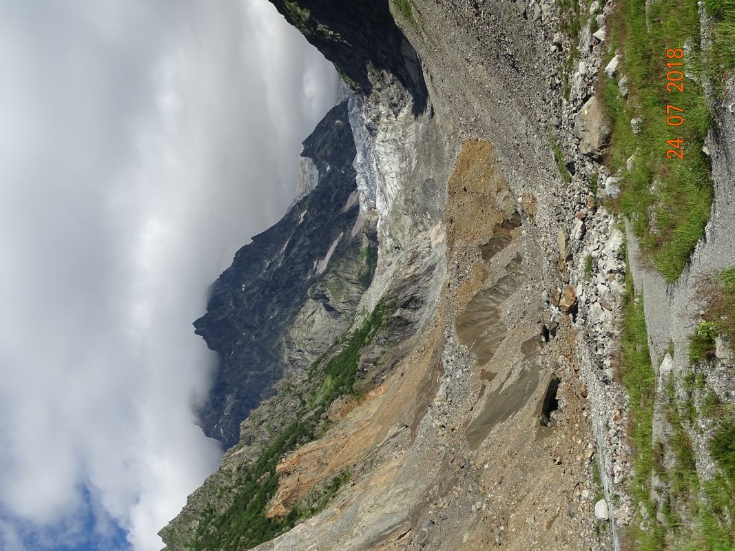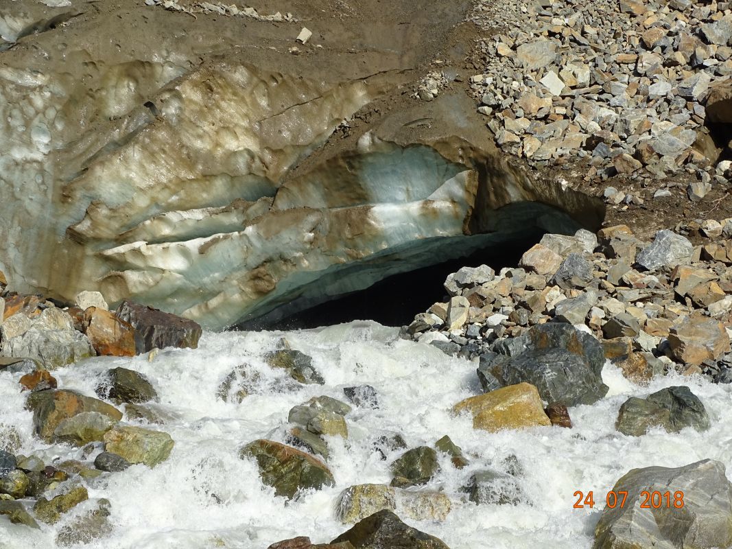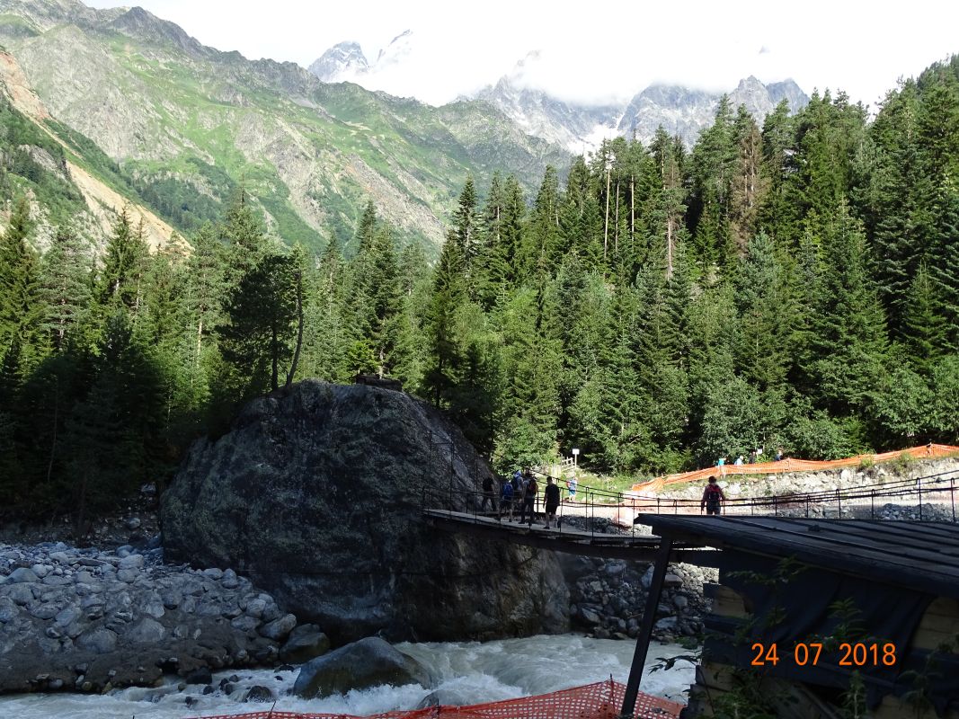 Ледник питается снегами гор Ушбы и Тетнульди, и его нижняя часть отличается суровой красотой: величественные обрывы, обломки льда, валуны и поток талой воды, устремляющийся вниз. В ясную погоду отсюда открываются потрясающие виды на вершины Сванетии.