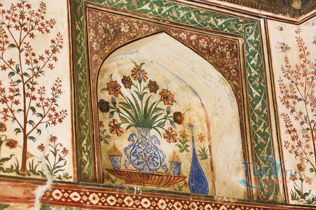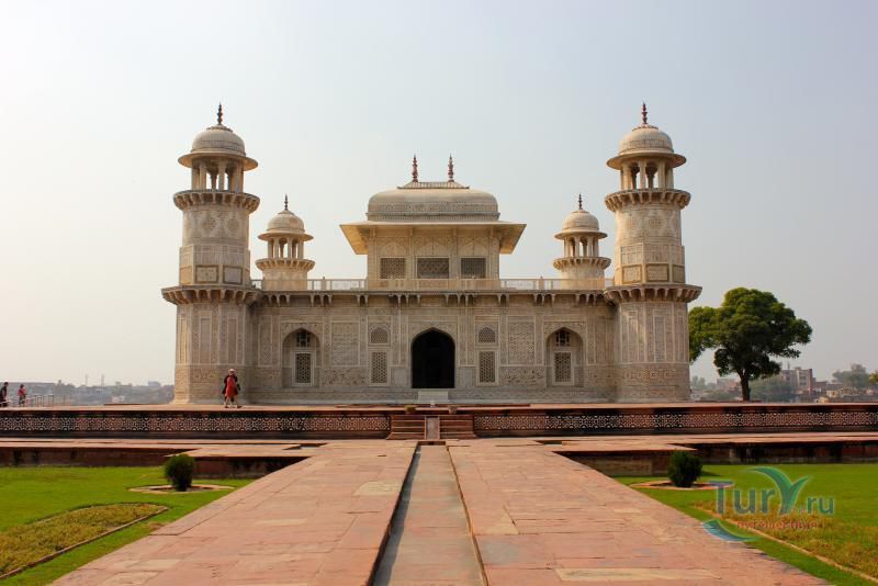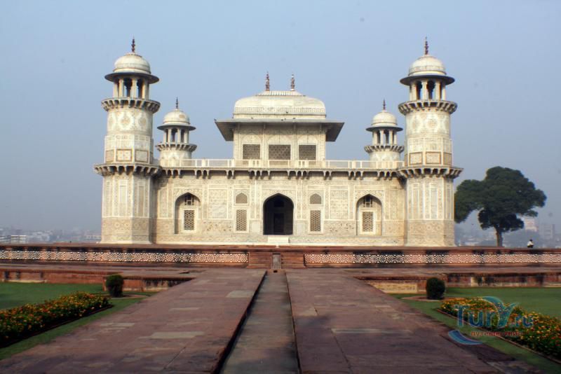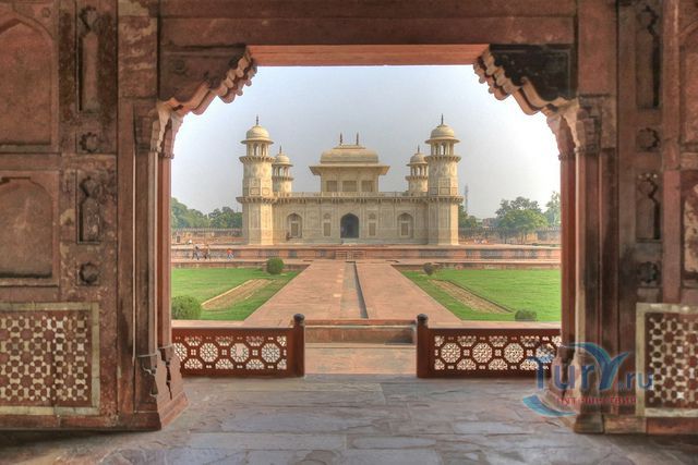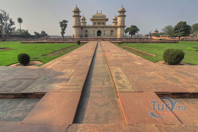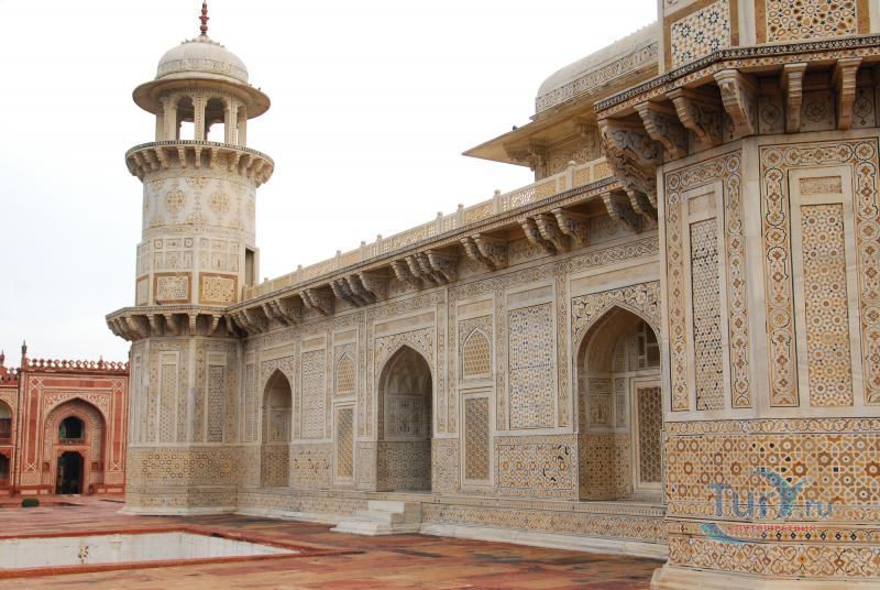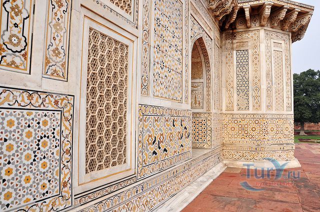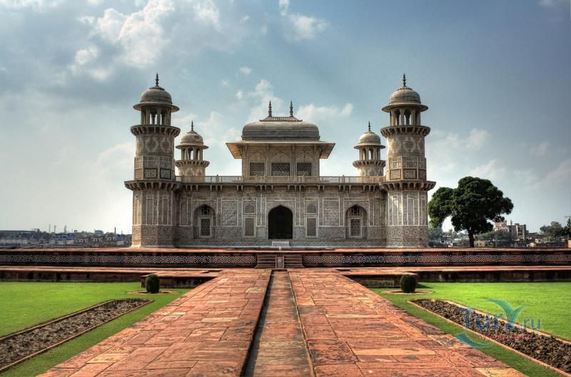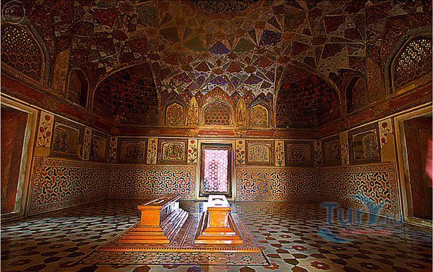 Усыпальница Итемад-уд-Даулы стоит в центре персидского парка, поражая изяществом линий и тщательностью отделки. Эту гробницу Нурджахан, любимая супруга Джахангира, построила для своего отца Итемад-уд-Даулы. Она много сделала для своего отца еще при жизни: благодаря дочери он получил пост старшего камергера, а затем первого министра при императоре. В этой гробнице покоятся также останки матери императрицы. Небольшая по размеру гробница на подступах к Тадж-Махалу была построена в 1622 - 1628 гг. и замечательно отражает вкус и ум одаренной императрицы. Это квадратное здание с четырьмя башнями по углам, увенчанное павильоном в форме балдахина; полы инкрустированы арабесками. Теплые тона желтого мрамора контрастируют с белыми и черными узорами, а ажурные мраморные панели и богатая мозаика из самоцветов по-женски нежны и восхитительны.