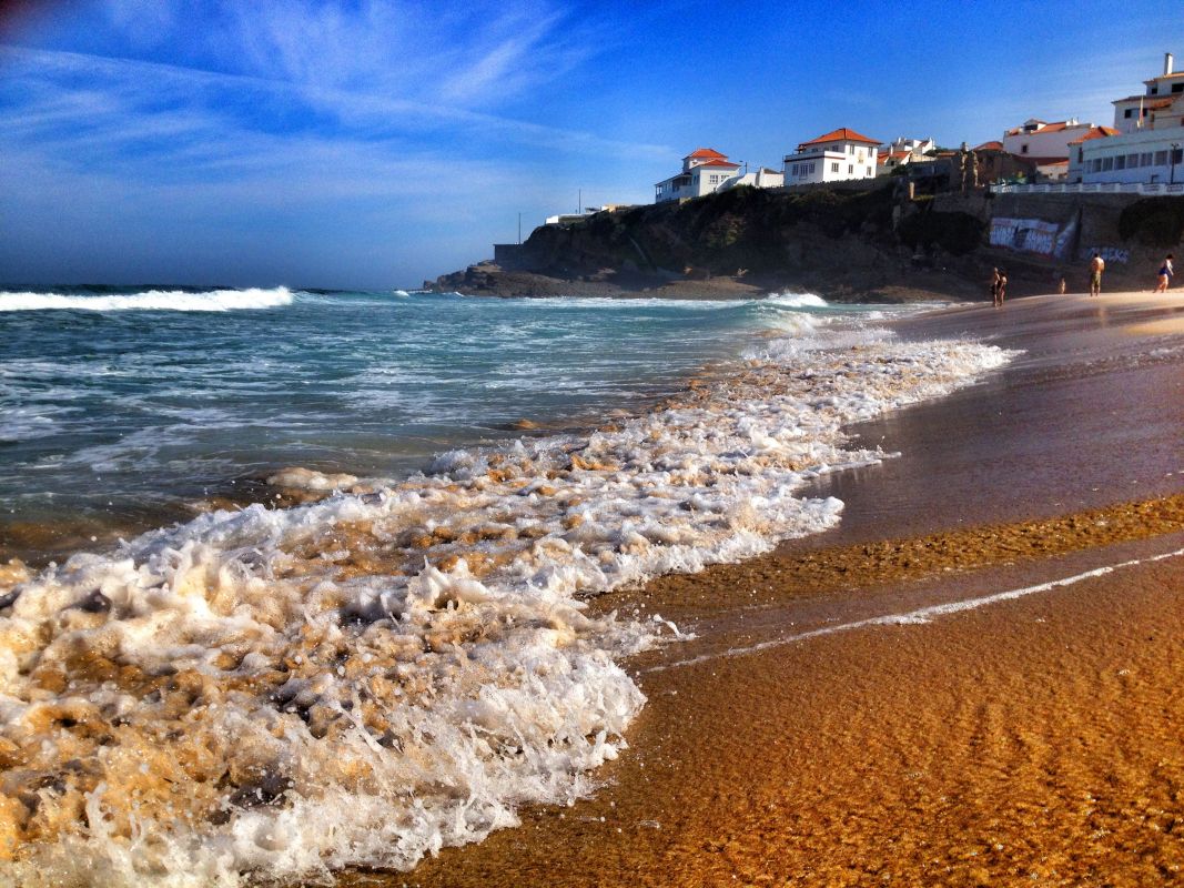 Как гласит традиция, название этого пляжа происходит от тех яблок, что некогда сюда приносила впадающая в океан речка «Рибейра-ди-Колареш» (Ribeira de Colares).