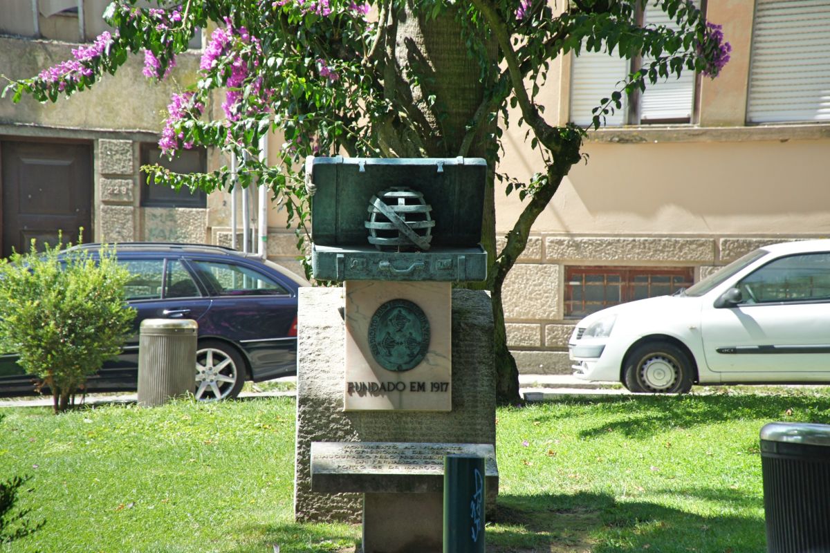 Небольшой деревянный садик практически полностью покрыт зеленым газоном. Там мы можем увидеть памятник молодому специалисту по продажам.