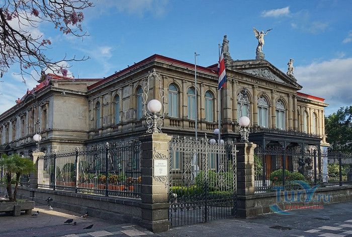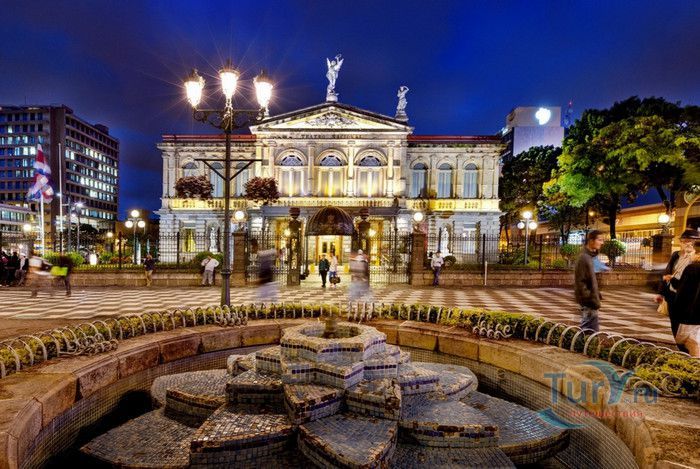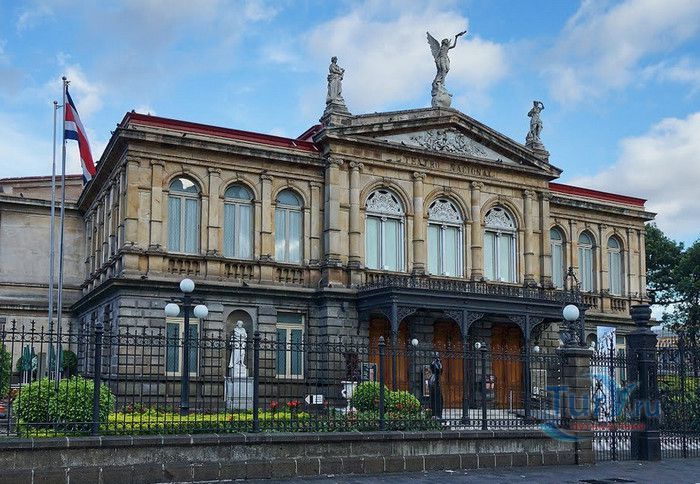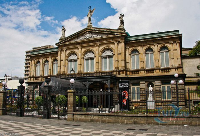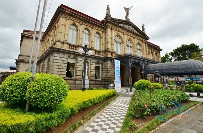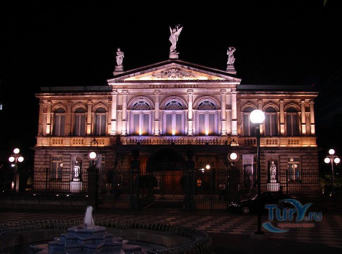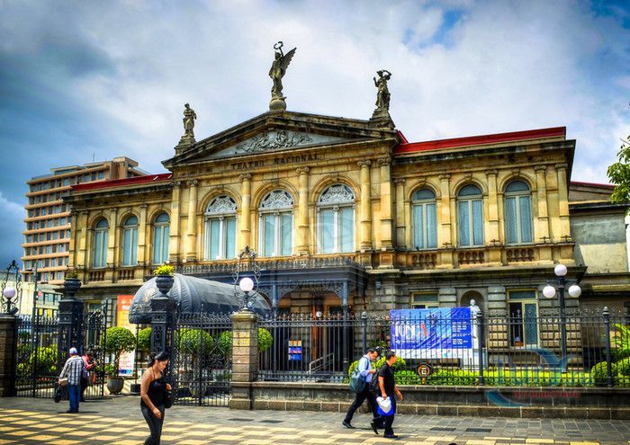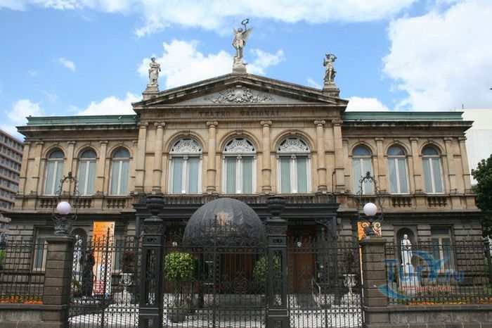 Национальный Театр Коста-Рики по праву считается одним из лучших театров Латинской Америки. Его строительство началось в 1891 году. Для сбора денег на реализацию проекта собственного Национального театра в стране был введен налог на кофе. За образец было взято здание Парижской оперы. Однако, в начале строительства, из-за нехватки квалифицированных инженеров и рабочих, возникло множество проблем. После привлечения к работе архитектора Руи Кристофоро Молинари, которому удалось наладить процесс, строительство театра было успешно завершено. Национальный Театр Коста-Рики открыл свои двери 21 октября 1897 года премьерой спектакля Фауст. Великолепное здание театра в нео-классическом стиле, роскошное оформление интерьеров и зрительного зала - предмет гордости жителей Коста-Рики. Фасад театра украшен колоннами в стиле Возрождения и увенчан статуями, изображающими Танец, Музыку и Славу. Перед входом установлены статуи Людвига ван Бетховена и Кальдерона де ла Барка. Вестибюль театра отделан розовым мрамором с золотой инкрустацией. Холл украшают статуи муз работы итальянского мастера Пьетро Булгарелли. Фрески на стенах и потолке отражают историю Коста-Рики. Огромная хрустальная люстра, бронзовые светильники, мраморные лестницы, роскошный паркет, венецианские зеркала вызывают ощущение роскоши и великолепия. Зрительный зал театра вмещает 1040 человек. На премьерах и пользующихся популярностью постановках зал заполнен до отказа. На сцене Национального Театра Коста-Рики считают за честь выступать труппы многих театров мира.