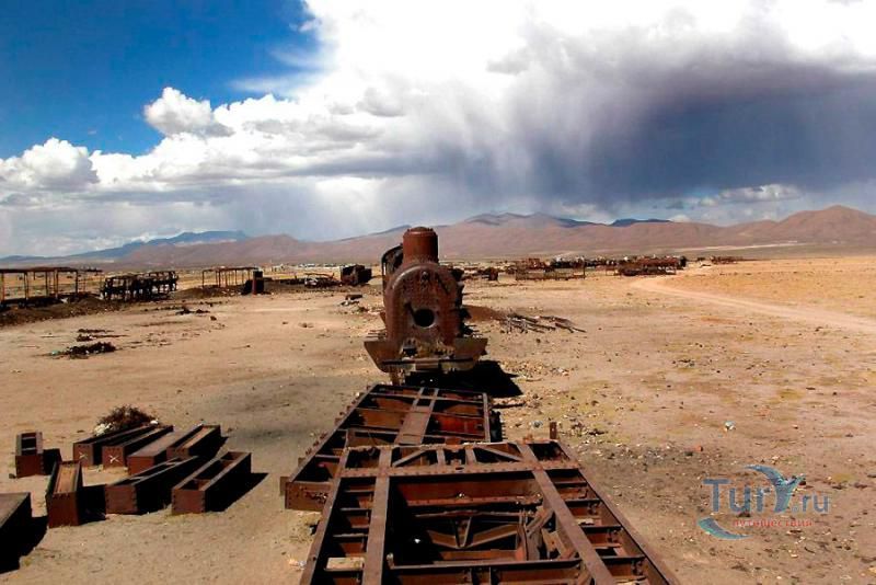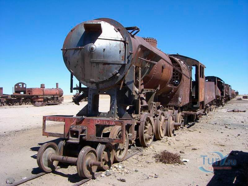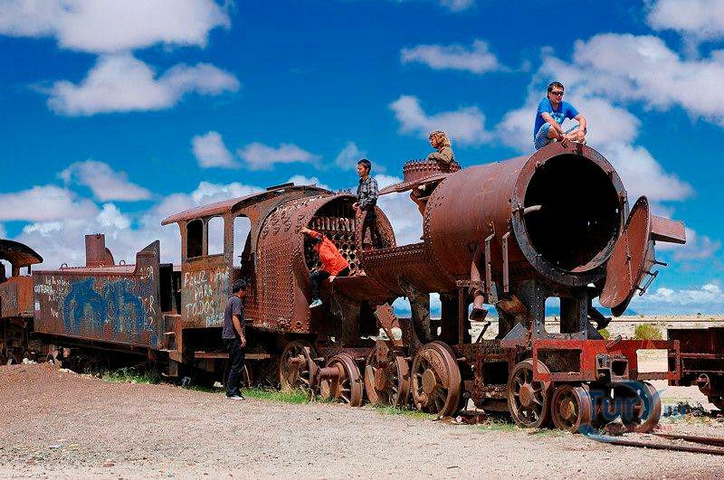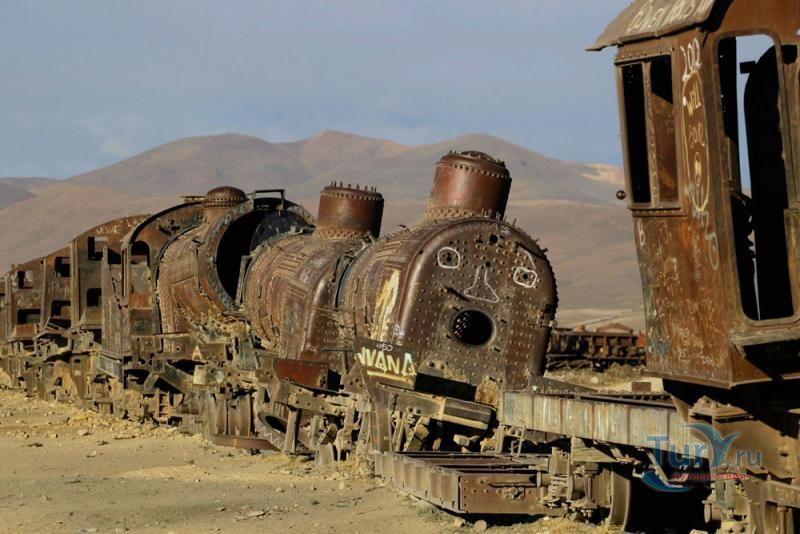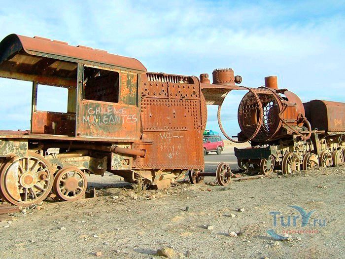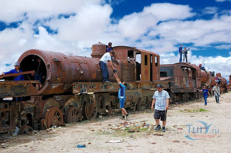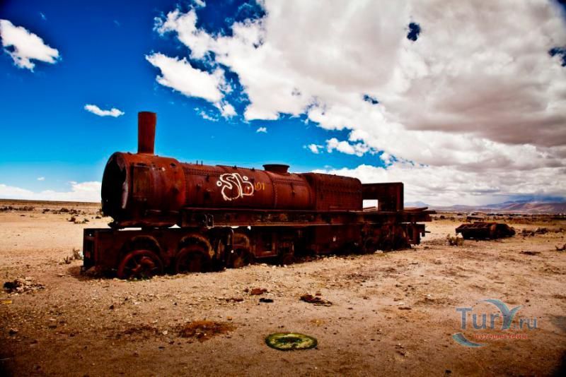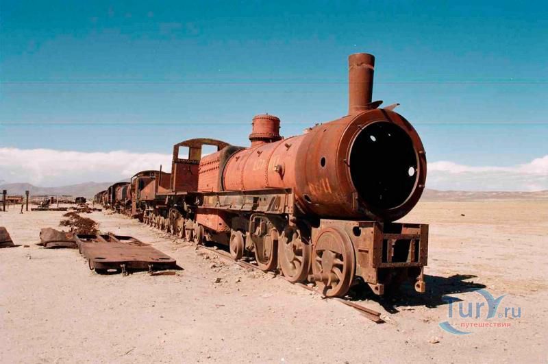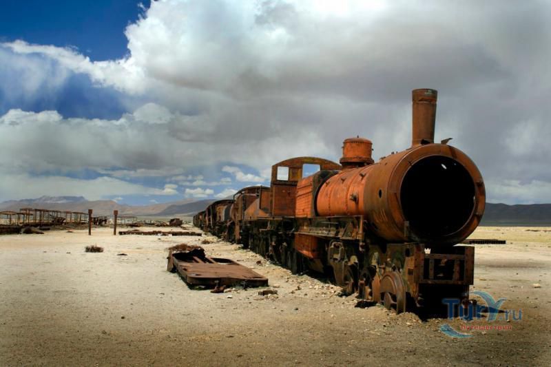 Кладбище паровозов находится всего в трех километрах от вполне современного и цивилизованного города Уюни, затаившегося в горах на высоте более чем в три тысячи семьсот метров над уровнем моря, на юго-западе Боливии. Это место удивляет гостей одним из самых причудливых пейзажей нашей планеты. Широкие открытые пространства, глубокое синее небо и облака, которые движутся быстрее, чем дикие лошади; постоянно сменяющиеся цвета и контрасты. И в самом центре этой красоты скопление ржавых локомотивов и вагонов, многим из которых уже более ста лет. Вид разлагающихся поездов, которые уже давно не ездят, не издают гудков, а только грустно стоят посреди пустыни и постепенно разрушаются, вызывает настоящие мурашки по коже. Поэтому неудивительно, что это место как магнитом притягивает туристов. Видимо, кладбище поездов прекрасно передает атмосферу нашей беспомощности перед временем, ведь даже такие железные «монстры» не могут устоять перед погодой и течением десятилетий. История кладбища поездов началась довольно банально. В конце XIX века правительство Боливии, возглавляемое президентом Анисето Арку, активно поддерживало строительство железнодорожных сетей в этом регионе. Справедливо считая, что для экономического процветания Боливии разветвленная транспортная система железных дорог просто необходима, власти обеспечили финансирование проекта, и вскоре Уюни стал настоящим городом железнодорожников. Здесь была крупная узловая станция, через которую проходили все важные транспортные магистрали региона. По прогнозам, Уюни должен был стать процветающим городом, ключевым транспортным и торговым центром региона. Первой проблемой стал саботаж. Местные индейцы аймары посчитали строительство железной дороги вторжением в их земли и, естественно, стали протестовать. Но если этот вопрос удалось урегулировать, то вот от следующего удара все планы правительства рухнули, как карточный домик. Уюни был важным горнодобывающим центром, вокруг которого располагалось великое множество рудников, приносящих колоссальную прибыль. Поэтому их ресурсы эксплуатировались на полную мощность. В сороковых годах XX они истощились и транспортировать стало больше нечего. Потребность в железнодорожных ветках отпала, а Уюни постепенно пришел в упадок. Ненужными стали и паровозы с вагонами. Кроме того, их обслуживание стоило очень дорого, а дохода они не приносили. Поэтому локомотивы и вагоны стали цениться даже меньше металлолома, ведь слишком много труда и других затрат бы потребовалось, чтобы разобрать их и вывезти из пустыни. В конечном итоге, сослужившую свою службу железнодорожную технику просто бросали под открытым небом за ненадобностью, согнав составы в дальний тупик железнодорожной линии. Горнодобывающая промышленность Боливии в этом регионе рухнула примерно в 1940-х годах, тогда же здесь и начали скапливаться поезда. На кладбище возможно увидеть как останки отдельных частей паровозов, так и целые составы: локомотивы, с прицепленными к ним вагонами. Интересно, что большинство гниющих поездов - это главным образом импорт из Великобритании, которая контролировала развитие железнодорожной системы Боливии. Казалось бы, эти железные «монстры» должны стоять тут столетиями, тем более, что Уюни находится в пустыне, где выпадает очень малое количес