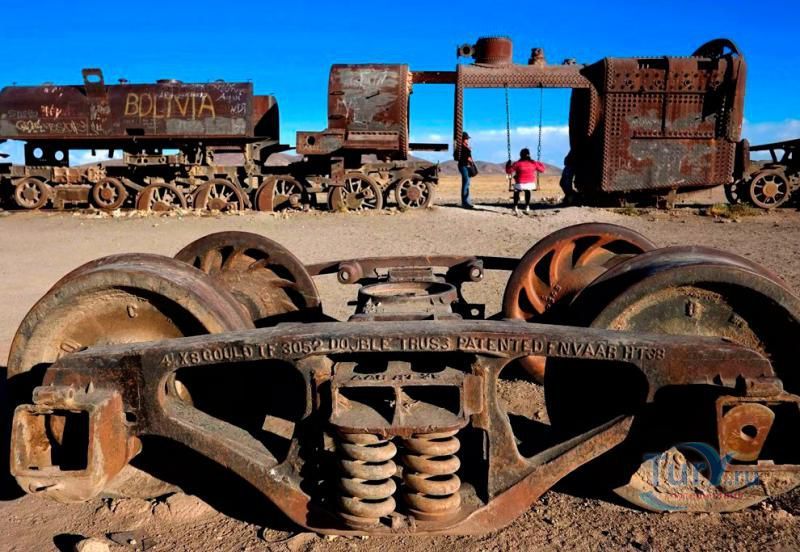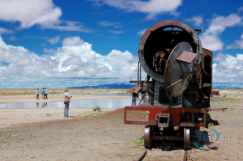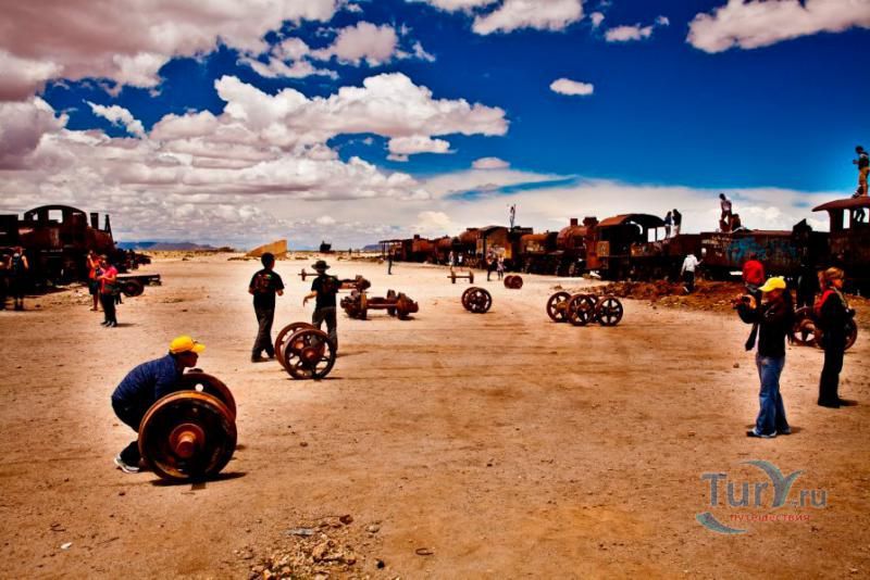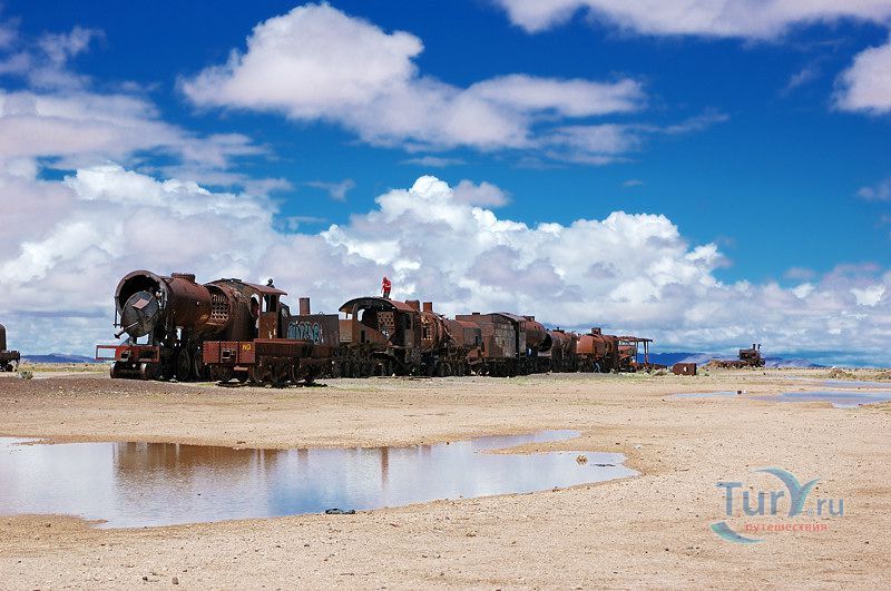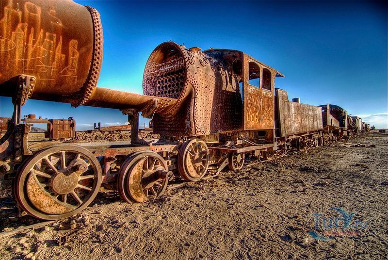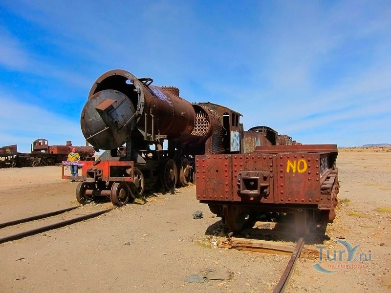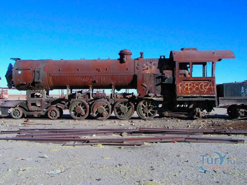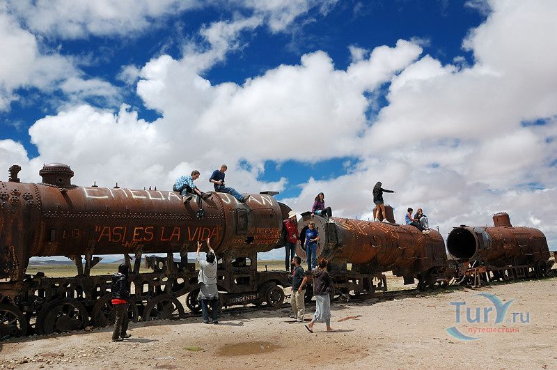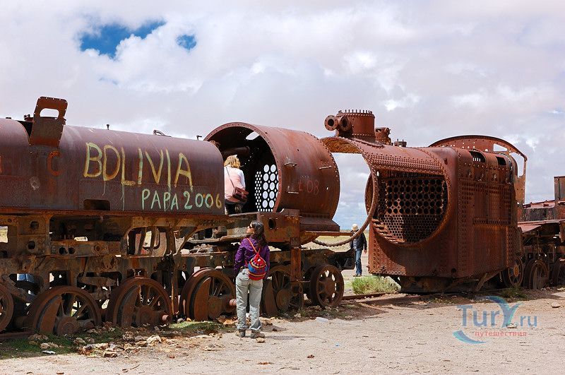 Кладбище паровозов находится всего в трех километрах от вполне современного и цивилизованного города Уюни, затаившегося в горах на высоте более чем в три тысячи семьсот метров над уровнем моря, на юго-западе Боливии. Это место удивляет гостей одним из самых причудливых пейзажей нашей планеты. Широкие открытые пространства, глубокое синее небо и облака, которые движутся быстрее, чем дикие лошади; постоянно сменяющиеся цвета и контрасты. И в самом центре этой красоты скопление ржавых локомотивов и вагонов, многим из которых уже более ста лет. Вид разлагающихся поездов, которые уже давно не ездят, не издают гудков, а только грустно стоят посреди пустыни и постепенно разрушаются, вызывает настоящие мурашки по коже. Поэтому неудивительно, что это место как магнитом притягивает туристов. Видимо, кладбище поездов прекрасно передает атмосферу нашей беспомощности перед временем, ведь даже такие железные «монстры» не могут устоять перед погодой и течением десятилетий. История кладбища поездов началась довольно банально. В конце XIX века правительство Боливии, возглавляемое президентом Анисето Арку, активно поддерживало строительство железнодорожных сетей в этом регионе. Справедливо считая, что для экономического процветания Боливии разветвленная транспортная система железных дорог просто необходима, власти обеспечили финансирование проекта, и вскоре Уюни стал настоящим городом железнодорожников. Здесь была крупная узловая станция, через которую проходили все важные транспортные магистрали региона. По прогнозам, Уюни должен был стать процветающим городом, ключевым транспортным и торговым центром региона. Первой проблемой стал саботаж. Местные индейцы аймары посчитали строительство железной дороги вторжением в их земли и, естественно, стали протестовать. Но если этот вопрос удалось урегулировать, то вот от следующего удара все планы правительства рухнули, как карточный домик. Уюни был важным горнодобывающим центром, вокруг которого располагалось великое множество рудников, приносящих колоссальную прибыль. Поэтому их ресурсы эксплуатировались на полную мощность. В сороковых годах XX они истощились и транспортировать стало больше нечего. Потребность в железнодорожных ветках отпала, а Уюни постепенно пришел в упадок. Ненужными стали и паровозы с вагонами. Кроме того, их обслуживание стоило очень дорого, а дохода они не приносили. Поэтому локомотивы и вагоны стали цениться даже меньше металлолома, ведь слишком много труда и других затрат бы потребовалось, чтобы разобрать их и вывезти из пустыни. В конечном итоге, сослужившую свою службу железнодорожную технику просто бросали под открытым небом за ненадобностью, согнав составы в дальний тупик железнодорожной линии. Горнодобывающая промышленность Боливии в этом регионе рухнула примерно в 1940-х годах, тогда же здесь и начали скапливаться поезда. На кладбище возможно увидеть как останки отдельных частей паровозов, так и целые составы: локомотивы, с прицепленными к ним вагонами. Интересно, что большинство гниющих поездов - это главным образом импорт из Великобритании, которая контролировала развитие железнодорожной системы Боливии. Казалось бы, эти железные «монстры» должны стоять тут столетиями, тем более, что Уюни находится в пустыне, где выпадает очень малое количес