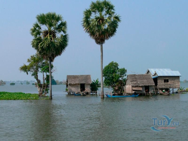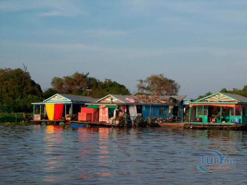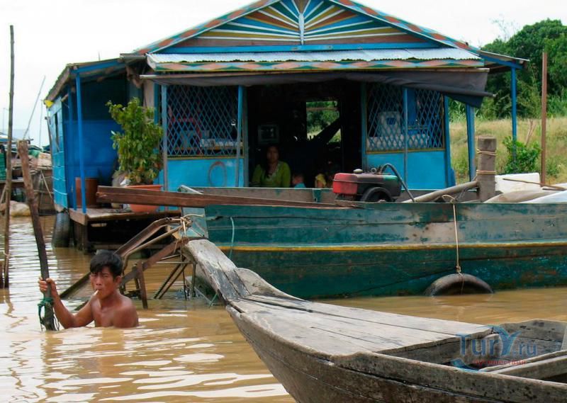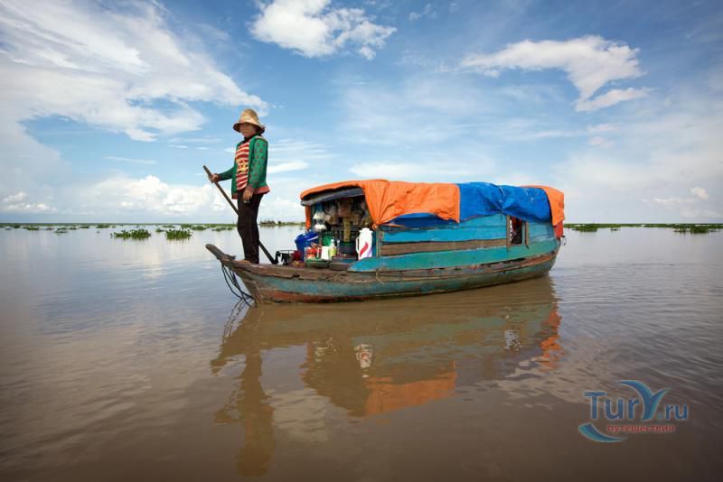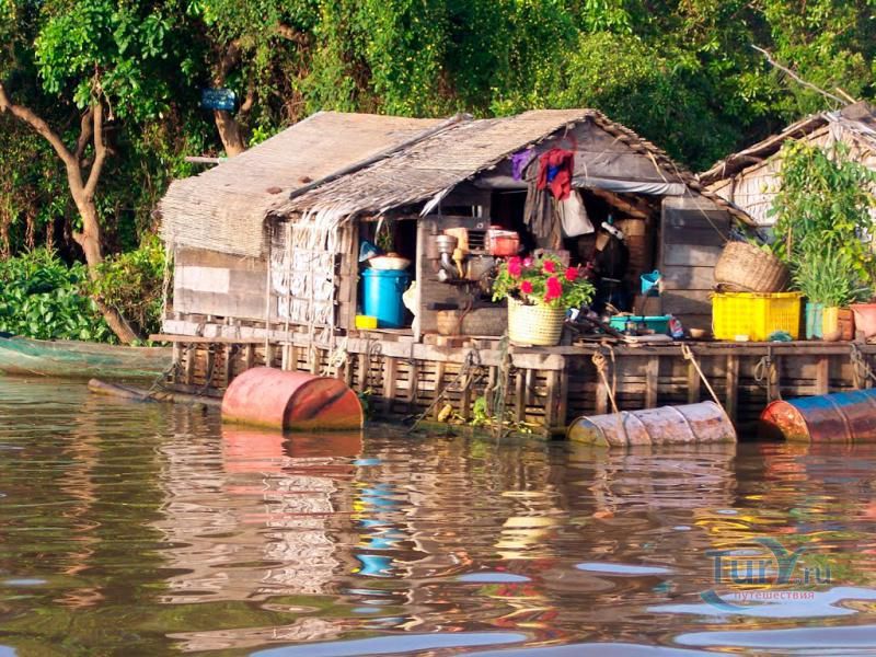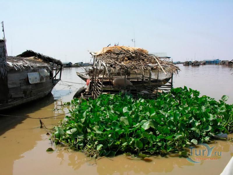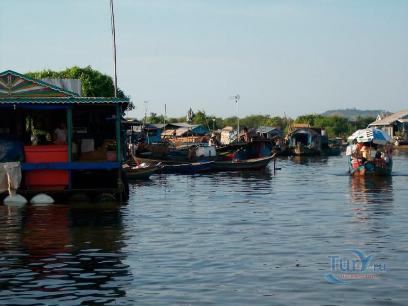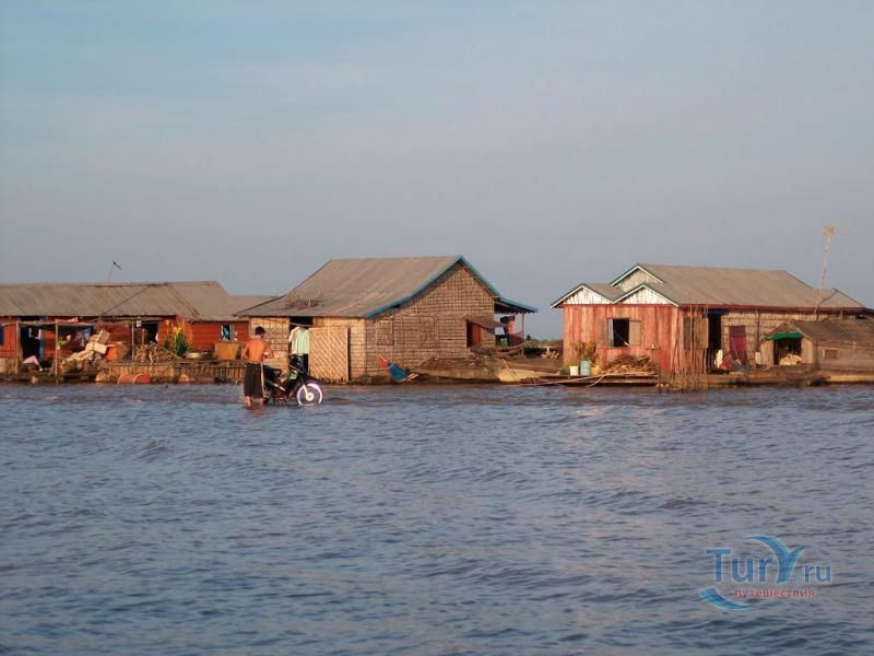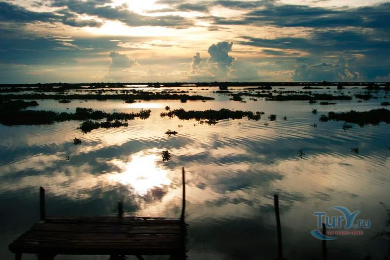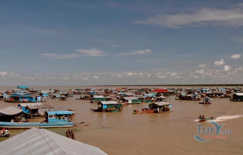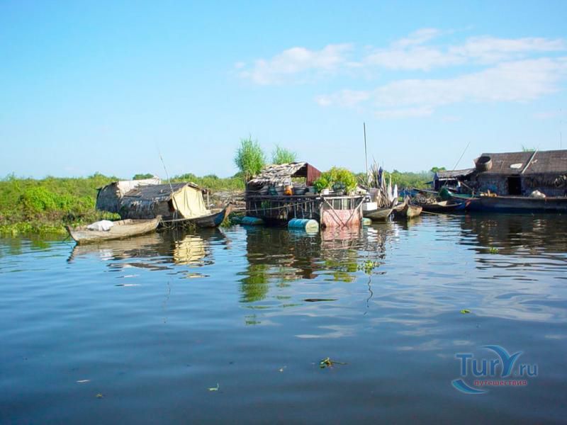 Тонлесап - самый большой водоём Индокитайского полуострова, называемый также «Камбоджийским внутренним морем». Название озера переводится как «большая свежая вода». В западных источниках озеро Тонлесап часто фигурирует как «Большое озеро». Площадь озера 16 тыс. кв. км (для сравнения, площадь Московской области 47 тыс. кв. км). Максимальная глубина озера - 9 метров. Но эти цифры справедливы лишь для сезона дождей, когда озеро наполняется водой и по сравнению с сухим сезоном увеличивается по площади почти в шесть раз. На протяжении большей части года озеро сравнительно невелико (около 2700 кв. км), а глубина озера в это время редко где превышает 1 метр. Таким изменчивым характером озеро обязано вытекающей из него одноименной реке, которая в сезон дождей меняет направление течения и поворачивает вспять, наполняя его водой и затопляя окрестные поля и леса. Благодаря этому создаются хорошие условия для рыбы и для рыбной ловли. Озеро Тонлесап - один из наиболее продуктивных пресноводных ресурсов для добычи рыбы в мире. Кроме того, благодаря тому, что после схода воды на окрестных землях оседает плодородный ил и благодаря постоянно меняющемуся уровню воды, люди могут выращивать рис на плодородной после снижения уровня воды почве в сухой сезон, добывать моллюсков и ловить рыбу круглый год. На озере есть единственное каменное здание, которое стоит на высоких сваях — это буддийский храм. Все же остальные строения плавучие и мигрируют в течение года по озеру. Местные жители, по сути, всю свою жизнь проводят на воде. Чтобы поспевать за периодически передвигающейся береговой линией, они решили не переносить постоянно свои дома, а просто строить их на воде. «Фундаменты» домов в плавучих деревнях представляют собой скопление лодок, плотов и связанных между собой бочек. На них расположены не только жилища, но и небольшие участки земли, где местные жители умудряются выращивать овощи, содержать домашних животных и разводить крокодилов. На таких же плотах построены магазины, школы, храмы, полицейский участок, деревенский клуб, ресторан для туристов и небольшая смотровая площадка. Дети ходят в плавучую школу, путь до которой преодолевают, плавая в больших тазиках. Местные жители не требуют от жизни многого. Их дома от паводка в дождливый сезон защищены благодаря сваям. Отличной вентиляции воздуха в помещении помогает отсутствие дверей. И им совершенно не важно, что в доме нет телевизора, кондиционера и компьютера. Несмотря на такие ужасные условия жизни, жители плавучих деревень неизменно приветливы. Они довольствуются тем, что дает озеро, и не разделяют мужскую и женскую деятельность. Все одинаково добывают пропитание для семьи. Независимо от вида работы, будь то сбор урожая на рисовых плантациях, ловля рыбы, плетение сетей или изготовление сувениров – все трудятся не покладая рук, не обращая никакого внимания на туристов. И пусть вода в озере коричневая от ила и непригодна для питья, зато долины усеяны восхитительными полянами розовых лотосов.
