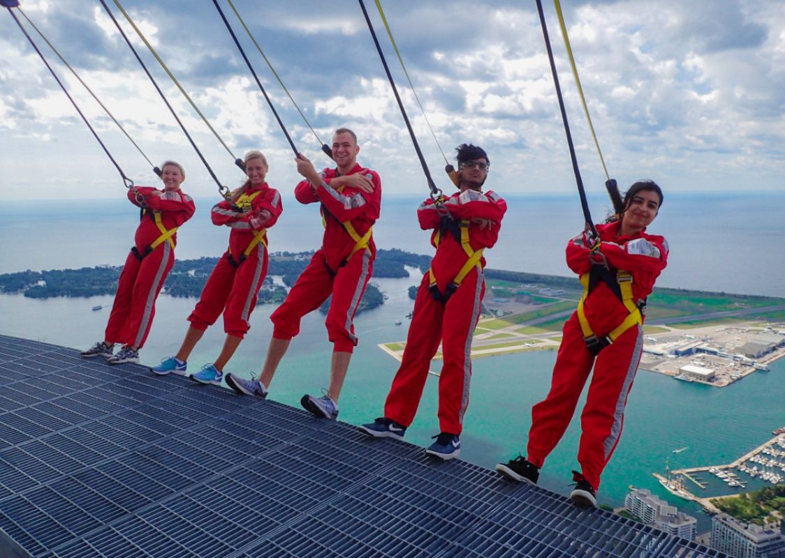 Это наиболее знаменитый и признанный символ Канады. Самая высокая постройка на момент строительства, Канадиен Нэ-шенл Тауэр (Canadian National Tower), НАМ, сокращенно, К. Н. Тауэр (С. N. Tower), вместе со шпилем антенны в высоту равна 553,5 метра. Строили ее 40 месяцев. Идея заключалась в том, чтобы башня могла принимать и передавать сигналы, а при этом многочисленные небоскребы Торонто не создавали ей помех. Отстроенная башня, кроме своего практического назначения, стала еще и местом, где предлагается немало развлечений, достопримечательностью для туристов, а главное - известным во всем мире символом. Строительство самого высокого сооружения в мире потребовало более чем серьезных размышлений о безопасности. Сложности самой конструкции были в сущности давно известны из опыта постройки небоскребов, но все-таки этот проект был шагом в неизведанное, поэтому все характеристики должны были быть исключительно надежными. К работе привлекли множество архитекторов, башня - результат многолетнего коллективного труда. На первом этапе он заключался и в обсуждении бесчисленных предложений, пока, наконец, не утвердили окончательный вариант (в первом проекте были заложены три башни, связанные между собой мостами). История строительства представлена на фотовыставке в Скайпод. Просто невероятно: в дело пошли 40 522 кубических метра бетона, 129 кубических метров предварительно напряженного железобетона и 5080 тонн стали. Общий вес сооружения оценивается в 132 080 тонн. На строительстве были заняты 1537 рабочих, которые для начала должны были выкопать котлован 15-метровой глубины, то есть поднять наверх 63 000 тонн земли и сланцеватой глины. К. Н. Тауэр - внушительная и элегантная конструкция - доказывает, что результатом продуманной техники и тщательного проектирования может быть гармоничное здание. В 1995 г. Американское общество гражданских инженеров внесло башню «Си Эн Тауэр» в список семи чудес света современной цивилизации. EdgeWalk – смотровая площадка на самой высокой башне в Торонто. Её посетители стоят на открытом выступе телебашни CN Tower на высоте 365 метров, где нет ни барьеров, ни поручней, а единственной мерой предосторожности служит страховочный пояс с тросом.