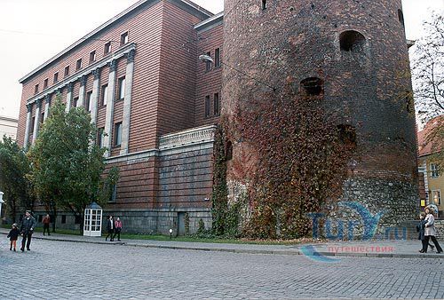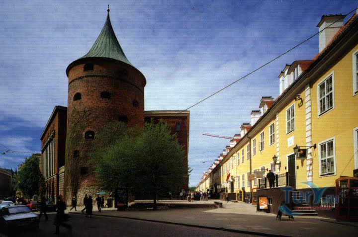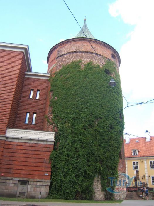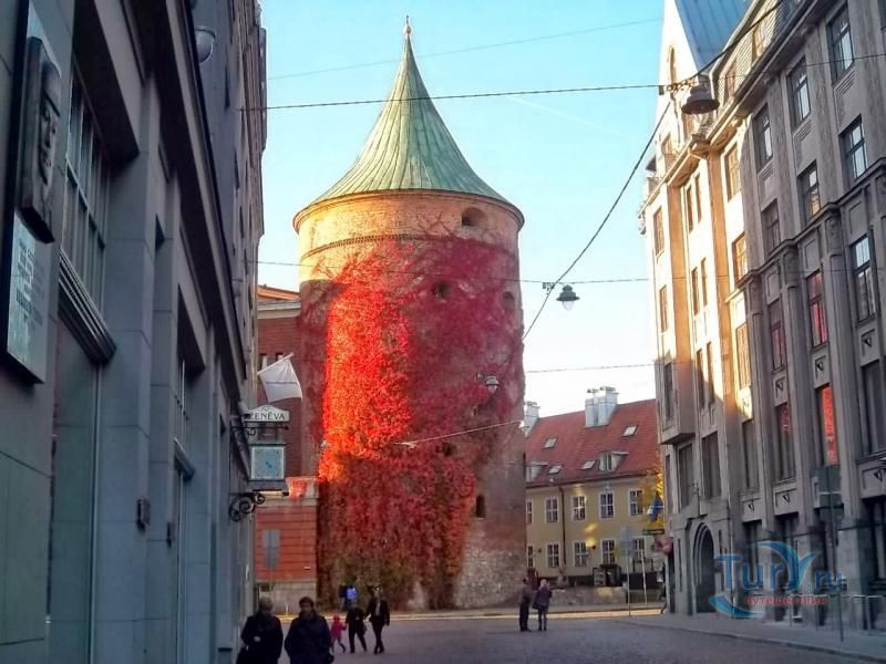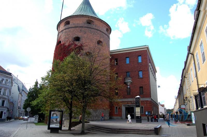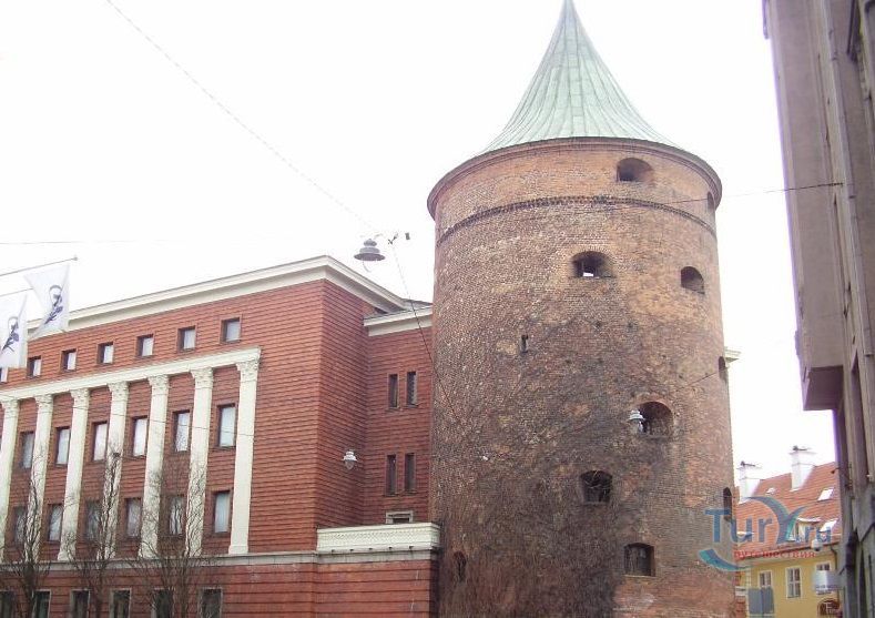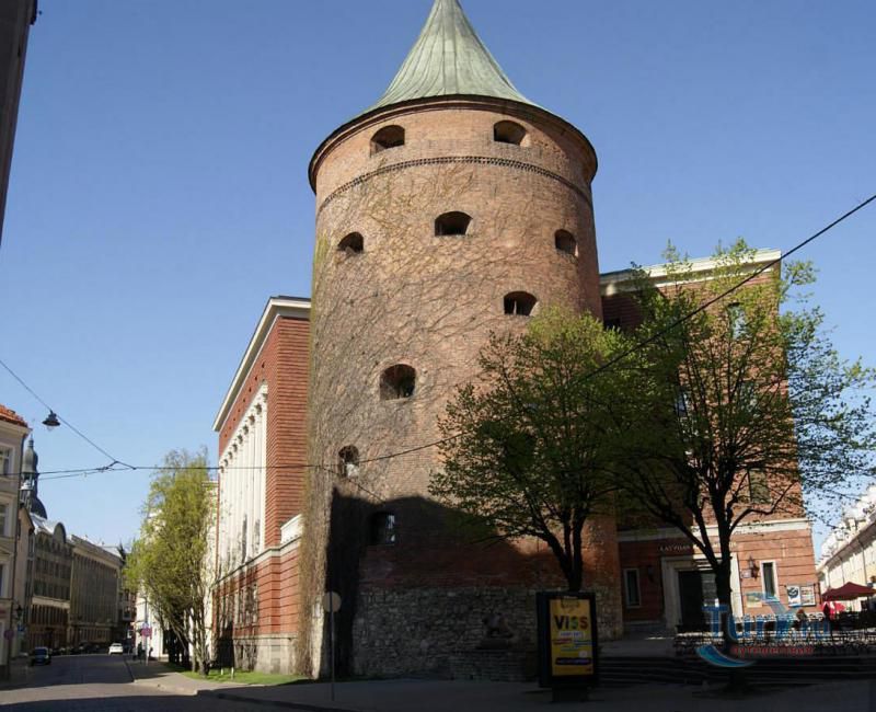 Пороховая башня – единственная дошедшая до наших дней защитная башня крепостной стены, когда-то окружавшей Ригу. Точная дата постройки башни не известна, однако есть документальные упоминания о том, что в середине 14 века она была укреплена и достроена. В те времена крепостная стена Риги включала в себя по разным источникам от 25 до 28 башен. Пороховая башня охраняла вход в город со стороны реки Даугавы, откуда привозился песок, поэтому в те времена она называлась Песчаная. Пороховой башню стали называть только в 17 веке, когда, по одной версии, в ней был обустроен пороховой склад, а по другой, из-за того что во время регулярных учений над башней всегда клубился дым от пороховых зарядов. Толщина стен башни достигает у основания трёх метров, диаметр почти 20, а высота 26 метров. Начиная с середины 14 века, в башне насчитывалось шесть этажей. На своем веку башня пережила несколько войн и осад, в разных местах в стены башни вмурованы двенадцать пушечных ядер, когда-то попавших туда во время обстрелов.