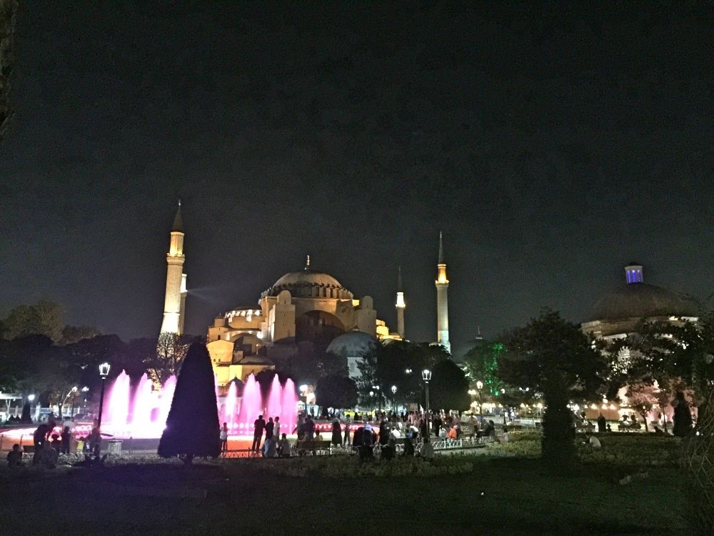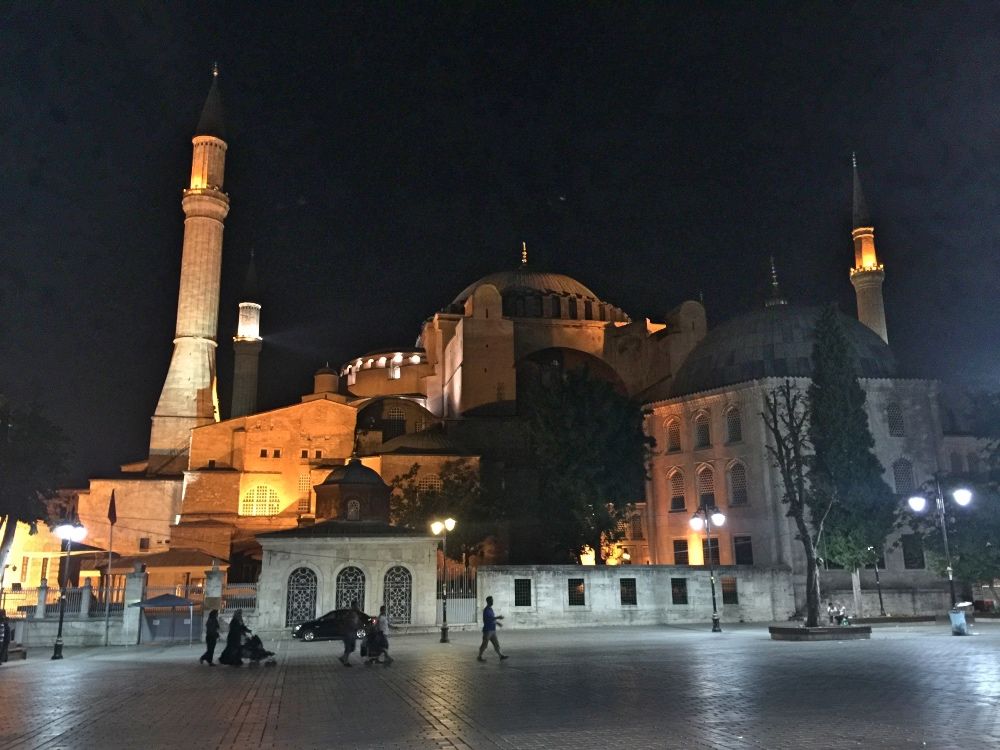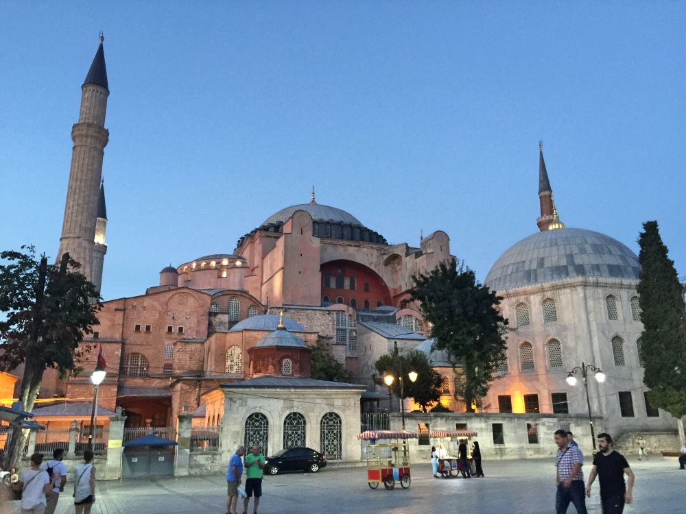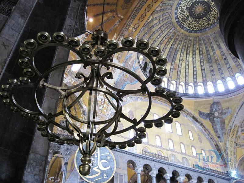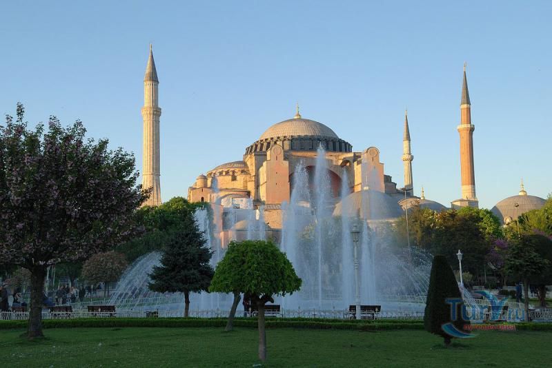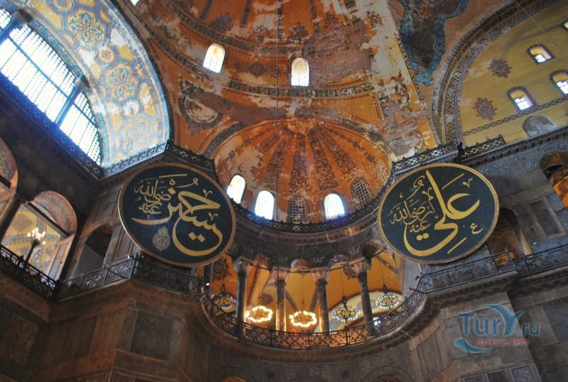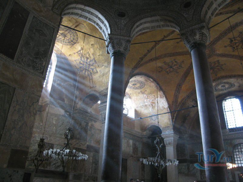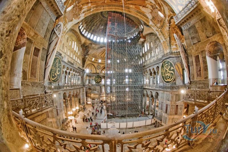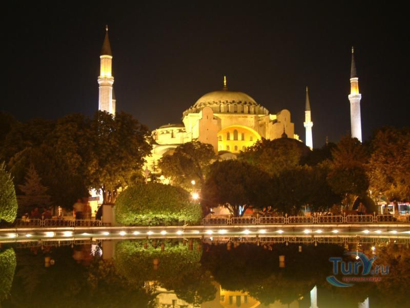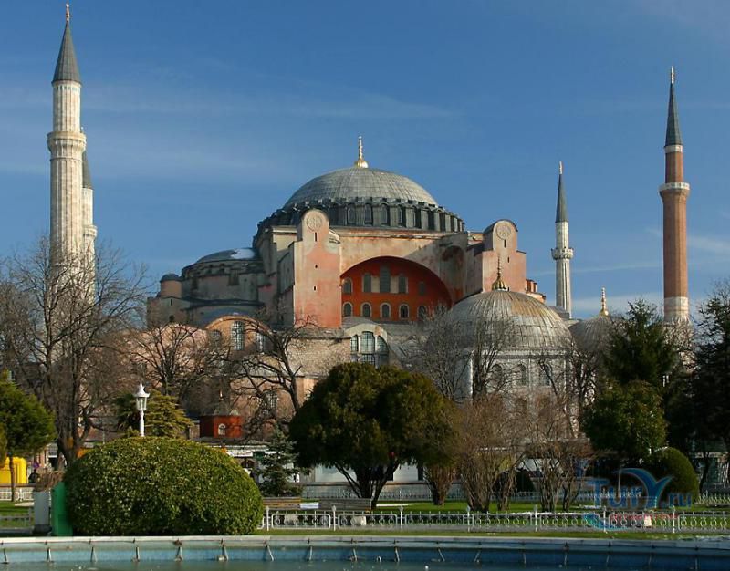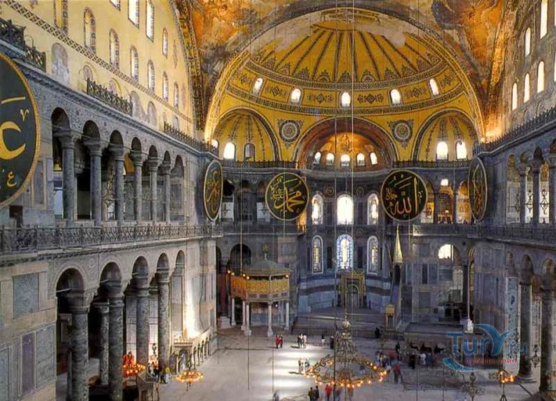 Собор Айя-София (собор Святой Софии) - одна из главных достопримечательностей и визитная карточка Стамбула (ранее Константинополя). Это чудо архитектуры VI века! Собор Святой Софии построен на месте древнего акрополя. Около 330 года Константин Великий велел построить храм. В 360 году собор в честь Софии Божьей Премудрости был построен и освящен сыном Константина Великого - Констанцием. Этот собор простоял 75 лет, а потом был разрушен при пожаре. Вскоре отстроили еще один собор, но в 532 году его постигла та же участь. Нынешний Собор Святой Софии начали строить при Юстиниане I. Святая София была построена в рекордные сроки – за 5 лет. Торжественное освящение Святой Софии произошло в декабре 537 года. Много необычного было в строительстве этого собора. Известь изготовляли на ячменной воде, в цемент добавляли масло. Для верхней доски престола был изобретен новый материал: в растопленную массу золота бросали ониксы, топазы, жемчуг, аметисты, сапфиры, рубины - все самое дорогое. Храм, предназначенный для явлений императора народным массам, должен был создавать впечатление ослепительного великолепия. Высота Софийского собора — 55,6 метров, диаметр купола 31 метр. Стены храма облицованы громадными плитами из розового, зеленого, темно-серого и белого мрамора разных оттенков. Император собирался покрыть стены сверху донизу золотом, но потом передумал. Мудрецы не советовали искушать будущих правителей, которые в погоне за золотом непременно разрушат храм. Постройка храма, его размеры и украшения производили на современников неизгладимое впечатление, поэтому не удивительно, что вокруг всего этого сразу же стали складываться легенды и мифы. Рассказывали, что план здания был вручен императору Юстиниану во сне ангелом. Когда между императором и архитекторами возникали споры, например, сколько окон делать над главным алтарем, Юстиниану якобы во сне опять явился ангел и приказал сделать три окна в честь Святой Троицы. Более тысячи лет Софийский собор оставался самым большим храмом в христианском мире вплоть до постройки Собора Святого Петра в Риме. По русским преданиям именно в собор Святой Софии направил своих послов Князь Владимир Красное Солнышко, которые должны были ему сообщить, хороша ли христианская религия. Побывав в Храме, они сообщили князю Владимиру, что побывали не просто в великолепном храме, а в раю. Говорят, что именно это определило выбор Владимира и его решение крестить Русь. Вместе с крещением Русь приняла и великую культуру. Это случилось в X веке. В 1453 году Константинополь был захвачен турками. Турецкий султан Мехмед Завоеватель въехал в город и был поражен красотой и огромными размерами Святой Софии. Он приказал не разрушать православный храм, а превратить его в мечеть. Колокола, алтарь, иконостас и остальные священные реликвии были вывезены, а мозаика и фрески, изображающие лики святых, тщательно замазаны. Вместо этого Софийский собор обрел михраб, минбар, четыре минарета и стал мусульманской мечетью Айя-София. Наименование Айя-София одно из 3-х эпитетов, обращенных к богу. Эти три эпитета определяются так: Айя-София (Святая Мудрость), Айя-Ирена (Святое Благодушие) и Айя-Динамис (Святая Сила). В 1935 году по распоряжению президента Турции Кемаля Ататюрка Святая София была превращена в музей. Музей Айя-София - огромное величественное