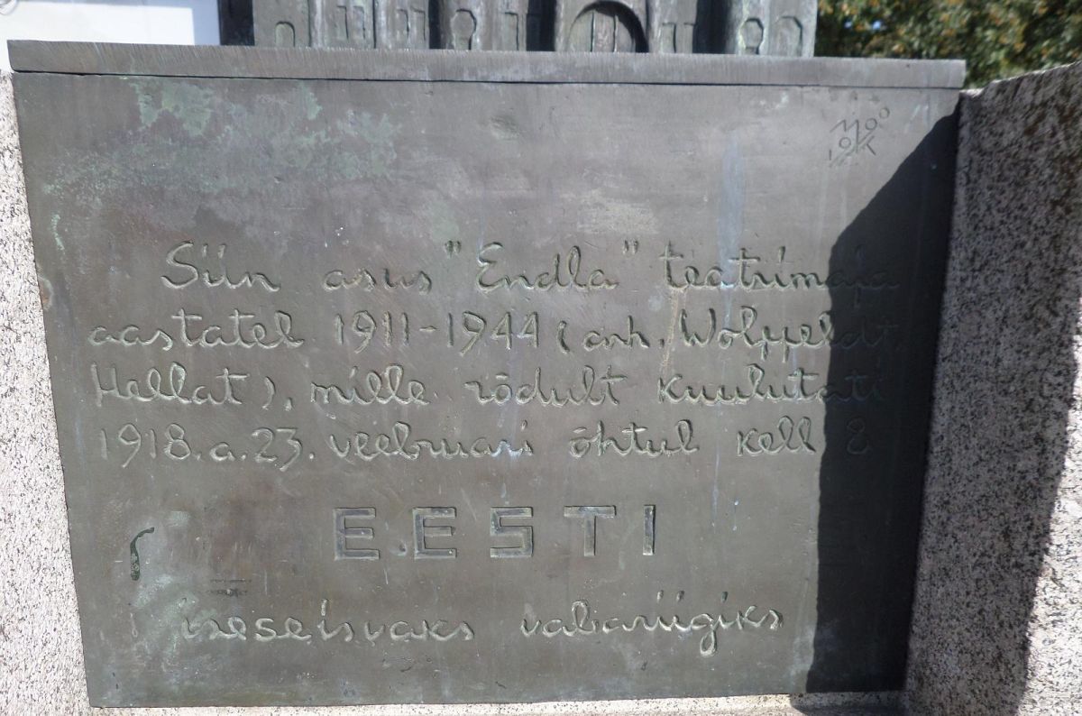 Скромный монумент серого цвета обозначает местонахождение одного из первых основанных в Эстонии певческо-театральных обществ. Певческо-театральное общество "Эндла" было основано в 1875 году. При расширении творческой жизни общества было принято решение начать строительство собственного дома. Архитекторами здания в стиле югенд являются: первоначальный эскиз - Г.Хеллат, проект - А.Юнг, внешнее оформление - Е. фон Вольффельдт, года постройки - 1908-1911. С балкона театра "Эндла" адвокатом Х.Кууснером 23 февраля 1918 года был впервые публично зачитан Манифест независимости Эстонии.