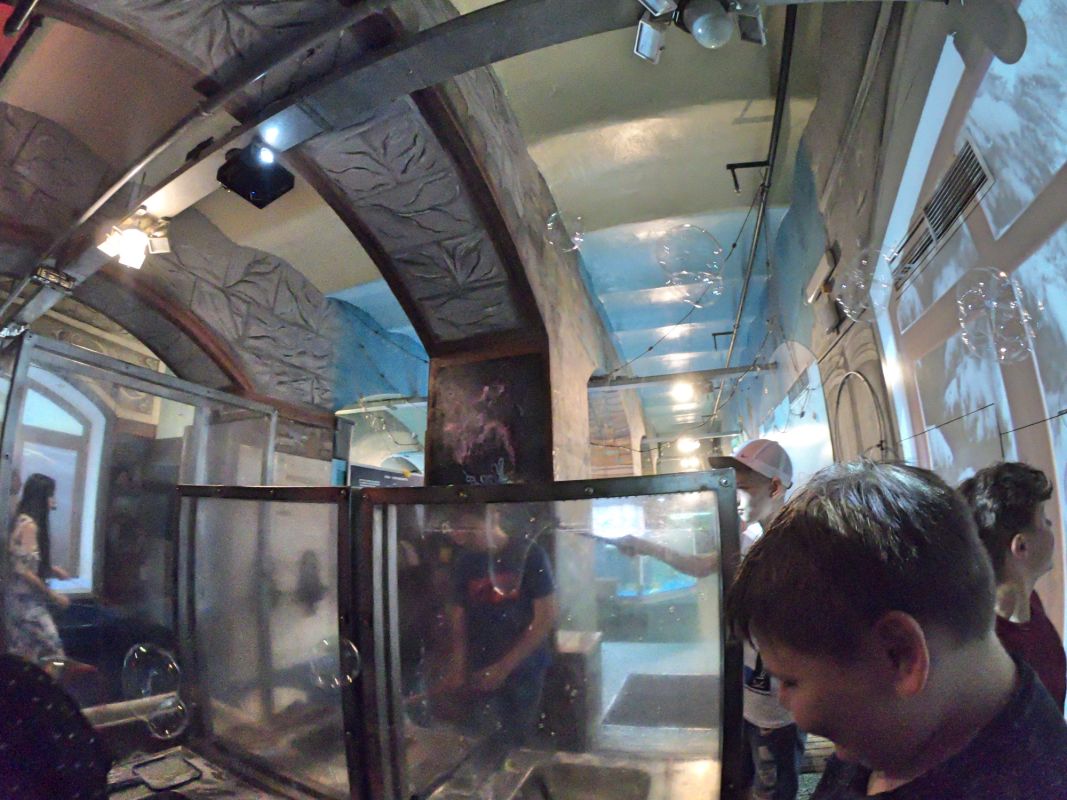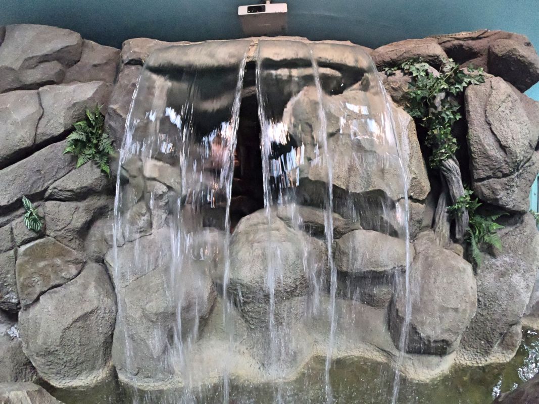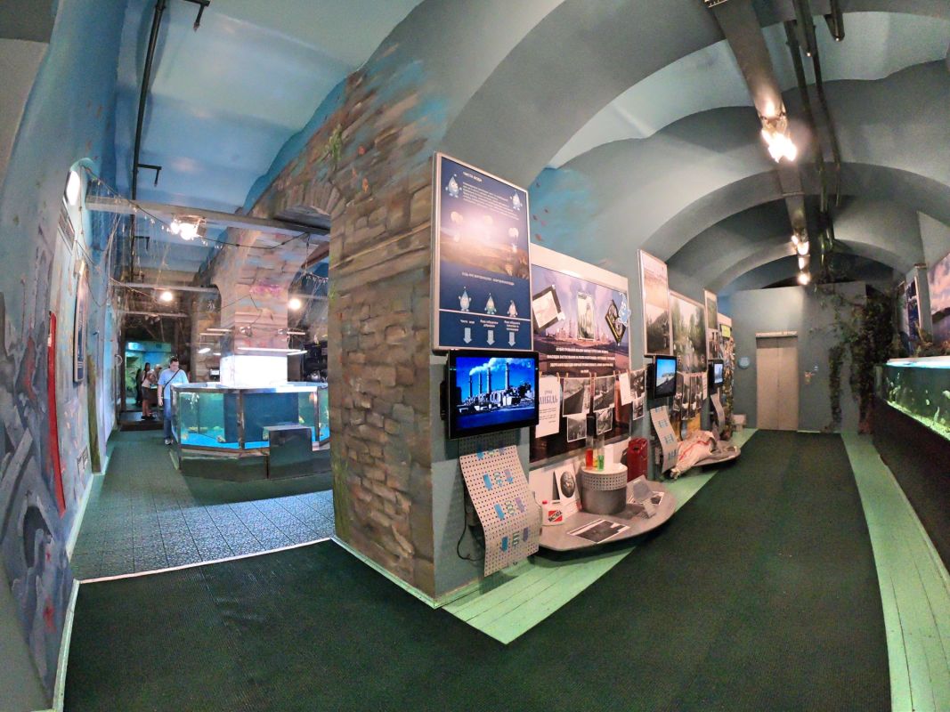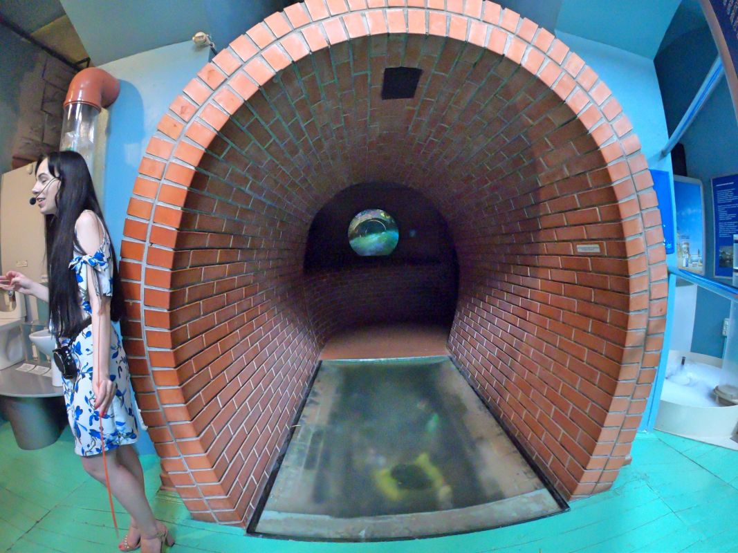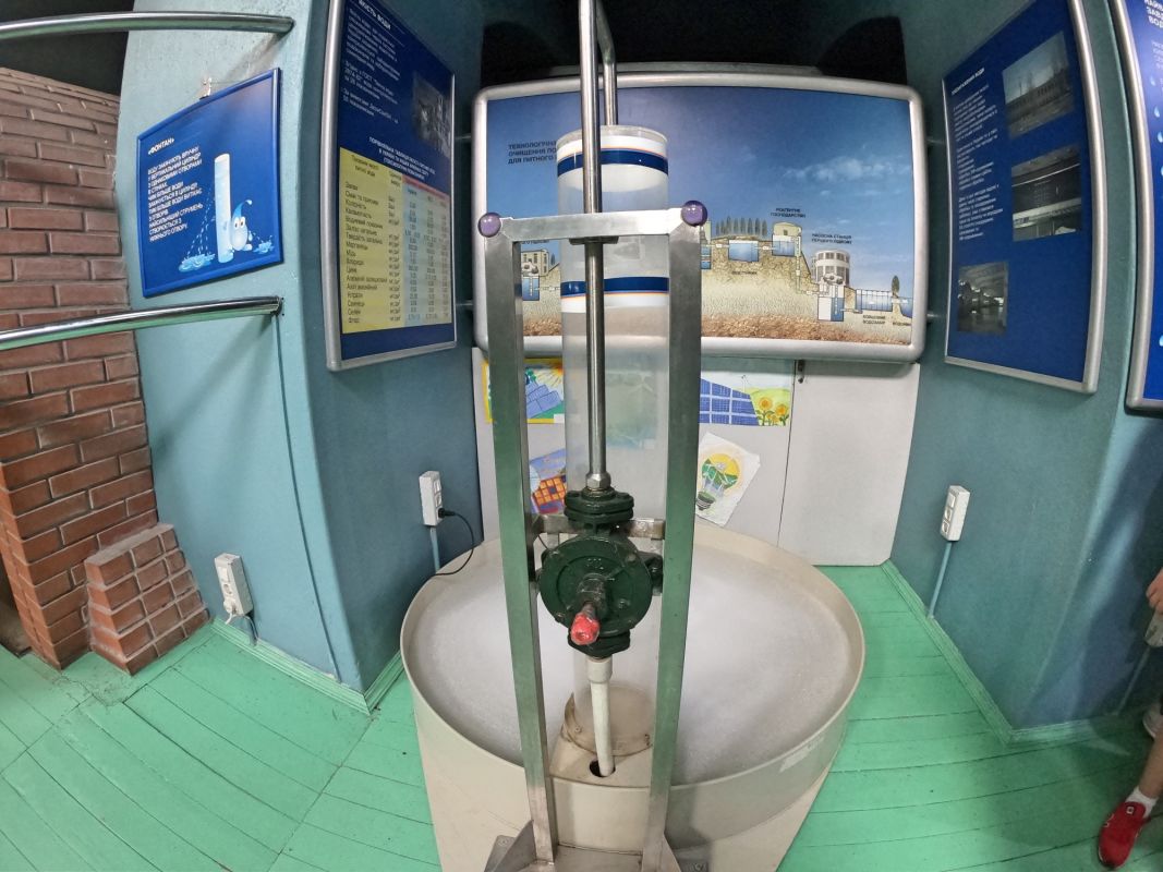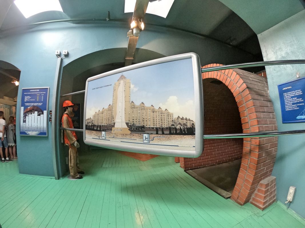 Вся экспозиция Музея воды находится под землей, куда спускается специальный лифт. Это огромные аквариумы, большой бассейн с японскими рыбками, действующая модель артезианской скважины, канализационный коллектор, грот с водопадом. Можно увидеть и услышать искусственный гром, увидеть, как тают ледники, идет дождь, и даже понаблюдать за извержением гейзера.