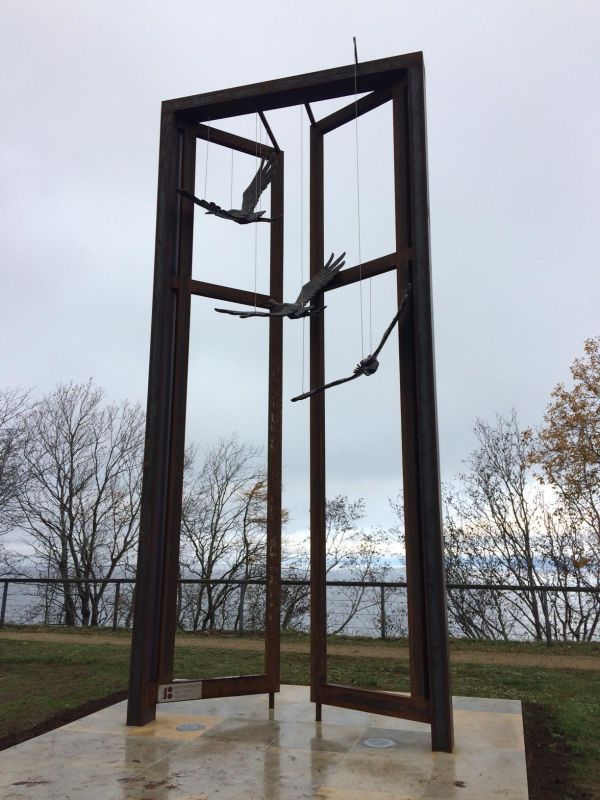 Памятник представляет из себя трех больших журавлей, вылетающих из приоткрытых шестиметровых окон, — так видят переселение балтийских немцев скульптор Симсон фон Сикюлль (Айвар Симсон) и архитектор Калле Рыымус.