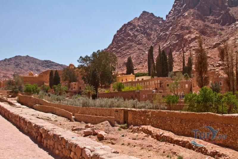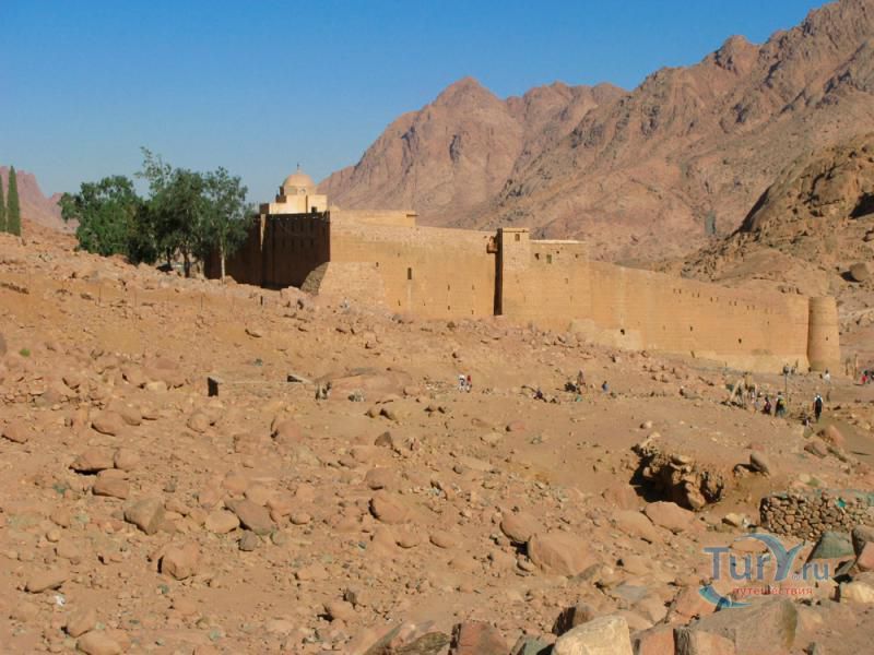 Монастырь Святой Екатерины – самая маленькая епархия и в тоже время самый древний непрерывно действующий христианский монастырь в мире. В 2002 году монастырский комплекс был включён ЮНЕСКО в список объектов Всемирного наследия. Он расположен в центре Синайского полуострова у подножия горы Синай на высоте 1570 метров, в долине между горами Моисея, Екатерины и Сафсафа. Основали его в том месте, где, как говорит предание, явился Господь Моисею в горящем кусте неопалимой купины. Впервые монастырь св.Екатерины упоминается в хрониках патриарха Евтихия Александрийского, жившего в IX веке: в них рассказывается о том, что св.Елена, мать императора Константина, потрясенная святостью этих мест, в 330 году приказала построить небольшую часовню, посвященную Богородице, на месте Неопалимой купины. Дальнейший толчок к развитию монастырь получил в VI веке, когда император Юстиниан приказал построить церковь, которая впоследствии стала Храмом Преображения и мощные крепостные стены, окружившие предшествующие постройки святой Елены. С XI века, в связи с распространением почитания святой Екатерины, монастырь получил новое название — монастырь Святой Екатерины. Настоящее имя Святой Екатерины - Доротея. При крещении она приняла имя Екатерина. За принадлежность к христианской вере её бесчисленное количество раз подвергали пыткам, а 25 ноября 305 года обезглавили. Предание гласит, что во время пыток из её ран текла не кровь, а молоко. После казни тело Екатерины исчезло. Примерно пять столетий спустя монахи монастыря, построенного Юстинианом, повинуясь видению, поднялись на самую высокую гору Синая и нашли там останки Екатерины. Они спустили их вниз и поместили в золотую раку в церкви. С тех пор высочайшая гора Синая носит имя Святой Екатерины. Историю мученической смерти Святой Екатерины рассказали в Европе крестоносцы, и она стала почитаться как святая. Ежедневно верующим открывают доступ к мощам святой Екатерины, которые находятся в Храме Преображения на алтаре в гробнице, покрытой белым покрывалом. Стены и колонны, кровля и надписи Храма Преображения сохранились со времён Юстиниана. В XVIII веке под древней кровлей был сделан потолок. Самые ранние из икон, находящихся в церкви, были написаны ещё в VI веке. Пол, внутреннее убранство и иконостас относятся к XVII - XVIII векам. Деревянным входным дверям в церковь 1400 лет. Над ними надпись по-гречески: "Вот врата Господа; праведные войдут в них". Самым священным местом в храме считается расположенная за алтарем часовня, построенная в 324 году матерью императора Константина Еленой. С помощью мраморных колонн поддерживается алтарь часовни, а ниже находятся корни легендарного библейского куста - неопалимой купины. Это куст, в пламени которого, согласно Ветхому завету, Бог впервые явился пророку Моисею. Куст буйно растет всего в нескольких метрах от часовни. Он был пересажен для того, чтобы можно было построить святой алтарь над его корнями. Это единственный куст такого рода на всем Синайском полуострове. Причем ни одна попытка высадить его в другом месте не увенчалась успехом. В пристройке к главному храму монастыря располагается выставка, на которой представлены старинные иконы и книги. В галерее икон выставлено 150 из 2000 икон, составляющих уникальную коллекцию монастыря. Двенадцать самых редких и самых старых икон