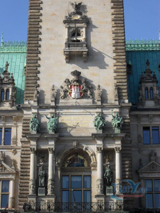 Над главным входом на латыни начертано: «Пусть потомки достойно хранят свободу, добытую предками». Чуть выше надписи расположен Большой герб Гамбурга и мозаика, изображающая покровительницу Гамбурга — богиню Гаммонию. Гаммония — это латинское название Гамбурга, а богиня с таким именем была придумана в восемнадцатом веке, в эпоху романтизма. Гаммония имеет вид красивой женщины, увенчанной короной в форме городской стены с башнями. Считается, что Гаммония олицетворяет главные ценности Гамбурга: свободу, мир, терпимость, преуспевание, гармонию, благоденствие и свободную торговлю. Скульптуры Императоров и Королей на мощном фасаде напоминают о былом статусе Гамбурга как вольного имперского города.