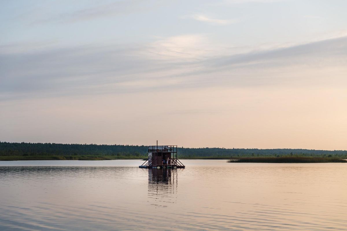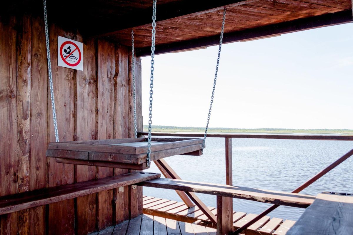 Расположенная на озере Эрмисту приватная двухэтажная баня на плоту предлагает банные впечатления для компаний до 10 человек. На первом этаже находится вместительная парилка с дровяным отоплением, лестница для спуска и уголок для сидения, на втором этаже можно устроить барбекю, всем вместе посидеть за столом и насладиться видом на озеро.
