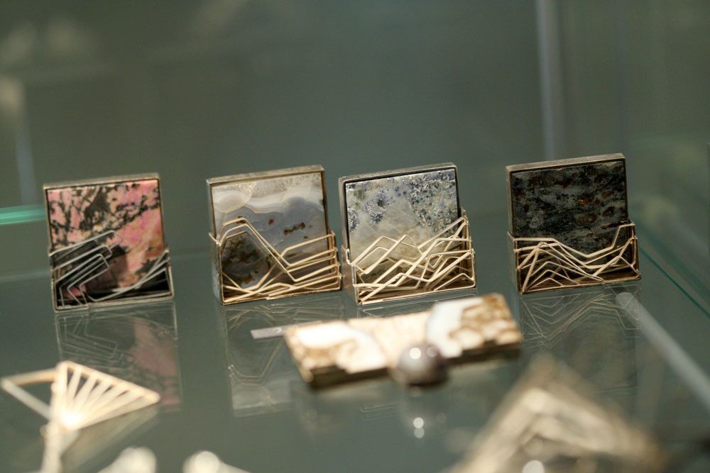 Для изготовления украшений художник использует филигранную технику, а также много янтаря и песчаника.