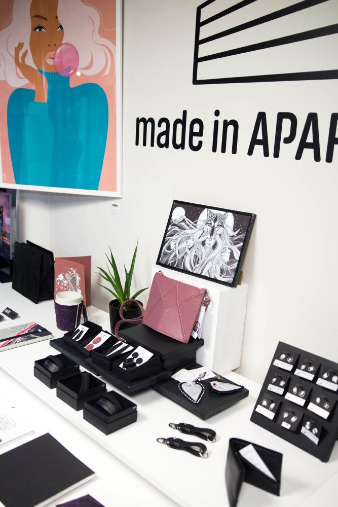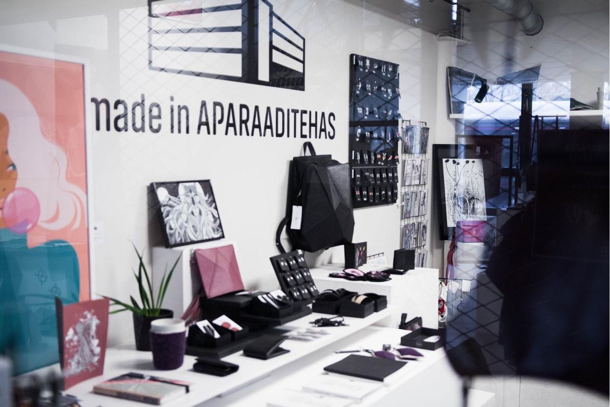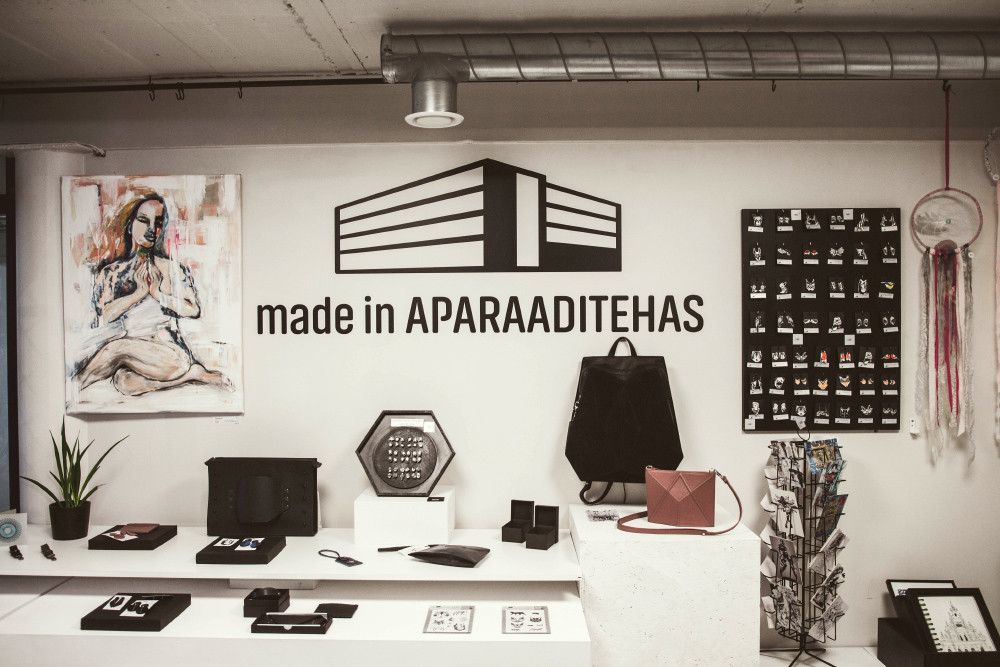 В его части со стороны улицы Рийа работает представительский магазин "Made in Aparaaditehas", в котором собрано творчество состоящих в цехе дизайнеров и художников.