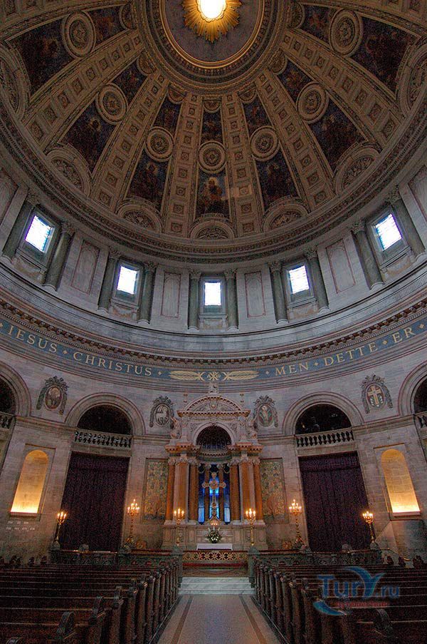 Эта церковь, пожалуй, самая величественная церковь Копенгагена. Прообразом для проекта церкви послужил Собор св.Павла в Риме. По замыслу архитектора, норвежский мрамор должен был стать основным материалом для строительства, но как это не прозаично, денег не хватило. Стройку "заморозили", и лишь через 150 лет, в 1894 году, некое частное лицо изыскало средства для окончания строительства. Правда, размерами церковь вышла на треть меньше, чем предполагалось, и на её сооружение пошло больше известняка, чем мрамора.