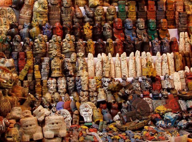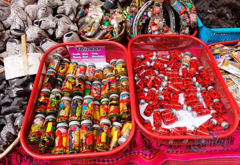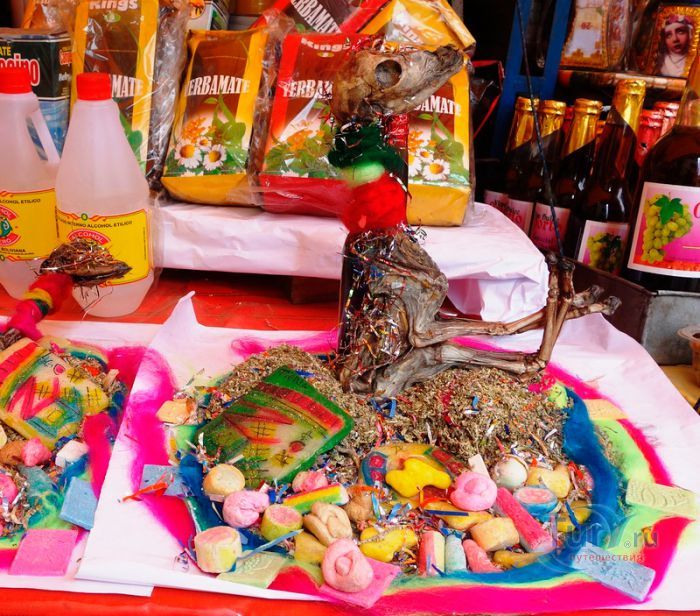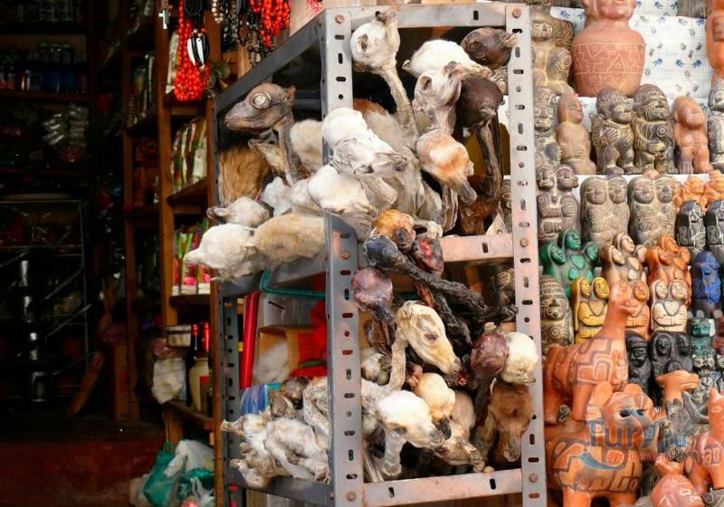 Рынок Ведьм или Меркадо-де-Брухас является одной из главных достопримечательностей Боливии, окутанный тайнами, легендами и небылицами. До Рынка лучше добираться пешком, гуляя древними и запутанными улочками города Ла-Пас. Именно пешие прогулки дадут возможность в полной мере впитать в себя окружающую атмосферу. Ведьмин рынок в Ла-Пасе единственный в мире «торговый центр», который специализируется на продаже товаров для ведьм, колдунов, знахарей и шаманов. Безусловно, вид рынка, его специфического товара и продавцов – весьма странный, но в этом вся его прелесть. На этом рынке можно набрать «потребительскую корзину» на все случаи жизни. Огромный выбор амулетов, которые приносят счастье и удачу. Для различных колдовских манипуляций продаются сушеные травы, части лягушек и насекомых, семена и, другие увлекательные ингредиенты, используемые в ритуалах и обрядах. Тем, кто пришел на Меркадо-де-Брухас не за магией, предлагается большое количество различных украшений из серебра, вязаные изделия из шерсти ламы и альпаки (это миниатюрный вид ламы), статуэтки из дерева или глины и много других интересных вещей. Самый ошеломляющий товар на ведьмином рынке – высушенные зародыши ламы или альпаки. Без них не обходится ни один ритуал: все желания-амулеты собирают в одном месте. Сверху непременно кладут зародыша ламы или альпаки, которого даже можно принарядить, чтобы задобрить. Провести ритуал можно где угодно – в домах, в частных магазинах, в офисе фирмы. То есть это что-то вроде православного освящения. Считается, что через некоторое время обязательно сбудутся все мечты: появится настоящий трактор или пекарня, муж или жена, ребенок и вообще счастье в личной жизни. Говорят, что тот, кто закопает эмбриона ламы в углу своего нового жилища, навсегда убережет себя от разных напастей. Даже если зародыши ламы не понадобятся для колдовства или целительства, то увидеть их – само по себе уникальное зрелище. На рынке Ведьм туристам не советуют фотографироваться и делать снимки товара. Боливийцы искренне верят, что фотографируя, вы забираете частичку их души, ослабляете их здоровье.