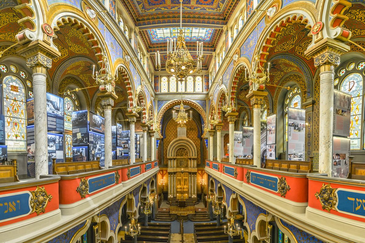 Построенная в 1905-1908 гг. синагога стала самой молодой, и при этом самой большой синагогальной постройкой в Еврейской общине Праги ( внутри синагоги имеется 850 мест). В стиле постройки преобладает сецессионый (от чешского слова secese – аналог стиля модерн) вариант стилизации мавританского стиля. В интерьере преобладает так называемый венский модерн; росписи стен и архитектурных элементов очень яркие, со сложными орнаментальными рисунками и узорами.