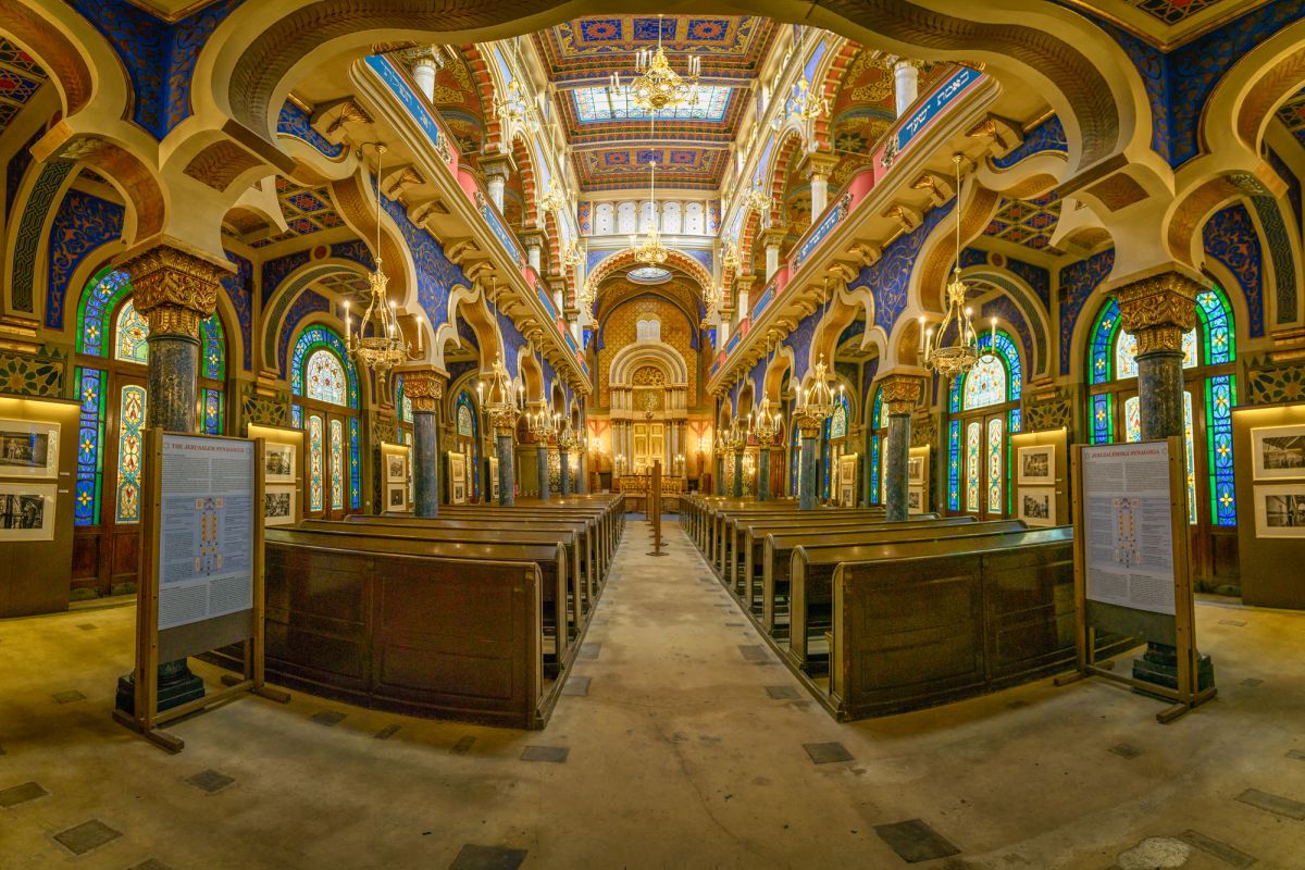 Самая молодое и в то же время самое большое здание синагоги в пражском Еврейском квартале, строительство синагоги в псевдомавританском стиле было начато 26 июня 1905 г. и закончено 1 сентября 1906 г. по проекту венского архитектора и опытного строителя синагог Вильгельма Стяссны (Wilhelm Stiassny) и осуществлялось архитектором Алоисом Рихтером (Alois Richter). Убранство интерьера, цветные декорации нефа, настенные росписи и штукатурные работы обеспечивала фирма Франтишка Фрёлиха (František Fröhlich). Фасад здания сделан в форме характерной арки с большим окном-розеткой, в котором изображена шестиконечная звезда Давида. Синагога была построена взамен синагогальных построек, которые были разрушены в результате расчистки квартала. Центр западного фасада обрамляет надпись на иврите и на чешском языке: «Это Врата Господни, сквозь них проходят праведные. Разве у нас не единый Отец? Разве не сотворил нас единый Бог?» По обе стороны входа находятся две башни. В синагоге 850 мест, боковые галереи предназначены для женщин, к ним ведут отдельные входы. Ковчег Святыни Торы с завесой «парохет» украшен мотивами виноградной лозы. Над ними расположены скрижали Моисея с 10 заповедями.