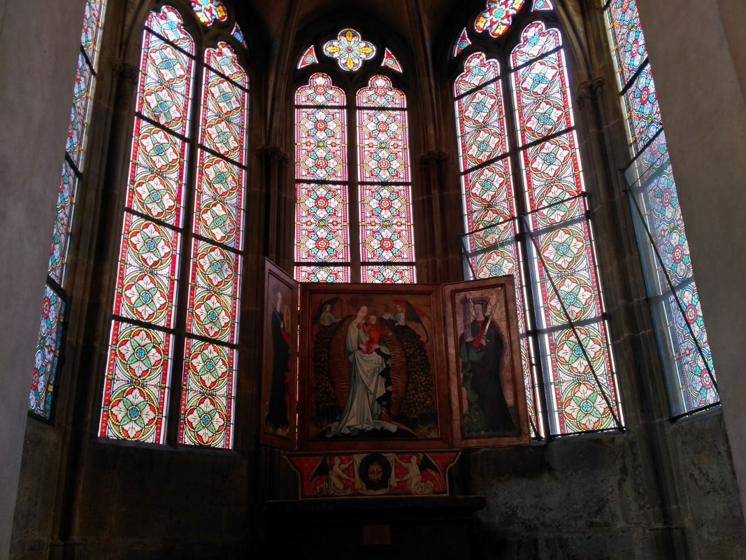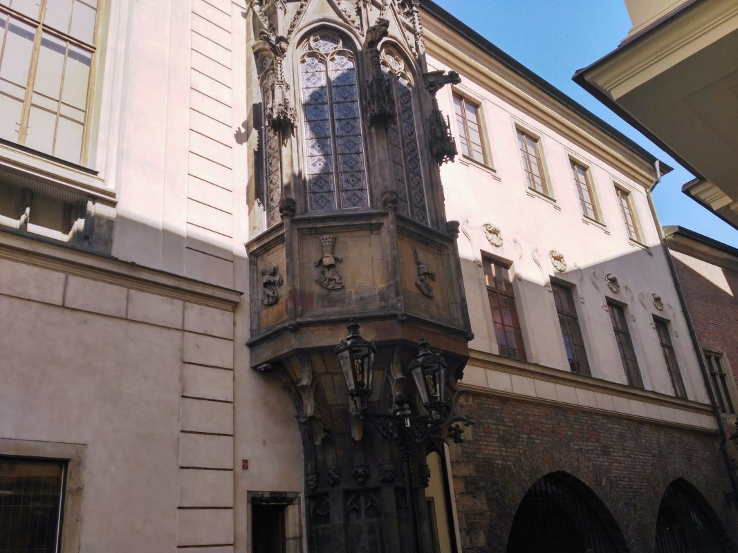 С другой стороны зала находится небольшая часовня, выходящая на улицу готическим эркером, украшенная мраморным памятником гуманиста Матоуша Колина из Хотержины (Matouš Kolín z Chotěřiny), изготовленным в 1568 г. От барочного портала, сделанного Канькой по стороны Железной (Železná) улицы ведет в зал оригинальная лестница, украшенная картинами Ричарда Визнера (Richard Wiesner), вторая лестница ведет в зал со стороны Фруктового рынка (Ovocný trh).
