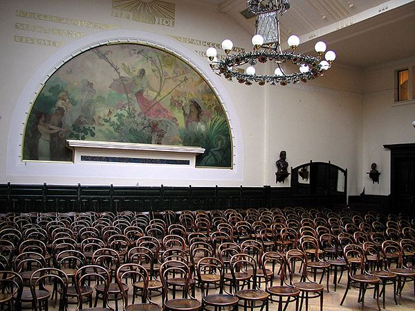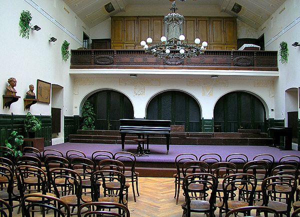В прекрасном здании в стиле модерн на влтавской набережной находится концертный зал со стеклянным потолком и небольшим органом. В зале помещены бюсты хормейстеров; прекрасным декором является и люнет «Чешская песня» Альфонса Мухи.