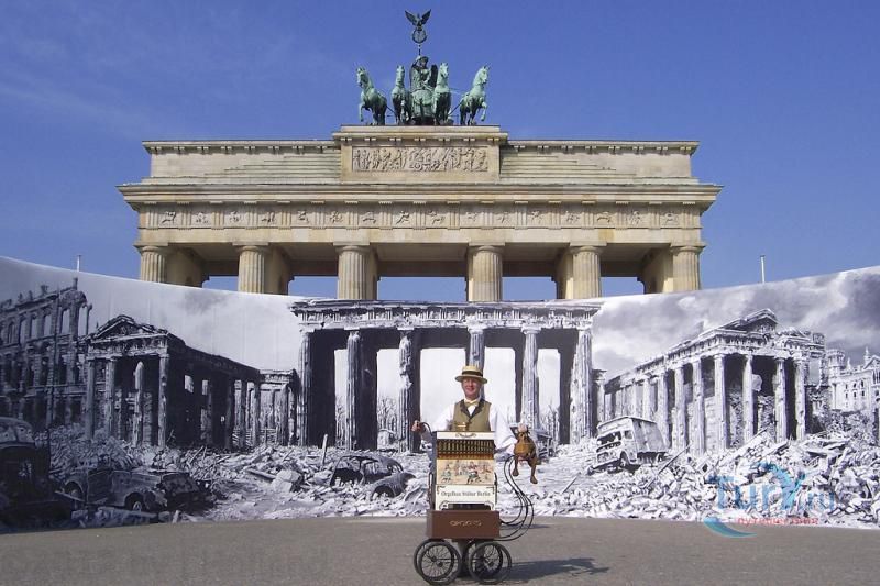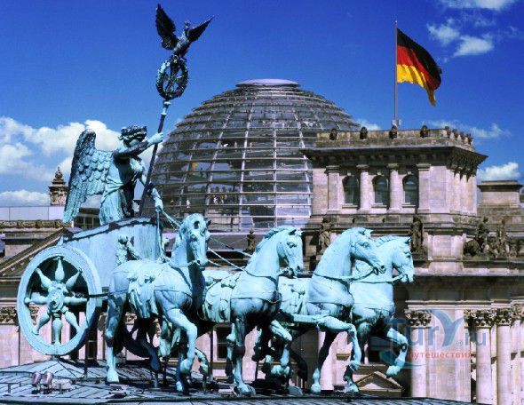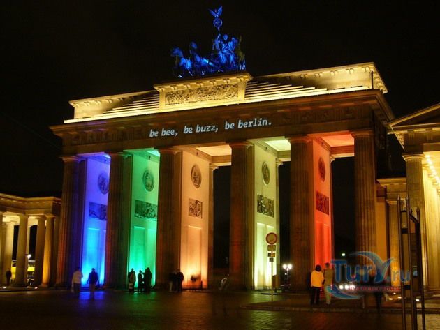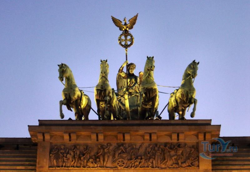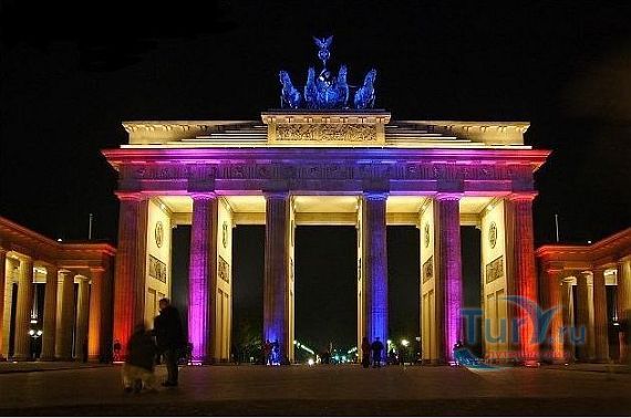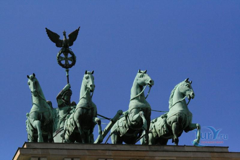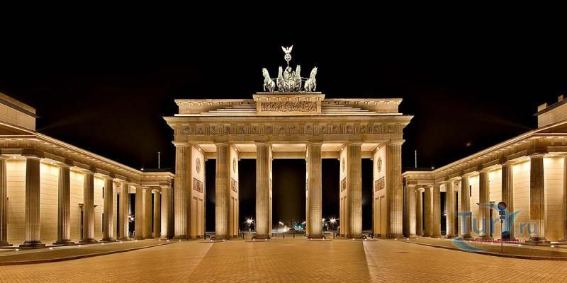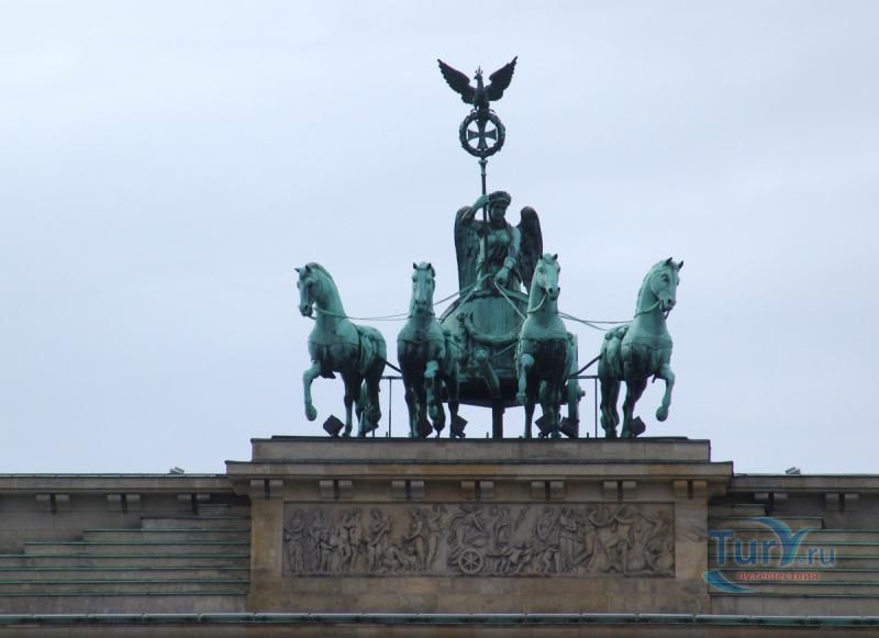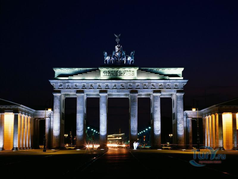 Это триумфальная арка, расположенная в самом центре Берлина, один из символов города. Ворота возвышаются на Парижской площади и являются напоминанием о том времени, когда в Берлин можно было въехать через них. Ворота были заказаны Фридрихом Вильгельмом II в знак мира и спроектированы Карлом Готтхардом Лангхансом в 1788 – 1791 гг. Высота Бранденбургских ворот 26 метров, длина – 65.5 метров и толщина 11 метров. Бранденбургские ворота состоят из 12 греческих дорических колонн, по шесть с каждой стороны. На их создание авторов вдохновили древнегреческие Пропилеи - монументальный вход в Парфенон в Афинах. Над воротами возвышается знаменитая и часто фотографируемая Квадрига работы Готфрида Шадова, построенная в 1793 году, на которой изображена статуя богини Мира, правящая колесницей, запряженной четырьмя конями.