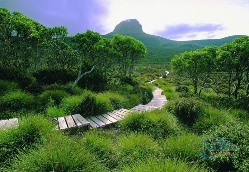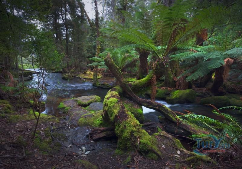 Растения-подушки раскинулись зеленым бархатом в отдаленном горном Юго-Западном Национальном парке. Около 250 миллионов лет назад Тасмания вместе с остальной Австралией, Новой Зеландией, Антарктидой, Южной Америкой, Африкой и Индией входила в колоссальный южный континент Гондвану. Огромный континент занимал более половины земного шара, и значительную часть его покрывал дождевой лес умеренного пояса. Большой его участок, признанный природным наследием, занимает площадь 10813 кв.км и включает в себя четыре национальных парка, два государственных заповедника, две природоохранные зоны и государственные леса. Подлинно нетронутая природа становится все более редким явлением, так что огромные пространства дождевого леса представляют собой уникальные и бесценные природные ресурсы, которые необходимо ценить и беречь. Эти дикие места тянутся от побережья к сердцу Тасмании, поднимаясь на 1615 метров над уровнем моря. В прибрежной полосе дождевого леса умеренного пояса представлены и вечнозеленые и листопадные деревья. В этом влажном и мягком климате прекрасно развиваются, достигая колоссальной высоты многие виды деревьев. Они дают древесину чрезвычайно высокого качества, ценимую по всему миру, отчего над ними постоянно нависает угроза чрезмерной коммерческой вырубки. Дождевые леса Тасмании резко контрастируют с дождевыми лесами тропиков тем, что здесь растет очень немного видов деревьев - редко больше восьми, хотя и наблюдается буйно разросшийся подлесок и эпифиты, такие как мхи, папоротники и лишайники, борющиеся между собой за жизненное пространство. Из деревьев характерны южный бук, который вместе с атротаксисом остистым (до сих пор сохранились отдельные древние особи, чей возраст превышает 2000 лет) и атротаксисом кипарисовым представляет собой истинный реликт покрывавших Гондвану лесов. В некоторых местах заросли эвкалипта, самого высокого растения в мире, образуют лесной полог на высоте 90 метров. В более высоких областях борются за выживание растения альпийского пояса, деревья там низкорослые и узловатые из-за холода и ветров. Отделение Австралии от Гондваны породило уникальную фауну сумчатых и однопроходных млекопитающих, а последующее отделение Тасмании от Австралии создало условия для появления эндемичных видов животных, птиц и растений. Среди 150 зарегистрированных видов птиц есть и редчайший в Австралии ярко окрашенный оранжево-брюхий попугайчик.Также фауна включает четыре эндемичных вида сумчатых: тасманийского дьявола, тасманийского беттонга, рыжего валлаби и сумчатого волка, когда-то широко распространенного, а теперь считающегося вымирающим даже в этих, практически не тронутых человеком, местах.