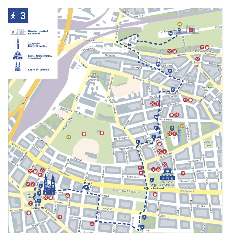 1 Náměstí Míru → 2 костел св. Людмилы (kostel sv.Ludmily) → 3 Театр на Виноградах (Divadlo na Vinohradech)