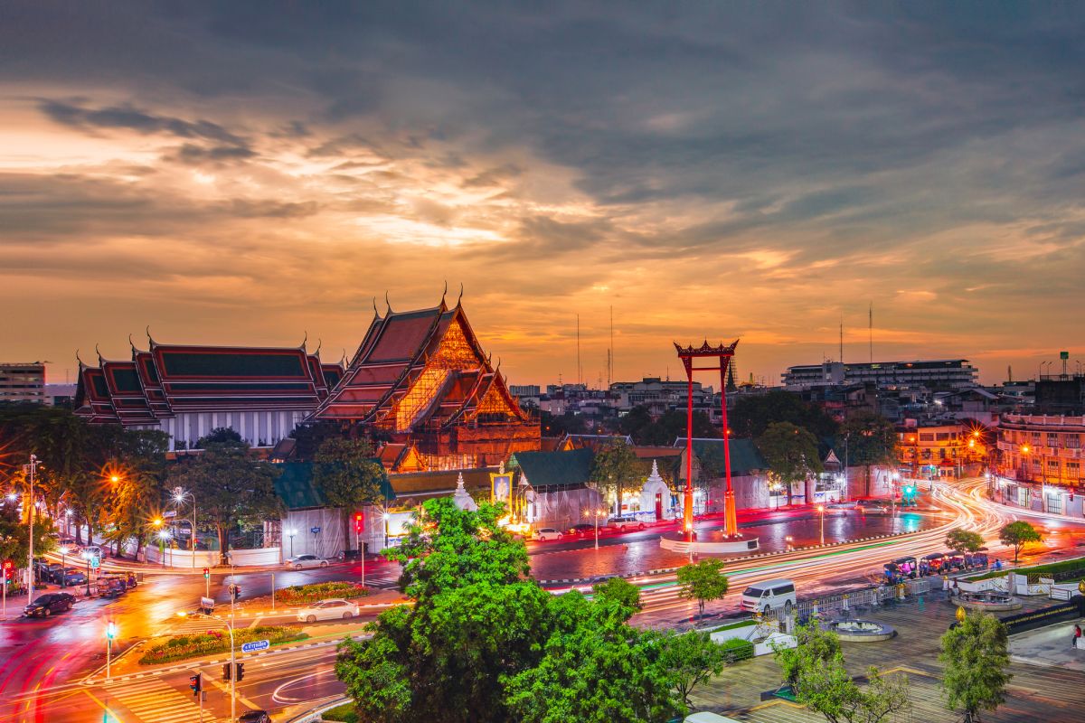 Район Сан-Чингча был центром Бангкока со времен Раттанакосин до наших дней. Гигантские качели или Сан-Чинча были построены во времена правления Рамы I после того, как он решил расширить город с запада или Тхонбури со времен короля Таксина на восток. Город был окружен раскопками канала. Затем король Рама I выбрал центр города и сделал его местом для святынь, храмов браманизма и Гигантских качелей. «Сан-Чингча» или гигантские качели до сих пор остаются выдающимся символом Бангкока. Это два возвышающихся красных столба, стоящих на огромном камне на высоте 21,15 метра. Пьедестал в форме цветка лотоса изготовлен из белого открытого бетона. На арке пьедестала установлен камень с надписью, рассказывающий историю Сан-Чинча. Пара центральных столбов и две пары свай с капителью были сделаны из круглых, точеных стволов тикового дерева. Рамка, соединяющая обе капители, была красиво вырезана. Все они были окрашены в красный цвет. Это один из архитектурных памятников, построенных для церемонии качания или церемонии три-ямпаваи из древнего индуистского эпоса. Гигантские качели, которые можно увидеть сегодня, - это новые качели, которые были перестроены в период с 11 по 13 сентября 2007 года. Новые столбы были сделаны из золотых стволов тикового дерева из Праэ. Гигантские качели стали одной из самых исторически важных туристических достопримечательностей Бангкока, хорошо известной среди тайцев и иностранцев. Архитектура в районе рядом с Гигантскими качелями, включая район Пхра Накорн, все еще остается в стиле раннего периода Раттанакосин.