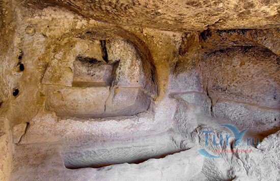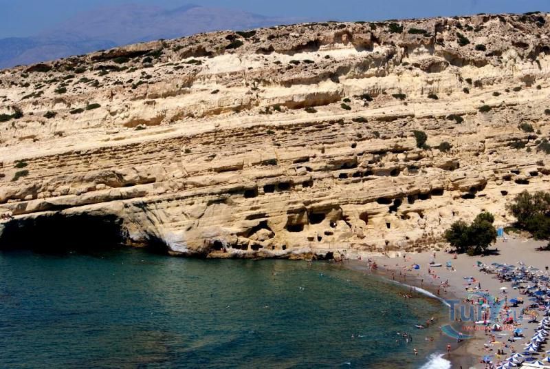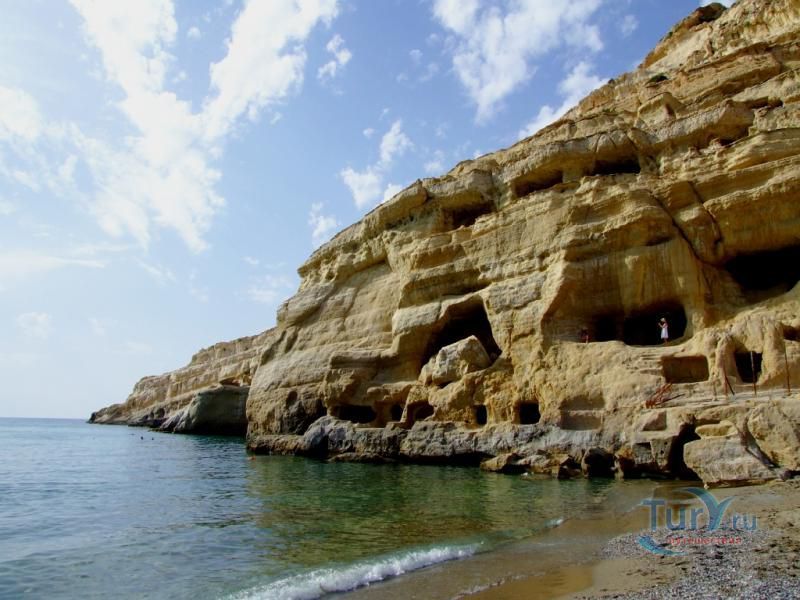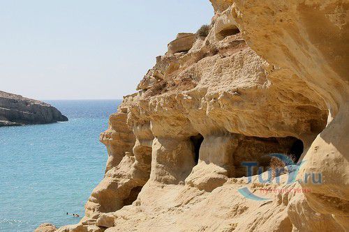 Множество пещер было выдолблено тысячи лет назад в мягком белом известняке в северо-западной "стене" залива Paximadia. Искусственные пещеры были созданы в эпоху неолита, здесь жили люди, причем, в некоторых пещерах было несколько помещений, а ниши украшены резным орнаментом, многие из них имеют номера, лестницы, кровати или окна. В I и II веках они использовались как римские пещеры-гробницы. Одну из пещер называют "Brutospeliana", потому что, согласно легенде, ее часто посещал римский Брут. В 60-70-х годах XX века этот райский уголок облюбовали хиппи, и даже жили здесь пока в 70-х годах местные церкви не изгнали их. И археологии опечатали пещеры.