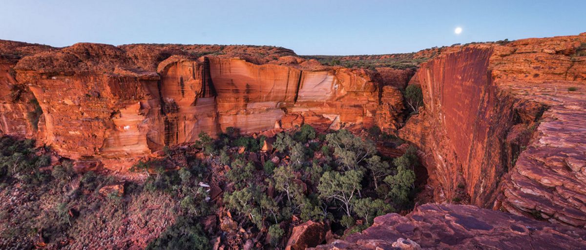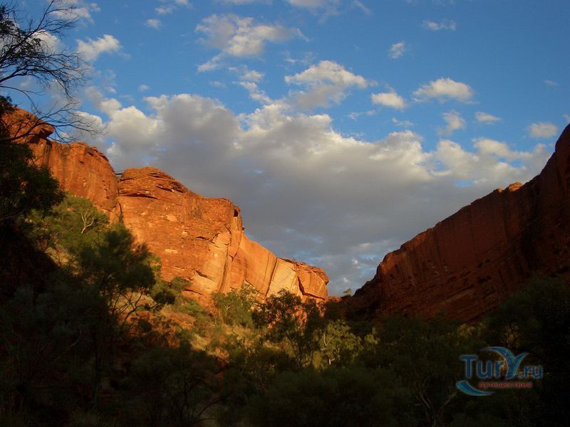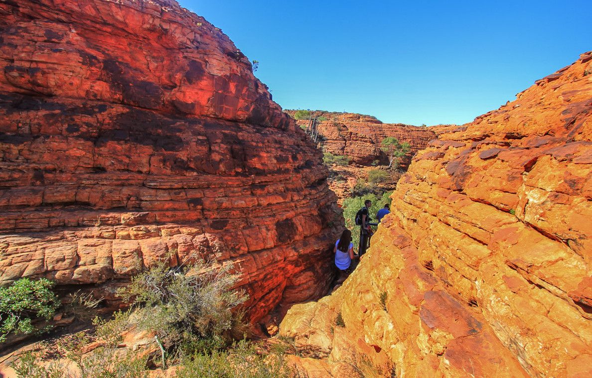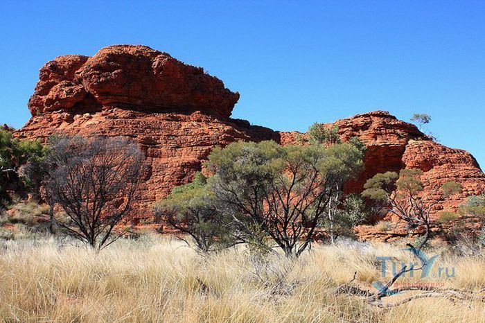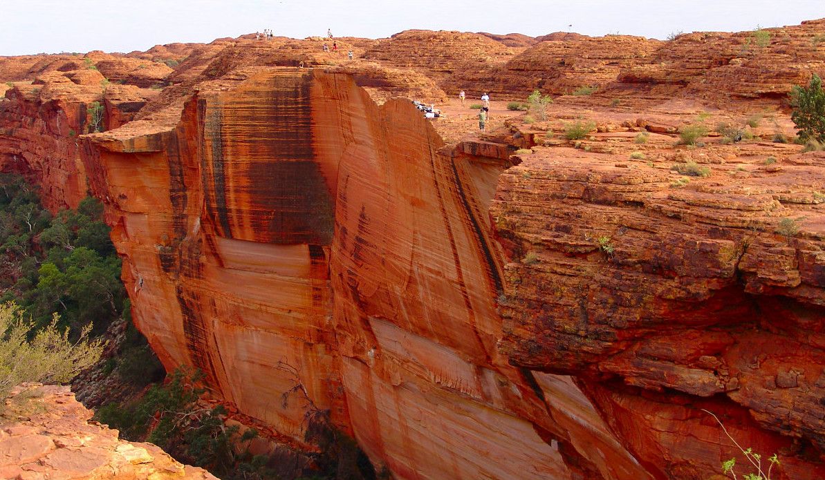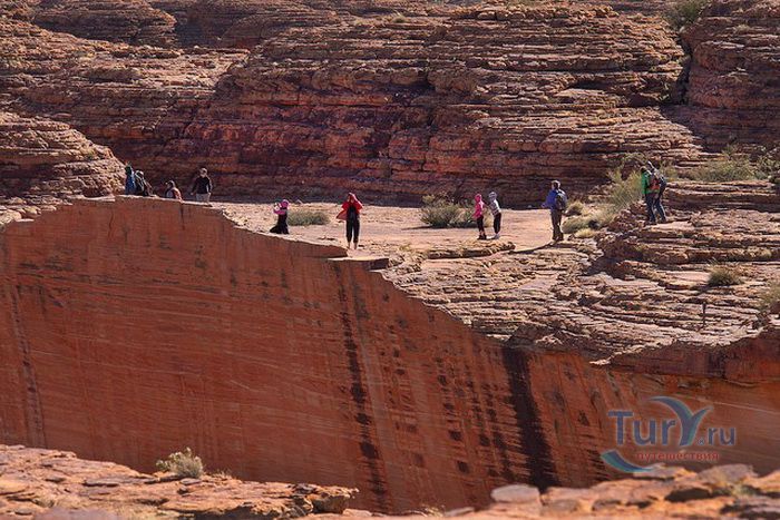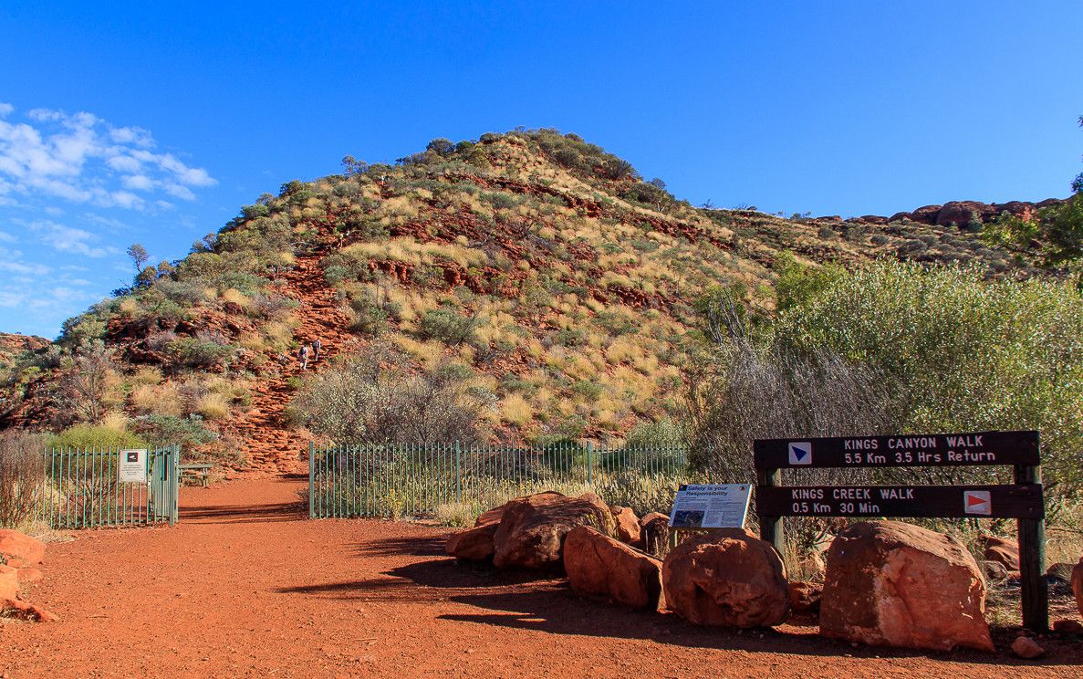 Сложный скалистый подъем к краю каньона вознаграждает путешественников изумительным видом, который особенно хорош на рассвете или на закате. Вообще, существует несколько маршрутов для желающих осмотреть каньон. Самый популярный - шестикилометровый маршрут Kings Canyon Rim Walk, занимает примерно 3-4 часа. Он позволяет насладиться потрясающими панорамами самого каньона и окружающими пейзажами, а также узнать об истории коренных жителей, которая насчитывает более 20 000 лет. Спустившись в каньон, можно полюбоваться на Сад Эдем - постоянный водоем в скале, окруженный пышной растительностью, и изучить необычные скальные образования Затерянного города.