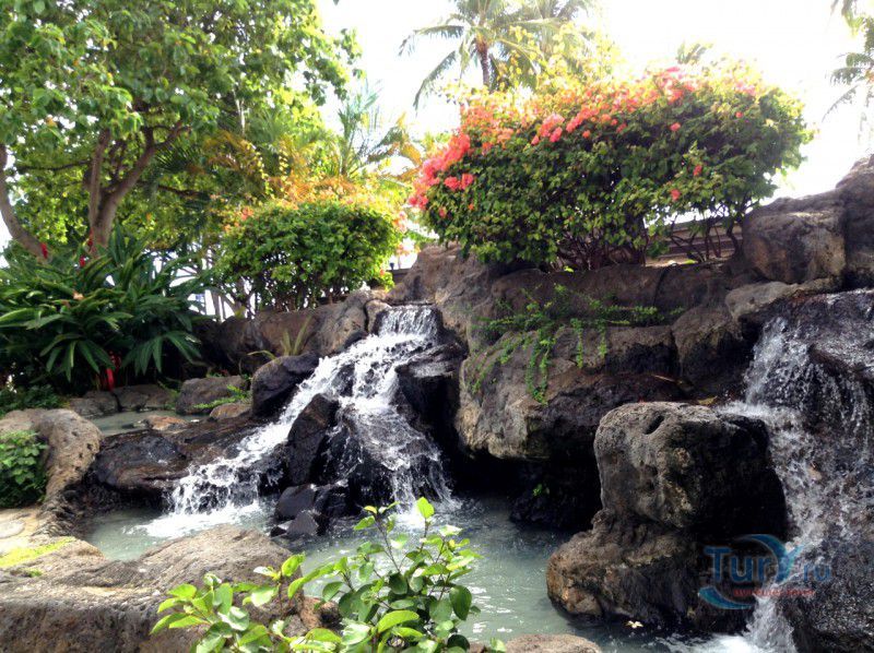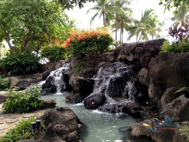 Композиция "Водопад на камнях" расположена на улице Калакауа Авеню (Kalakaua Avenue) у пляжа Кухио-Бич (Kuhio Beach) на Вайкики, в южной части Гонолулу. Мощные струи воды прорываются сквозь каменные глыбы и успокаиваются, очутившись в небольшом водоеме, дно которого усыпано золотистым песком. Берега водоема поросли буйной тропической зеленью и яркими каскадами цветов. Композиция "Водопад на камнях" - любимое место прохожих, дарящее прохладу в знойный день, и ласкающее слух журчанием воды. Это то место где любят фотографироваться туристы, которых на Вайкики очень много.