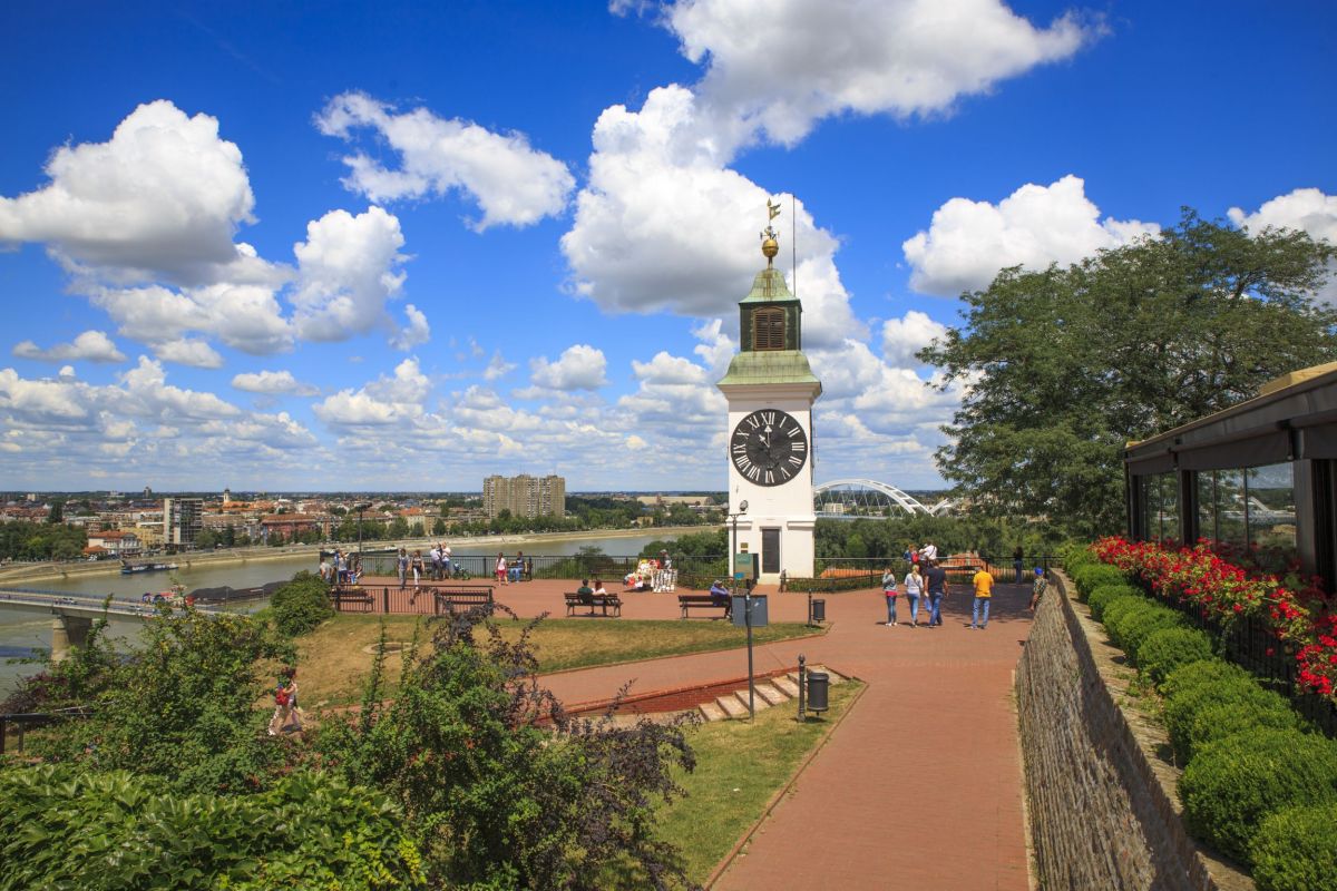 Часовая башня находится в верхнем городе крепости. На этом месте раньше была более старая постройка, которая была снесена в 18 веке. Радиус часов составляет более двух метров в длину, четыре циферблата направлены во все четыре стороны света, числа написаны римскими цифрами, а основные характеристики этих часов заключаются в том, что более длинная стрелка показывает часы, а более короткая - минуты. Этот тип часов требует ежедневного завода. На вершине башни есть флюгер и компас. Рядом с часовой башней находится так называемый длинный барак - двухэтажное здание второй половины 18 века. В этом здании в 1926 году находилась Авиационная школа унтер-офицеров Королевства сербов, хорватов и словенцев. Самым известным учеником был Франьо Клюз, пионер авиации во время Второй мировой войны. Одно из самых выдающихся зданий верхнего города - ворота Леопольда с передним планом в стиле барокко и подвесной мост, также с гербом и девизом монархии Габсбургов «Вирибусунитис» (объединенными силами).