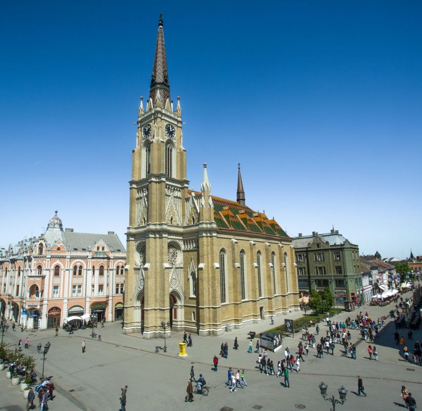 Римско-католическая приходская церковь имени Марии (также известная как Кафедральный собор) построена в неоготическом стиле в период с 1893 года. На площади Свободы она занимает значительное место, именно там, где вначале были старые церкви 18 века. Во время бунта (1849 г.) церковь загорелась, а после конфликта католическая община начала восстановление. В 1864 году эта церковь стала постоянным собором. К концу 19 века католическая община Нови-Сада решила построить новую представительную церковь. В 1891 году старая католическая церковь была разрушена, и началась кладка нового кирпича по проекту «baumeister» Георга Мольнара. Он построил трехнефную базилику со шпилем высотой 73 метра, что делает ее самой высокой церковью в городе. Внутри четыре алтаря, главный украшен тирольскими гравюрами. В окна встроены витражи из Будапешта, которые олицетворяют библейские мотивы, а также герольды известных католических семей из Нови-Сада. Эта церковь также служит концертным залом, особенно для органных концертов, так как есть один, датируемый 1895 годом. После пожара 1904 года церковь обновили; кровлю украшали шестиугольные эмалированные плиты. Бюст Георга Мольнара помещен в нишу под хором. Последняя реконструкция подчеркивает желтый кирпич, из которого была построена церковь, но с помощью особого света, который освещает стены и делает его самым узнаваемым зданием в Нови-Саде.