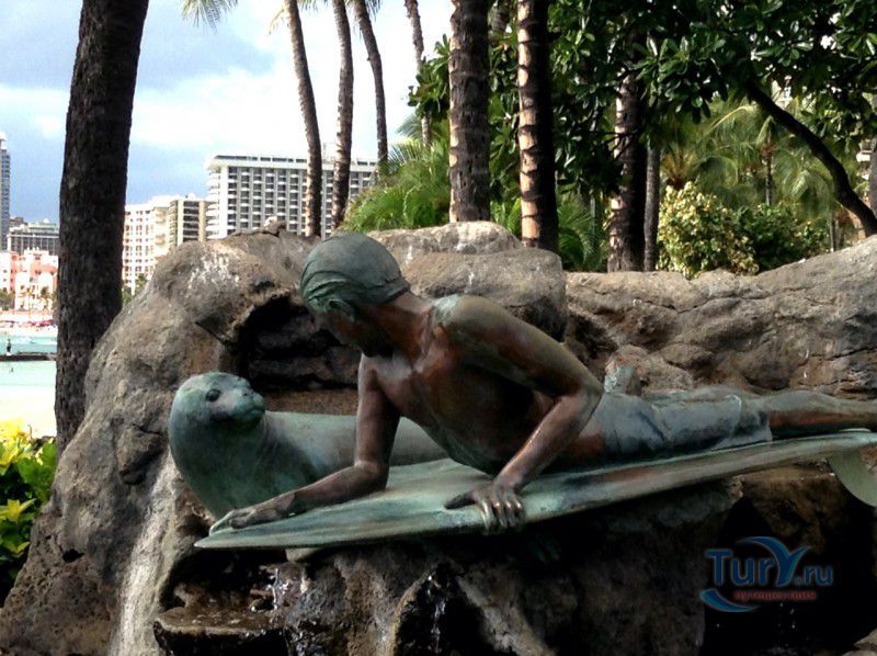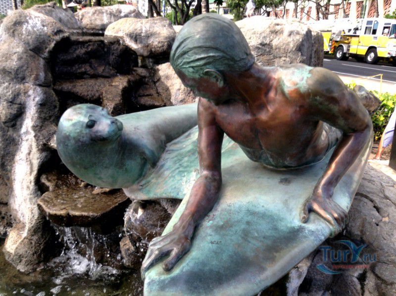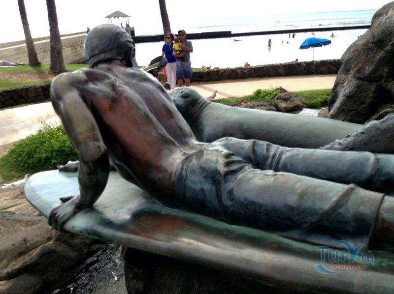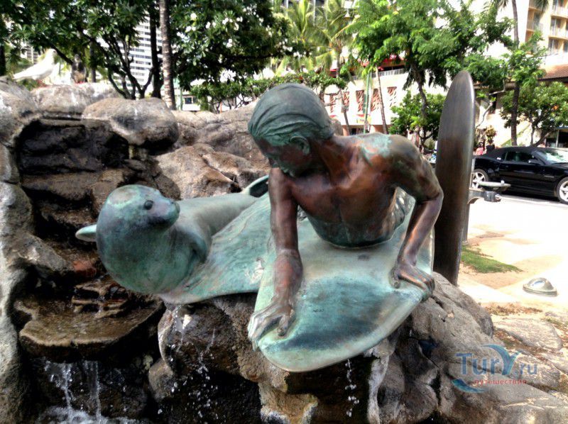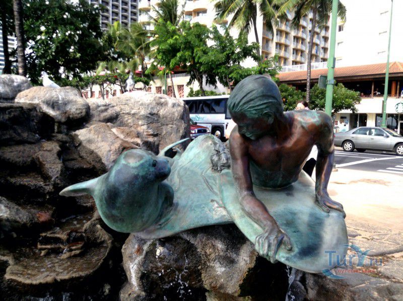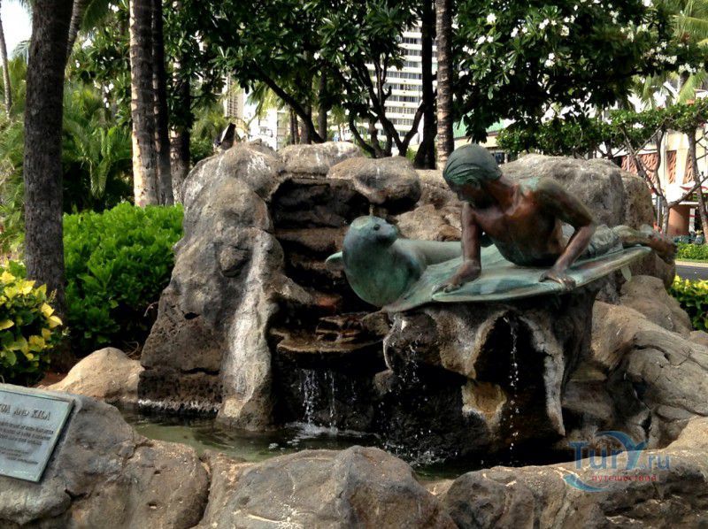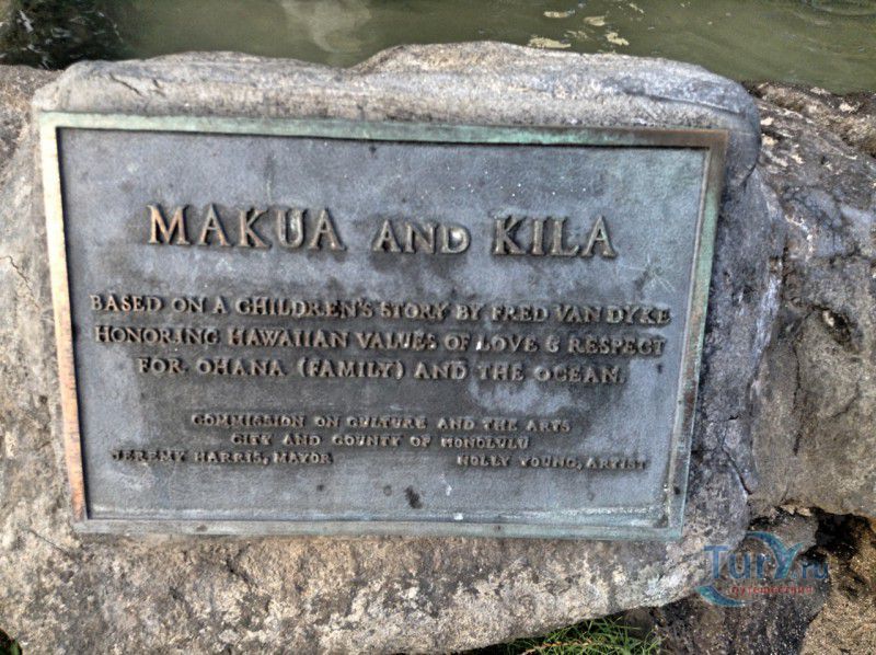 Скульптура Makua and Kila установлена прямо у пляжа Kuhio Beach в районе Вайкики - знаменитом районе Гонолулу на острове Оаху, на Гавайях.
