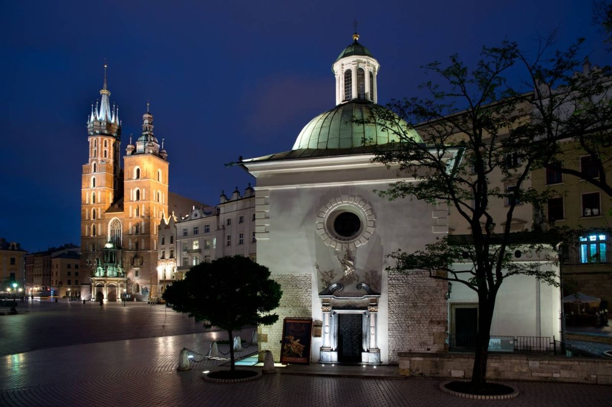 Что этот маленький, невзрачный костел делает на представительной, красивой Главной рыночной площади Кракова? К тому же стоит боком?