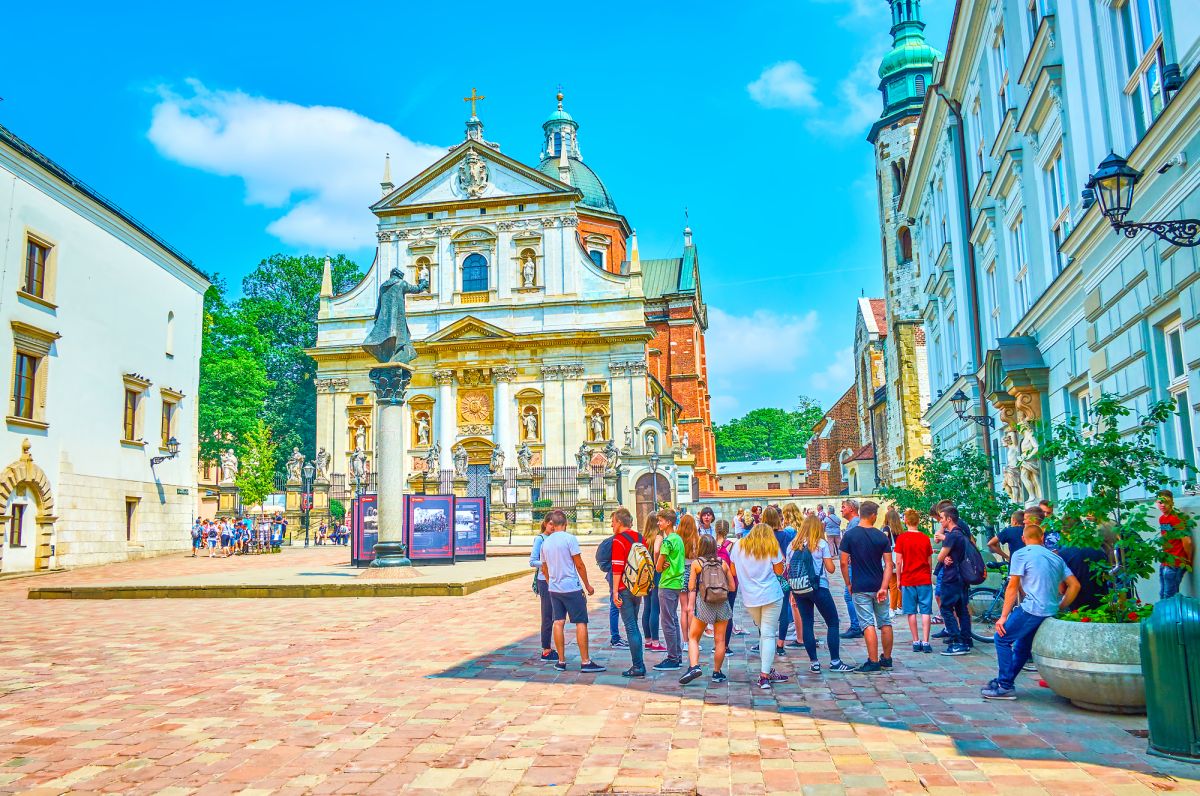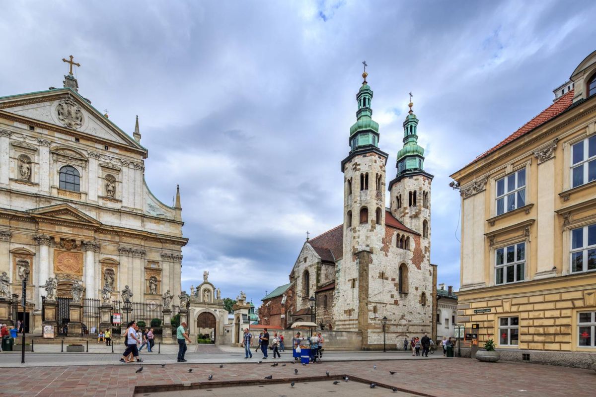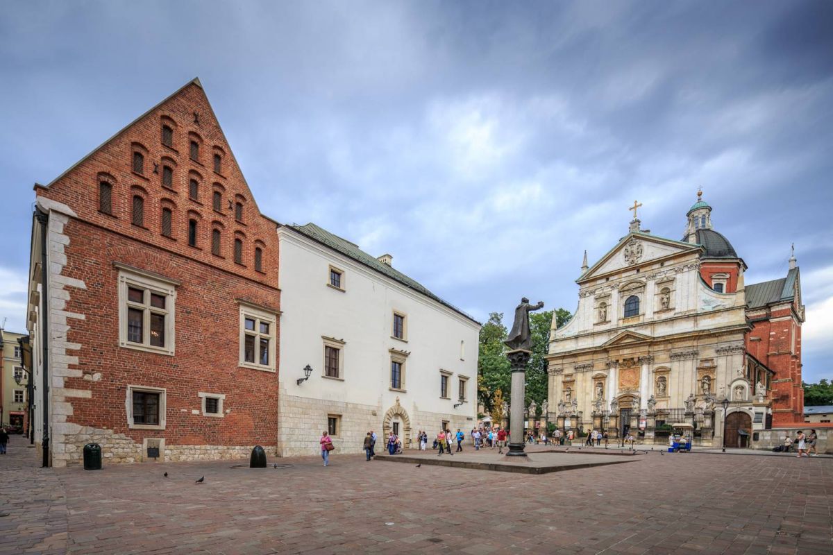 Если идти от Вавеля по улице Канонича или Гродска в сторону Главной Рыночной площади, можно выйти на площадь Святой Марии Магдалены. Отсюда можно полюбоваться впечатляющим фасадом бароккового костела святых Петра и Павла. Название площади происходит от стоявшего здесь когда-то средневекового костела. Он был разобран в начале XIX века, и сегодня о храме напоминают лишь контуры фундамента, отмеченные на площади.