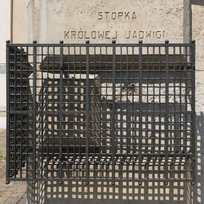 В действительности постройка связана с личностями монархов Св. Ядвиги и Владислава ІІ Ягелло, которые приказали воздвигнуть храм в конце XIV века. Ядвига упоминается в очередной легенде о любопытной детали костела, которую можно увидеть и сегодня. Это вмурованный снаружи, со стороны улицы Гарбарской, камень с отпечатком ступни. Согласно популярной легенде, однажды повелительница посетила строительную площадку и заметила, что у одного из строителей грустное лицо. Когда его спросили о причине огорчения, каменотес рассказал владычице о болезни жены и нехватке денег на ее лечение. Растроганная королева поставила ногу на каменную глыбу и отстегнула золотую пряжку с туфельки, чтобы отдать ее бедному работнику. После того, как Ядвига ушла, строитель увидел отпечаток ступни на камне. Он решил вмуровать камень в стену костела, чтобы сохранить память об отзывчивости правительницы.
