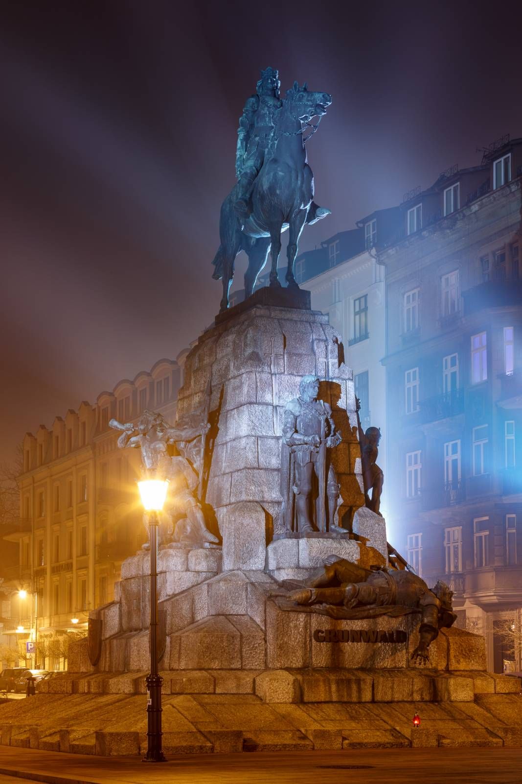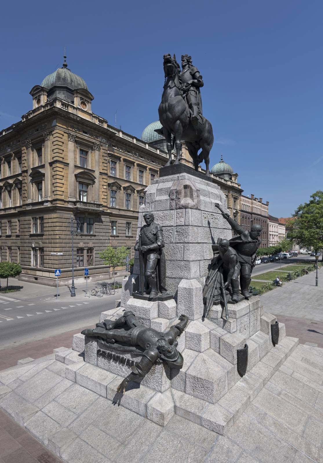 В центре площади возвышается памятник в честь 500-летия Грюнвальдской битвы, в которой польско-литовские войска одержали победу над Тевтонским орденом. Памятник Грюнвальдской битве, а точнее конная статуя польского короля Владислава Ягайло, был возведен в 1910 году. «Предкам к славе — братьям к поощрению», можно прочитать на постаменте памятника. Это были времена, когда Польши не существовало на карте, а в Кракове правил оккупант – Австро-Венгерская империя. Средства на памятник выделил всемирно известный пианист Игнаций Ян Падеревский. Возведение происходило в условиях строгой конспирации: даже скульптор Антоний Вивульский не знал, каким будет конечное назначение его проекта. Торжественное открытие состоялось 15 июля 1910 года и стало основным пунктом празднования 500-летия Грюнвальдской битвы. Постепенно оно переросло в патриотическую демонстрацию, насчитывающую почти 150 тыс. человек. Тогда заказчик памятника Игнаций Ян Падеревский обратился к толпе: «Творение, на которое мы смотрим, не возникло из ненависти. Его родила глубокая любовь к родине не только в ее былом величии и нынешней немощи, но также в ее ярком, сильном будущем».
