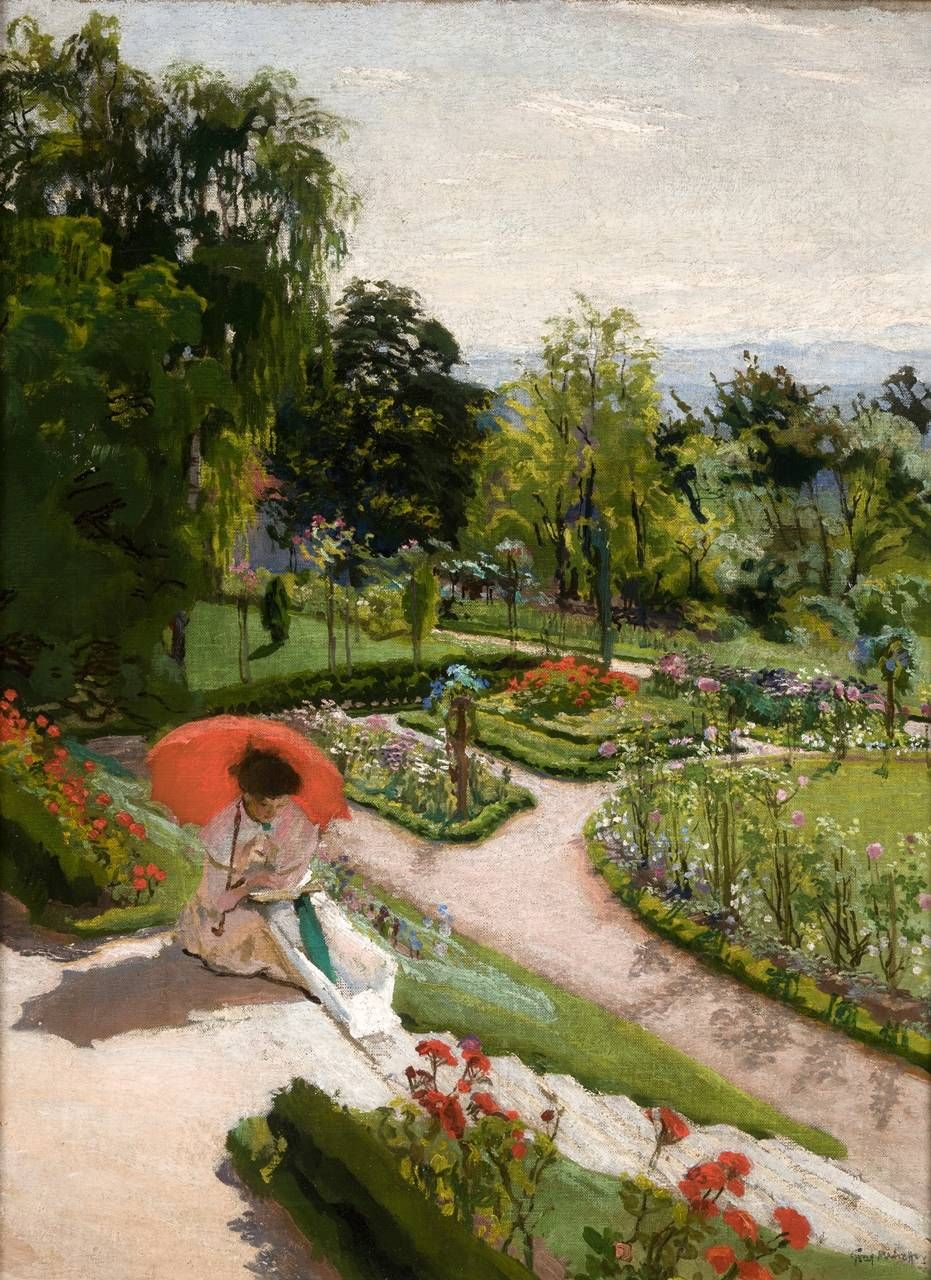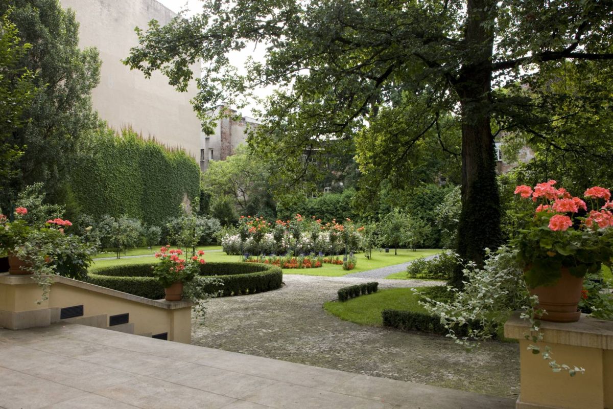 На основании сохраненной иконографии была воссоздана первоначальная система дорожек и форма рабаток. Центральную часть сада составляет обширный газон с замечательной клумбой с розовыми деревьями по кругу и розой посредине. Здесь были посажены такие же виды растений, как при жизни Мегоффера, в частности, сирень, жасмин, фруктовые деревья, фиалки и майские ландыши; на клумбах и рабатках можно любоваться пионами, анютиными глазками, королевскими лилиями, а до поздней осени – множеством сортов роз. Надо всем этим возвышается памятник природы – могущественный черешчатый дуб.