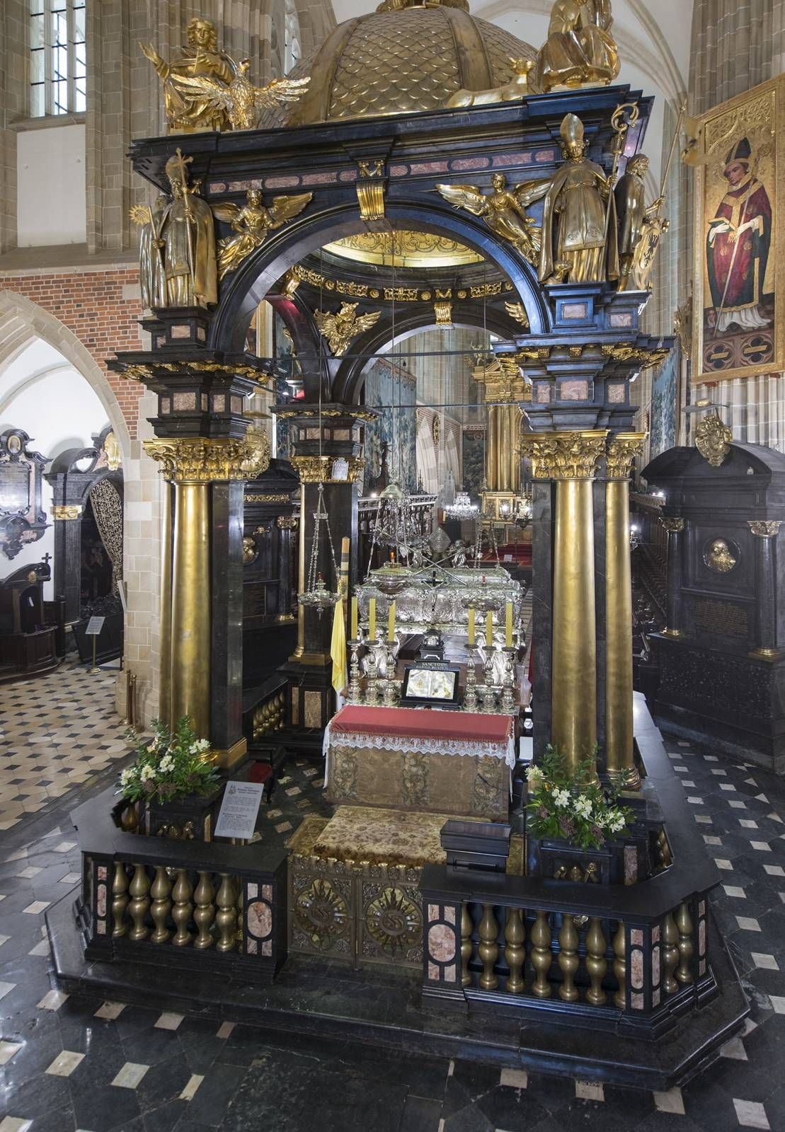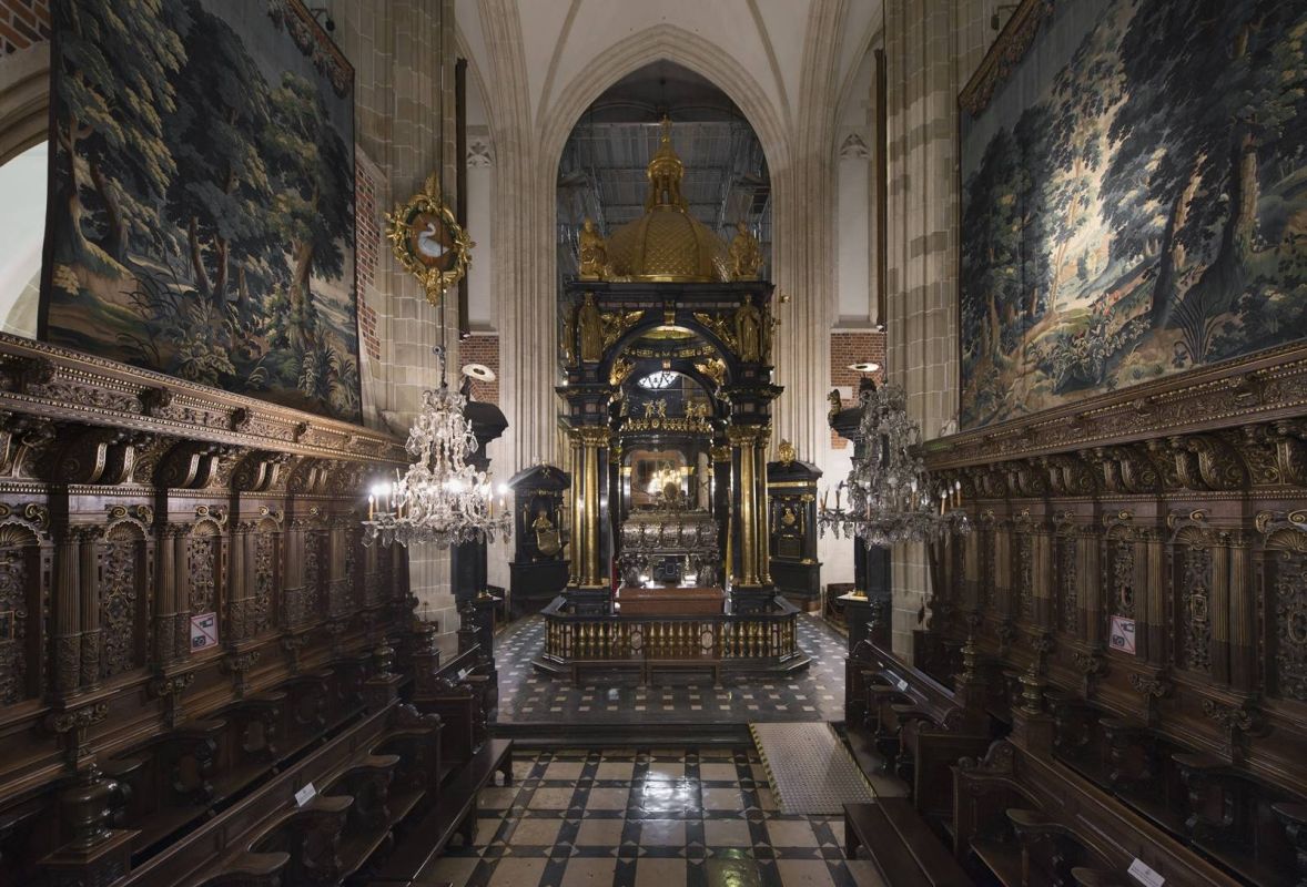 Главный вход в собор с западной стороны ведет между двумя готическими часовнями. Над лестницей подвешены на цепях кости кита и шерстистого носорога (считалось, что такие детали магически защищают от зла). Главные ворота XIV века окованы железом с повторяющимися монограммами короля Казимира Великого.