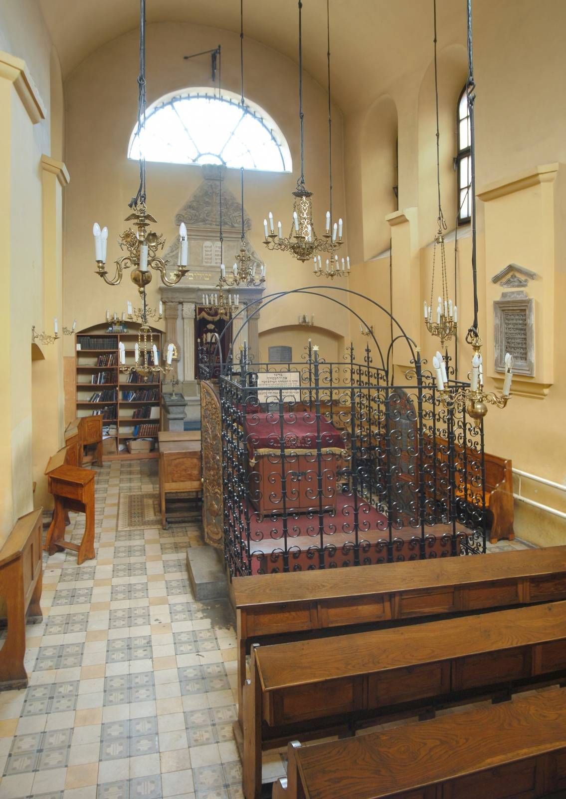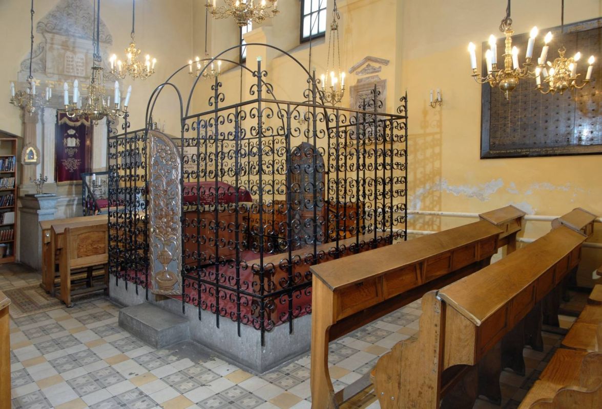 - каменный арон ха-кодеш эпохи позднего Ренессанса, заключенный в двойные пилястры и увенчанный досками декалога