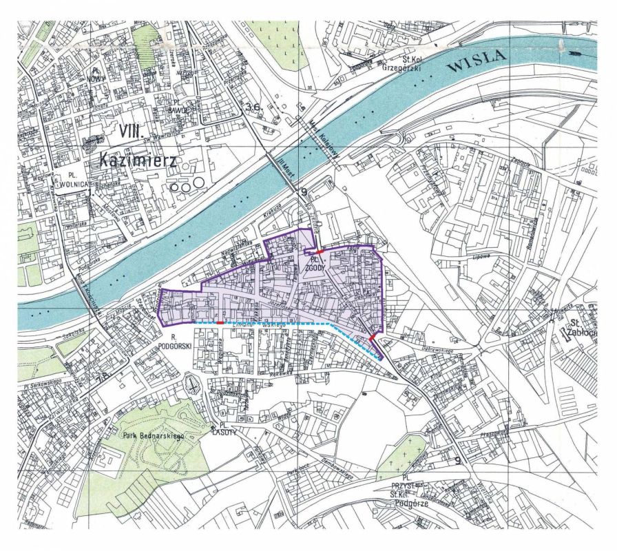 «Еврейский жилой квартал» был окружен трехметровой стеной с аркадным обрамлением, издевательски стилизованным в виде мацев – еврейских надгробий. В гетто вели четверо ворот; главные с надписью «Jüdischer Wohnbezirk» находились у перекрестка улицы Лимановского и Рынок Подгурски.