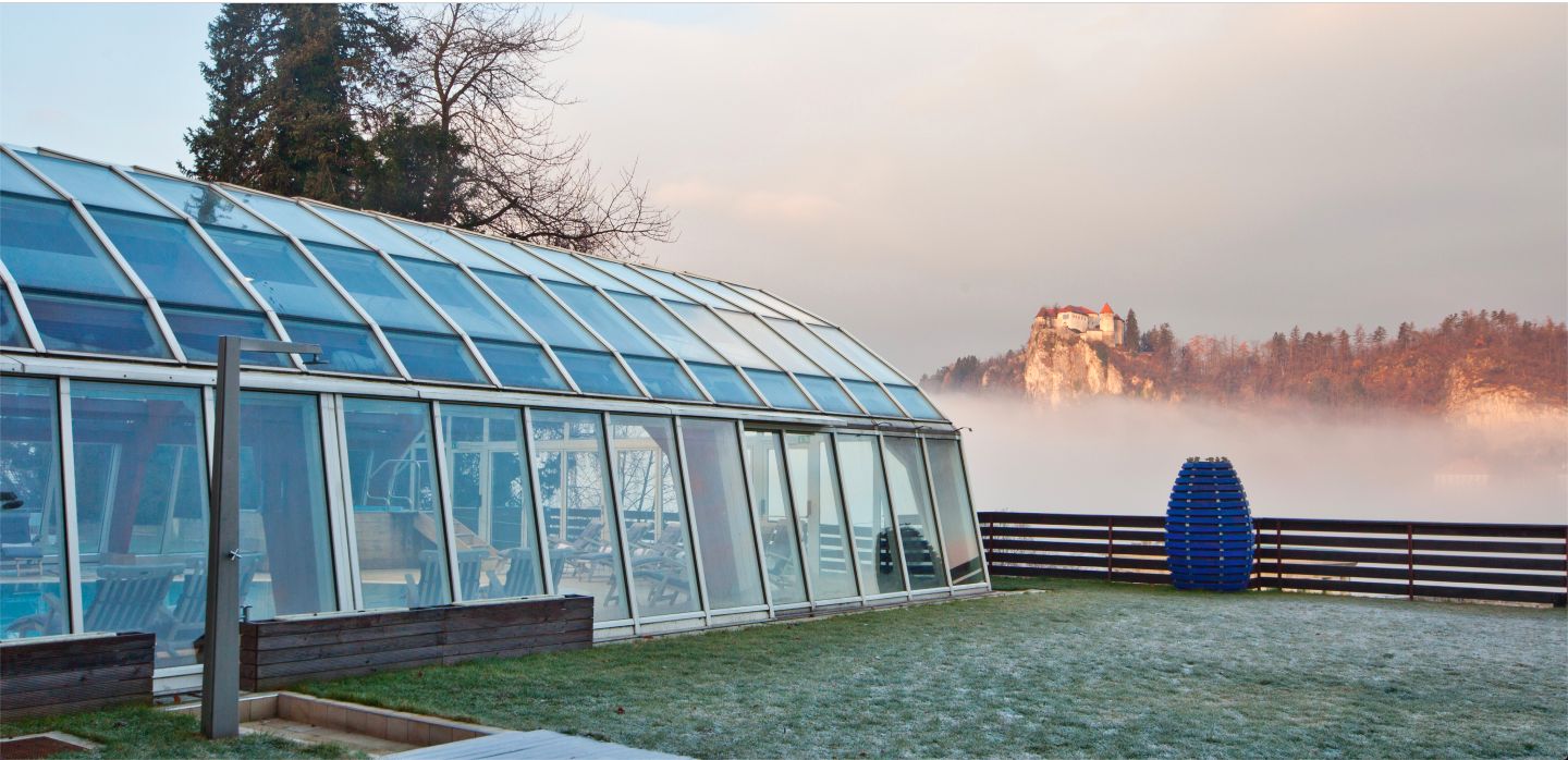 На террасе отеля Kompas расположен большой бассейн со стеклянными стенами, откуда в любое время года открывается уникальный вид на озеро и замок. Стеклянные стены открываются в теплое время года, обеспечивая доступ к панорамной террасе, где гостям предоставляются удобные шезлонги.