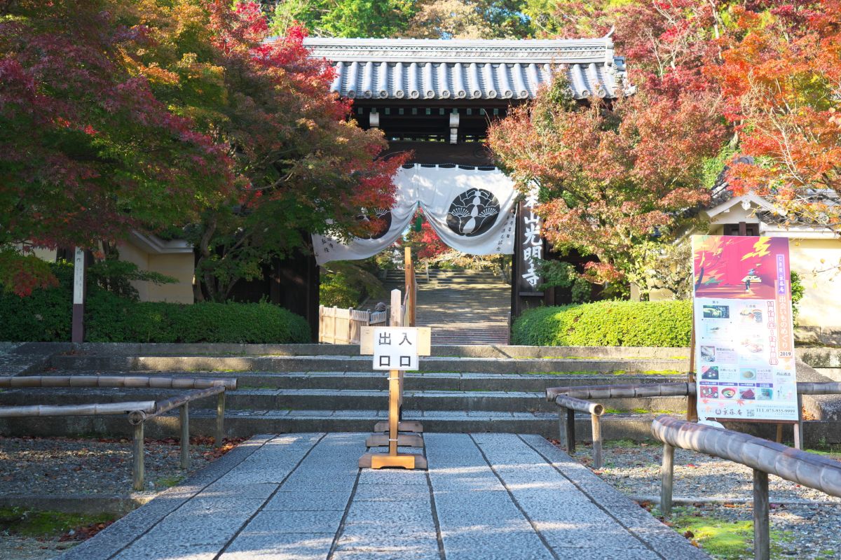 Когда вы входите в главные ворота храма, дорога делится на две части. Пологий спуск, ведущий в главный зал справа от вас, называется «Омотэсандо». Этот подход разработан таким образом, чтобы на него легко могли подняться как женщины, так и пожилые люди, и известен как «женский склон». Дорога от ворот Чокусимон до ворот Сомон слева широко известна как «Кленовая тропа», и осенью красочные листья по обеим сторонам дороги, которая тянется примерно на 200 метров, образуют ярко окрашенный туннель осенних цветов. Тропа - одно из самых известных мест для осенних листьев в Киото.