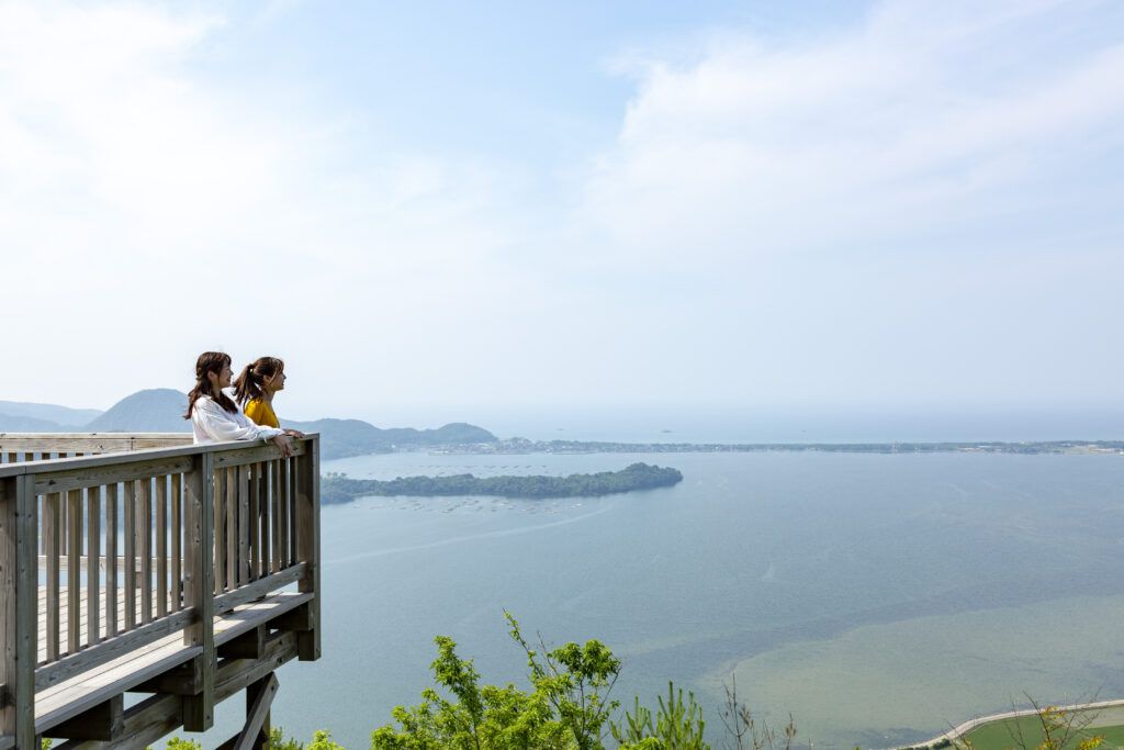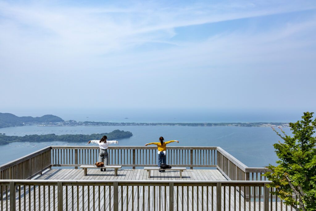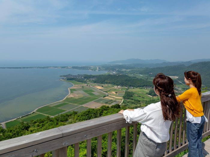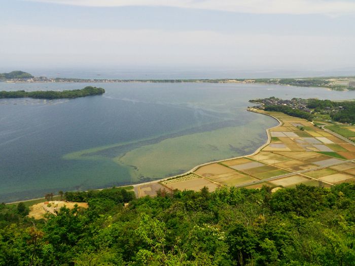 Гора Кабутояма - гора высотой 191,7 м, возвышающаяся над заливом Кумихама. Округлая форма горы напоминает форму самурайского шлема (Кабуто), отсюда и название Кабутояма (яма означает гора). До смотровой площадки на горе Кабутояма на вершине горы можно добраться пешком примерно за 20 минут по ухоженной тропе, начинающейся у подножия горы. Деревянная площадка обсерватории обращена к заливу Кумихама, где уникальный горный рельеф образовал тонкую песчаную косу под названием Сотэнкё, которая окружает залив и отделяет спокойные воды залива от Японского моря. Отсюда открывается захватывающий вид на контрастирующие зеленые рисовые поля на фоне синего моря. «Сётэнкё» переводится как «маленький небесный мост» и, как говорят, назван в честь одного из самых известных живописных видов Японии, Аманохасидатэ, большой песчаной косы, которая представляет собой мост в небеса в японской мифологии.