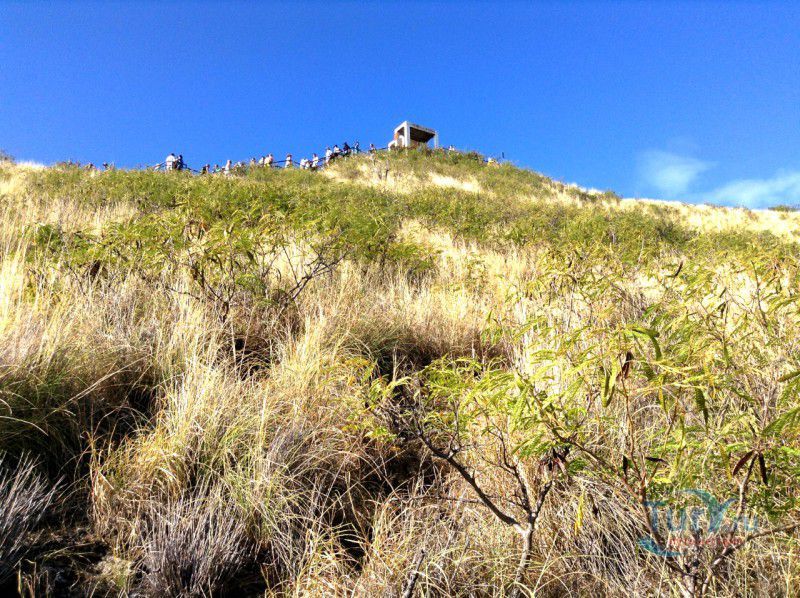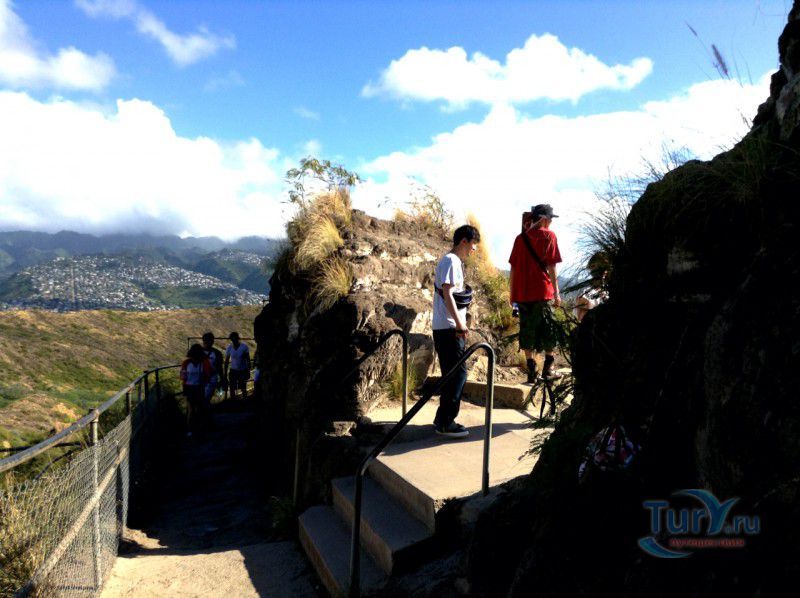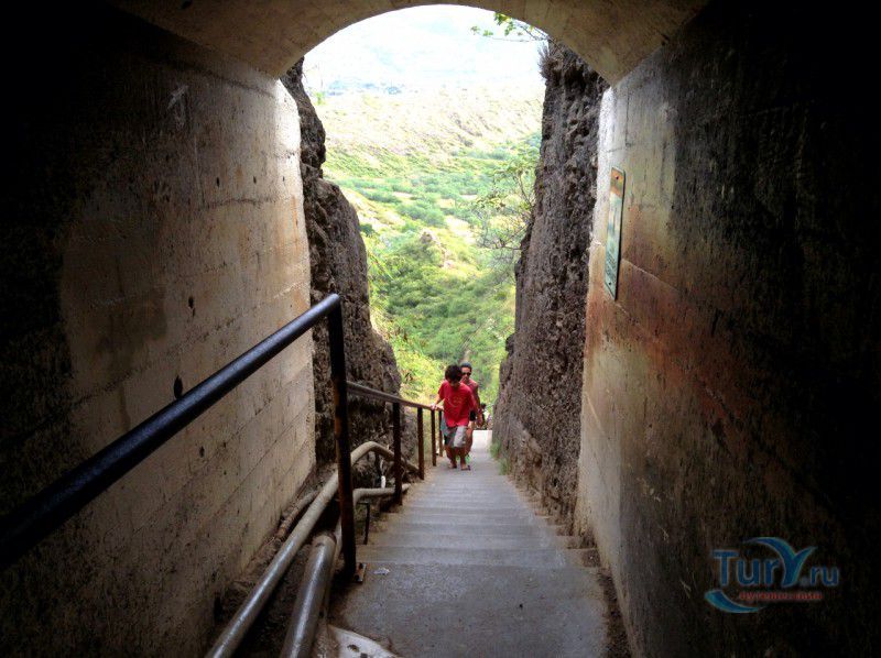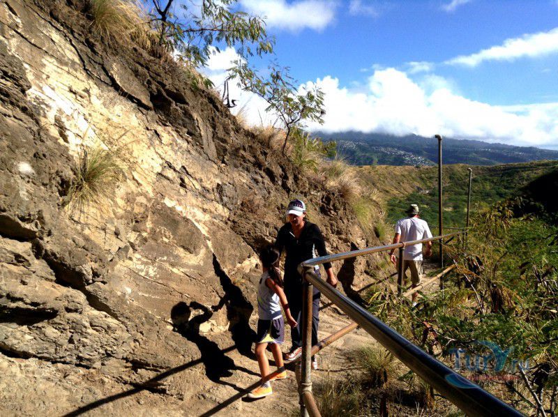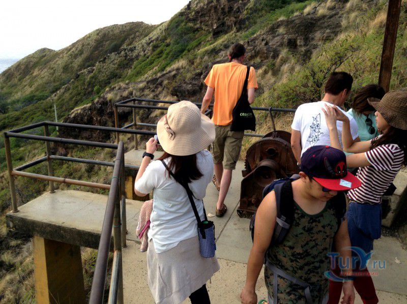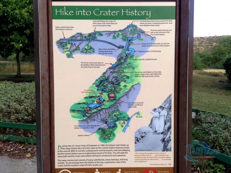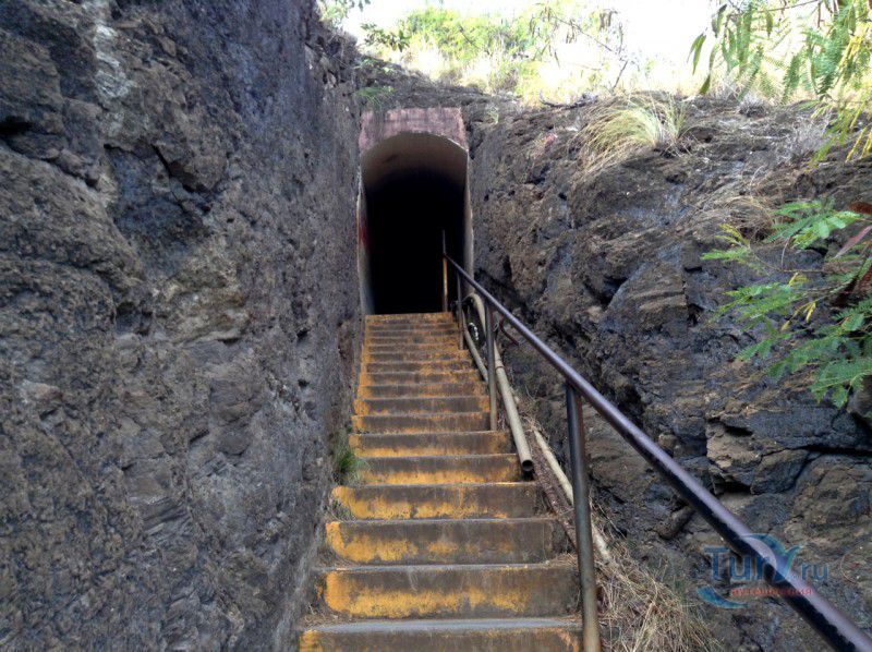 Тропа на вершину вулкана Lē'ahi была проложена в 1908 году как часть системы береговой обороны острова Оаху. Восхождение на гору идет вдоль хребта по змееобразному серпантину, далее внутри горы прорыт тоннель, пройдя через который, можно подняться по крутой лестнице в пульт управления огнем, который построен на вершине в 1911 году для защиты острова. Здесь же размещены бункеры и огромный навигационный маяк, построенный в 1917 году.